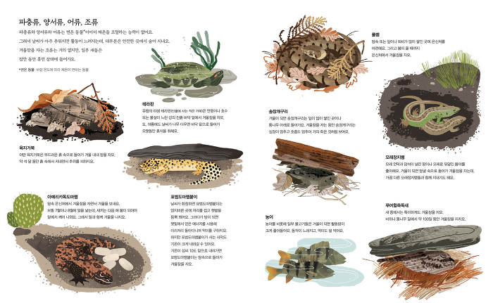 《아늑한 마법》은 단순한 그림책이 아니에요. 이 책의 뒤쪽에는 소년과 할머니를 통해 알게 된 겨울잠에 대한 정보가 그림과 함께 자세하고 알차게 담겨 있어요. 포유류에서 파충류, 양서류, 어류, 조류, 곤충 등 동물을 분류하여 동물들이 어떤 방식으로 겨울잠을 자는지 알려 주지요. 더불어 우리가 겨울잠을 자는 동물들을 위해 도움을 줄 수 있는 방법도 구체적으로 제시해 주고 있답니다.