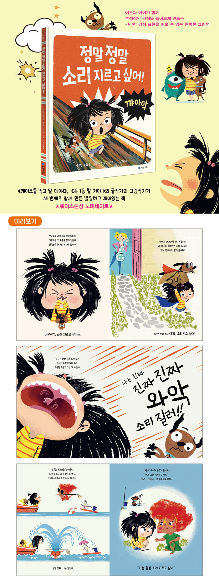 아이들도 마음이 답답하거나 화가 나는 감정을 느낍니다. 어른들과 마찬가지로요. 우리 모두 살면서 매일매일 다른 감정과 기분을 경험합니다. 예민한 감정을 재미나게 풀 수 있다면 얼마나 좋을까요? 의심할 여지 없이 『정말 정말 소리 지르고 싶어!』는 분노를 다루는 가장 좋은 그림책입니다. 책 속에서 분노를 일으킬 수 있는 사건, 감정을 악화시키는 상황, 화를 관리하는 방법, 그리고 화를 건강하게 표현하는 기술 등을 소개합니다. 운율을 살린 글을 읽다 보면 주인공의 심리에 금세 공감하게 될 거예요. 어린아이들에게 어려운 감정선을 더 쉽게 이야기할 수 있게 도와주지요. 거기에 익살스러운 표정의 그림이 더해져 독자들의 마음을 재치 있게 헤아립니다. 역동적인 그림은 말로 다 하지 못한 감정을 묘사하여 아이들의 공감을 이끕니다.