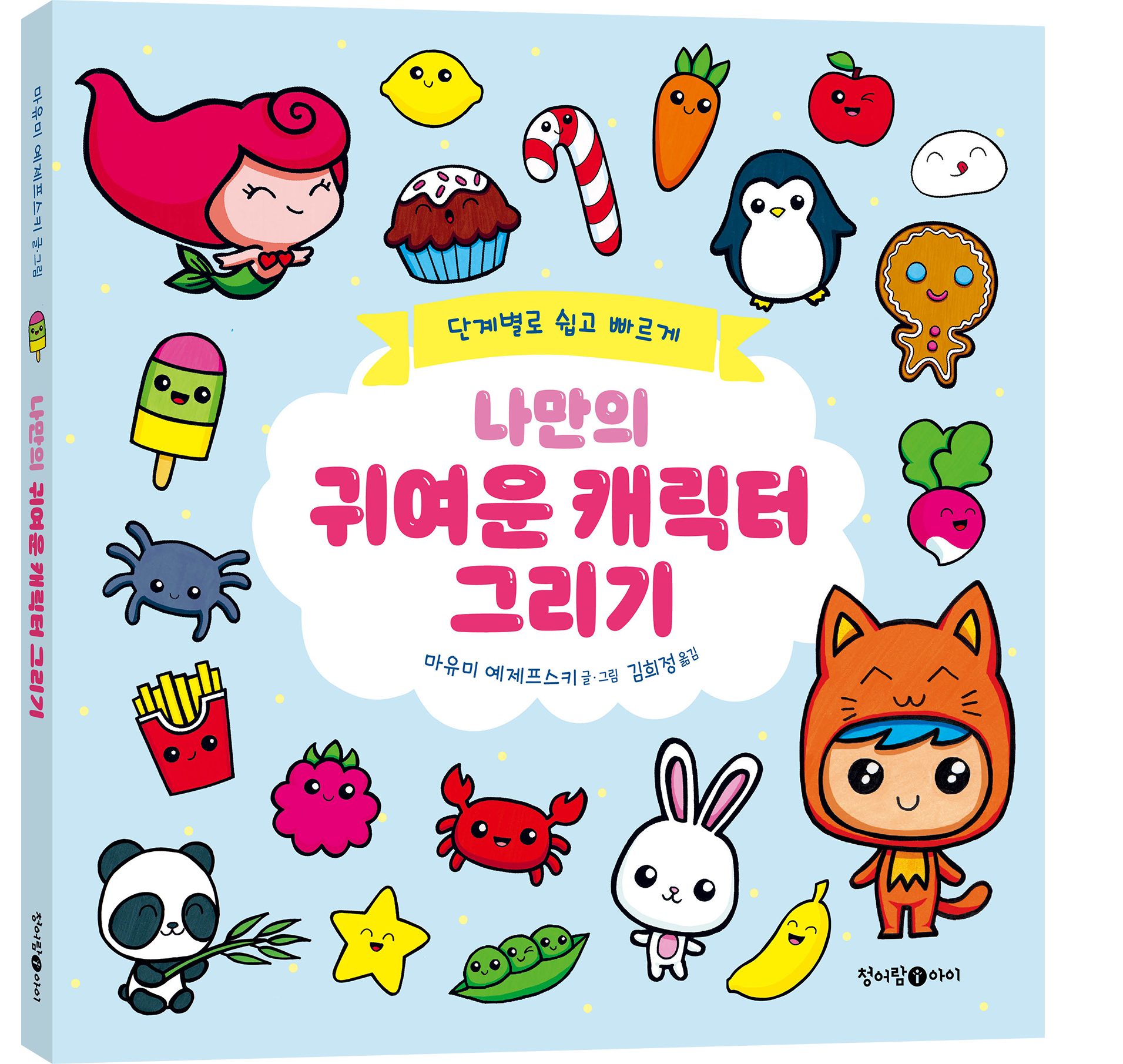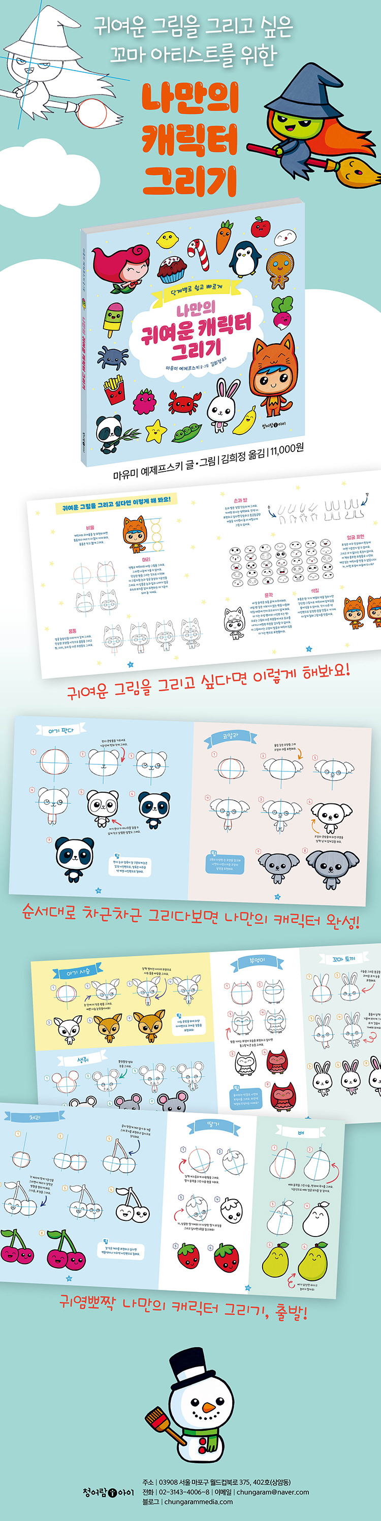책 속에는 아이들에게 친근한 고양이와 강아지 같은 깜찍한 동물부터 바닷속 동물들, 과일과 채소, 주먹밥과 햄버거, 아이스크림, 도넛 같은 음식들, 할로윈과 크리스마스를 기념하는 상징물까지 재미있고 사랑스러운 캐릭터들이 가득 담겨 있어요. 대상을 단순히 모양대로 따라 그리는 것이 아니라 다양한 표정을 짓고 행동하는 캐릭터로 표현하면서 상상력과 표현력을 키울 수 있답니다.