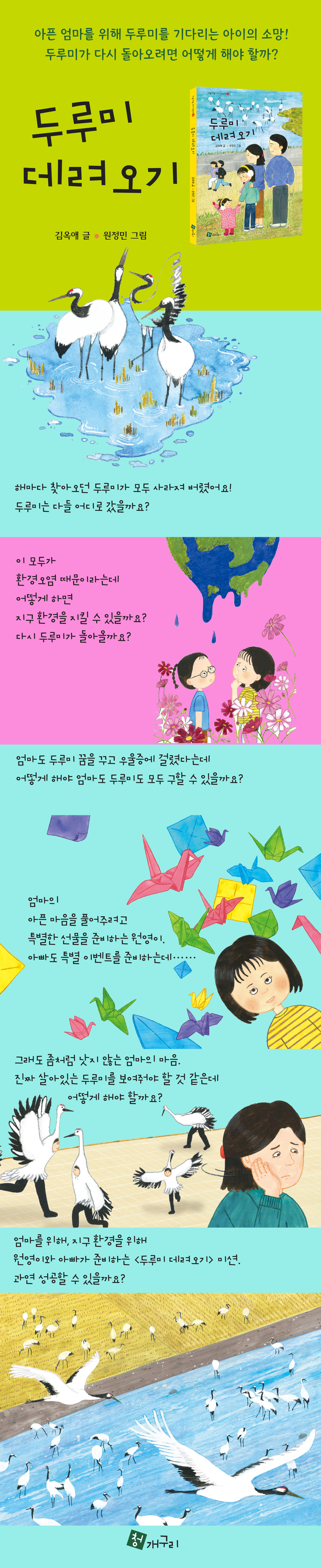 산후 우울증을 앓는 엄마를 위해 두루미가 돌아오길 기다리는 아이, 원영이의 <두루미 데려오기> 미션. 이를 통해 환경오염과 기후위기 문제를 다시금 깨닫는다. 그리고 두루미들이 돌아와 강에서 물고기 잡고 빈 들판에서 이삭도 주워 먹는 깨끗한 환경을 다시 되찾기 위해 실천하는 원영이와 아빠. 이 책은 어린이들에게 환경을 지키기 위해서는 스스로 나서서 무엇이든 해야 한다는 메시지를 전해 준다. 우리의 자연환경은 우리가 스스로 지켜야 하고, 그것이 모두가 함께 행복하게 살아가는 길이라는 것이다.