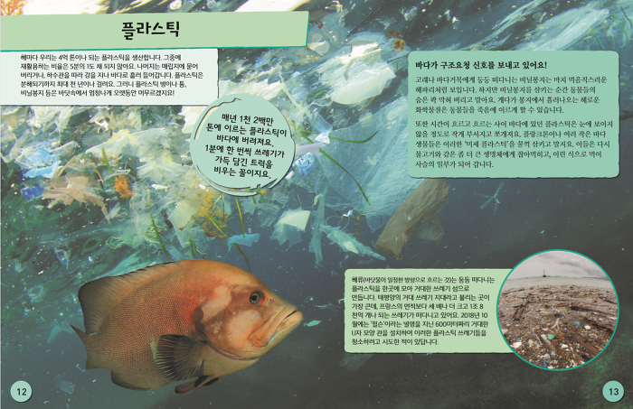 해마다 우리는 4억 톤이나 되는 플라스틱을 생산합니다. 그중에 재활용하는 비율은 5분의 1도 채 되지 않아요. 나머지는 매립지에 묻어 버리거나, 하수관을 따라 강을 지나 바다로 흘러 들어갑니다. 플라스틱은 분해되기까지 최대 천 년이나 걸려요. 그러니 플라스틱 병이나 통, 비닐봉지 등은 바닷속에서 엄청나게 오랫동안 머무르겠지요! 이제는 우리들이 행동에 나서야 할 때예요. 플라스틱과 종이, 유리, 고철, 직물, 음식 등을 요모조모 살펴보고 지구가 더는 쓰레기장이 되지 않도록 막을 방법을 찾아보아요.