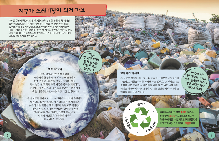 여러분 주변에 무엇이 보이나요? 플라스틱 장난감, 양말 한 짝, 버려진 종이 이런 물건들이 하나둘씩 쌓여 우리 지구를 쓰레기 더미로 만들고 있어요. 이렇게 우리가 만들고, 쓰고, 버리는 동안 지구는 점점 병들어 가요.