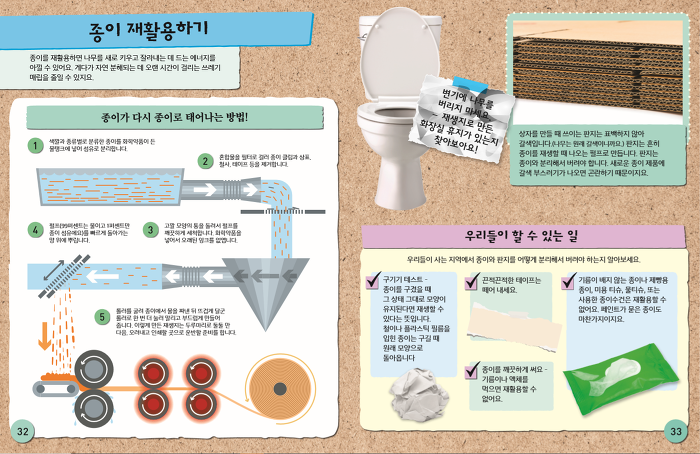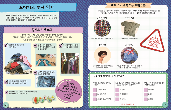이 책은 각 페이지마다 제품이 만들어지는 과정과 재활용 방법, 업사이클링 작품을 풍부한 일러스트와 사진으로 표현하여 어린이들이 쉽게 이해를 할 수 있도록 구성 되어 있습니다.