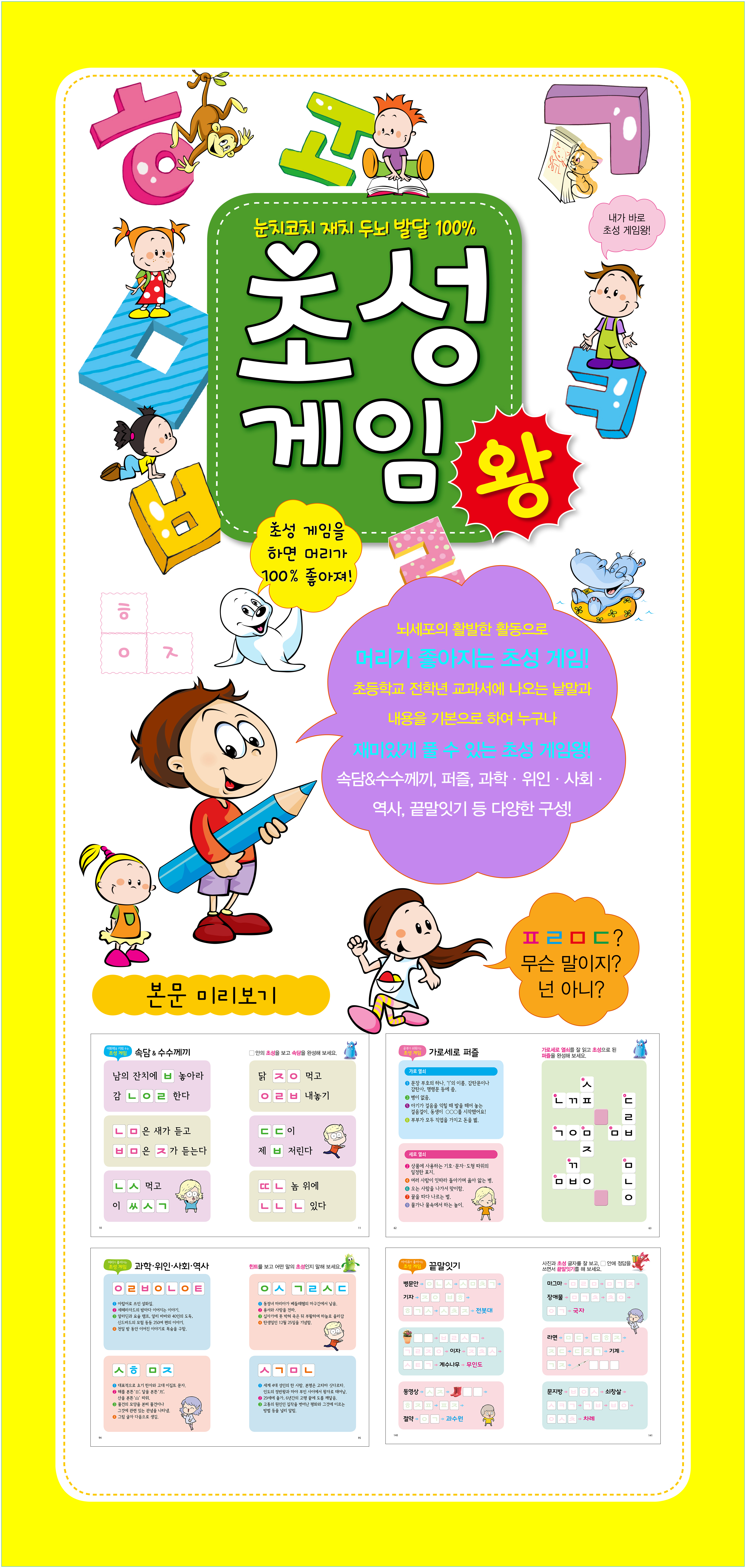 특히 이 책은 초등학교 전학년 교과서에 나오는 낱말과 내용을 기본으로 하여 초등학생이라면 누구나 쉽게 풀 수 있답니다. 더욱이 제1장 속담&수수께끼 초성 게임, 제2장 가로세로 퍼즐 초성 게임, 제3장 과학·위인·사회·역사 초성 게임, 제4장 끝말잇기 초성 게임 등으로 다양하게 구성되어 지루할 틈이 없지요.