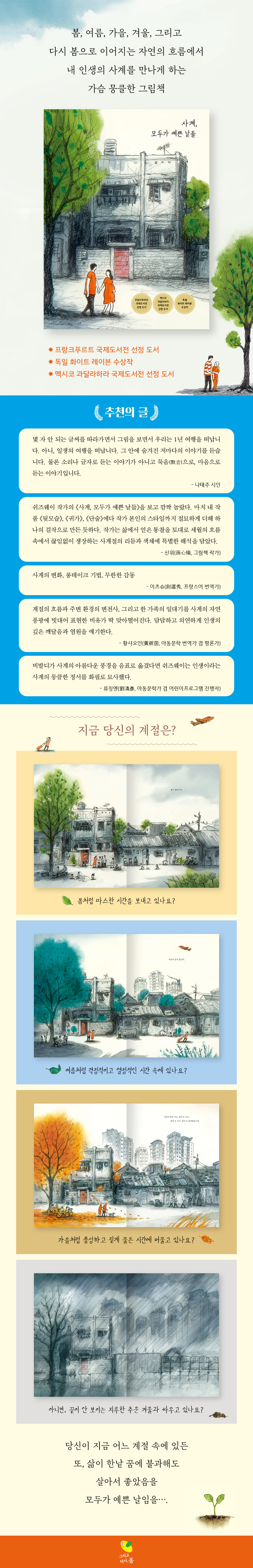 《사계, 모두가 예쁜 날들》은 절제된 글과 동일한 공간을 배경으로 조용한 시간의 흐름을 담아낸 것이 특징적인 그림책입니다. 이 책은 어느 작은 골목길에 찾아오는 봄과 여름, 가을, 겨울의 풍경을 통해 잠시 잊고 있었던 나의 아름다운 그 시절 속으로 시간 여행을 떠나게 합니다. 연둣빛 잎이 돋아나 짙은 녹음으로 변하고, 다시 황금빛으로 물들었다, 이내 사라지는 나뭇잎처럼 우리네 인생도 연둣빛 잎처럼 파릇파릇한 시기를 거쳐, 이별과 죽음이라는 시간을 만나게 됩니다. 흐르는 세월 앞에서는 나도, 나를 둘러싼 주변도 모두 변합니다. 가만히 책장을 넘기며 그 계절 나의 시간을 곱씹어 보거나 앞으로 올 날을 상상해 보세요. 그럼 어느 드라마 대사처럼 “삶이 때론 행복했고, 때론 불행했고, 삶이 한낱 꿈에 불과하다지만 그럼에도 살아서 좋았음을, 어느 하루 눈부시지 않은 날이 없었음을” 마음으로 느끼게 될 것입니다. 지금 또다시 우리를 찾아온 그 하루를 예쁘게 살아가길 응원합니다.