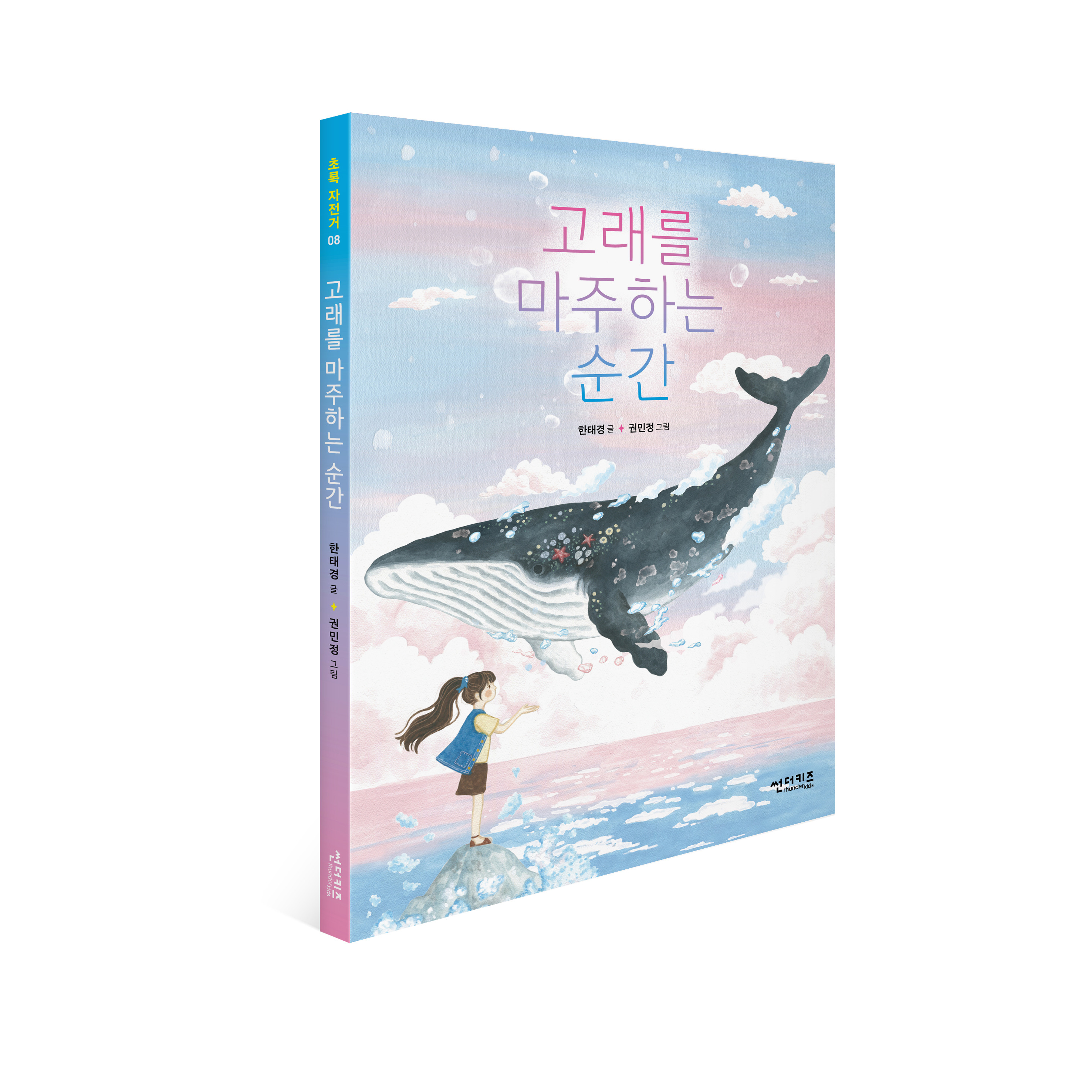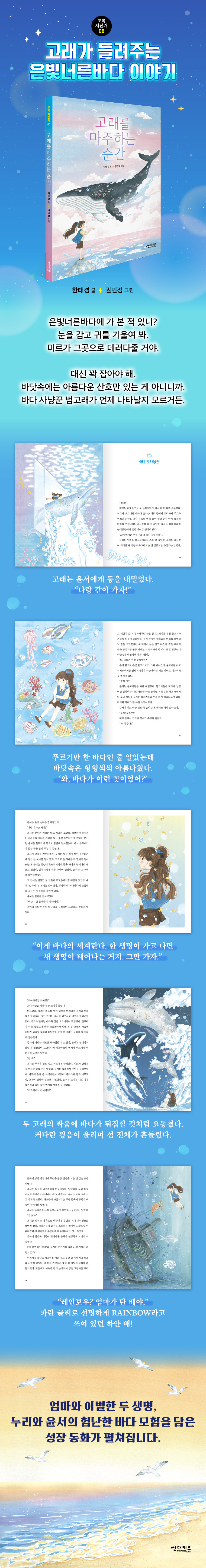 《고래를 마주하는 순간》은 엄마와 이별한 두 생명, 누리와 윤서의 성장 동화입니다. 작살잡이 배에 붙잡히는 바람에 새끼와 이별한 귀신고래 미르, 그리고 고래 탐사를 떠났다 배가 침몰하는 바람에 엄마와 이별한 윤서!