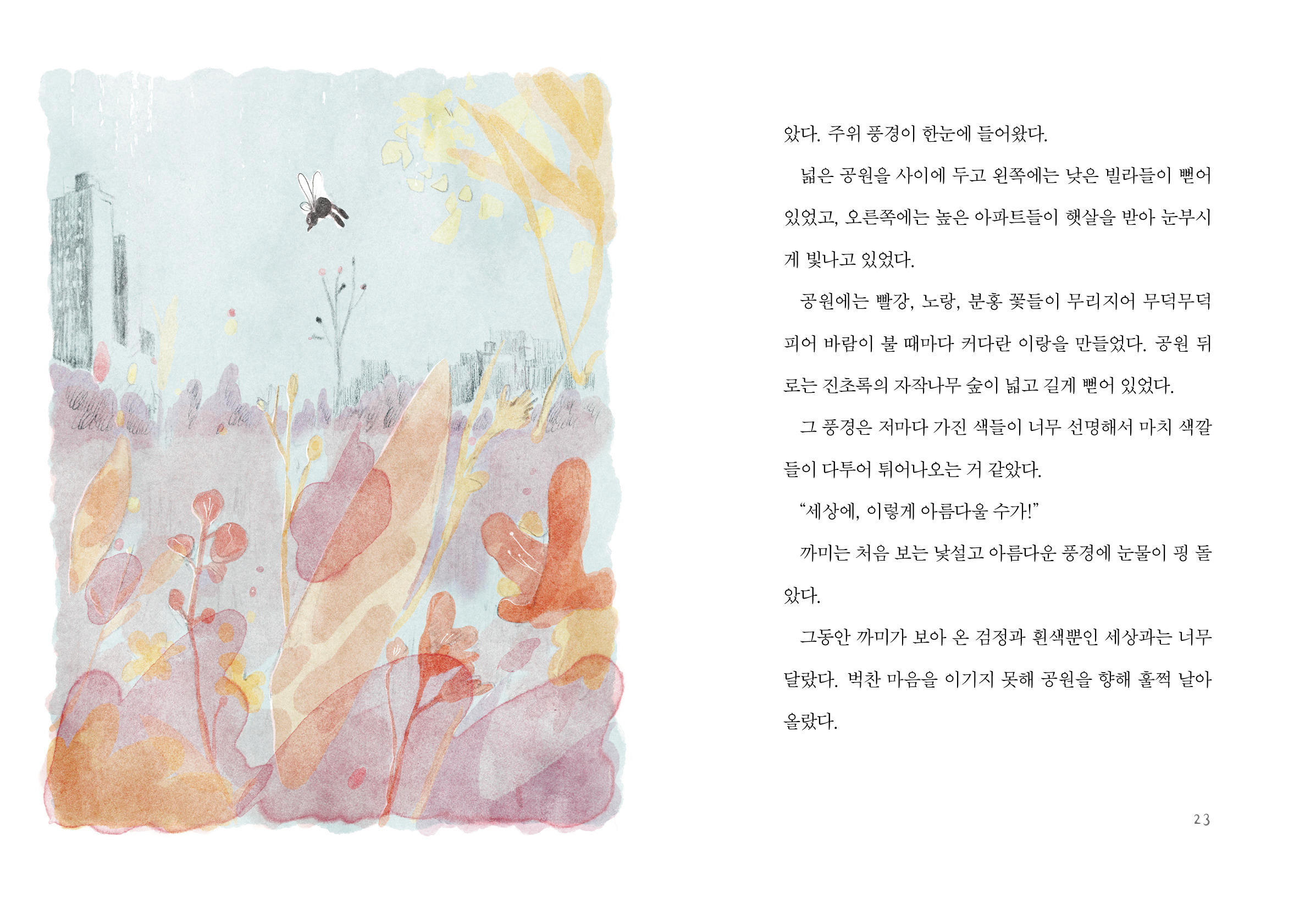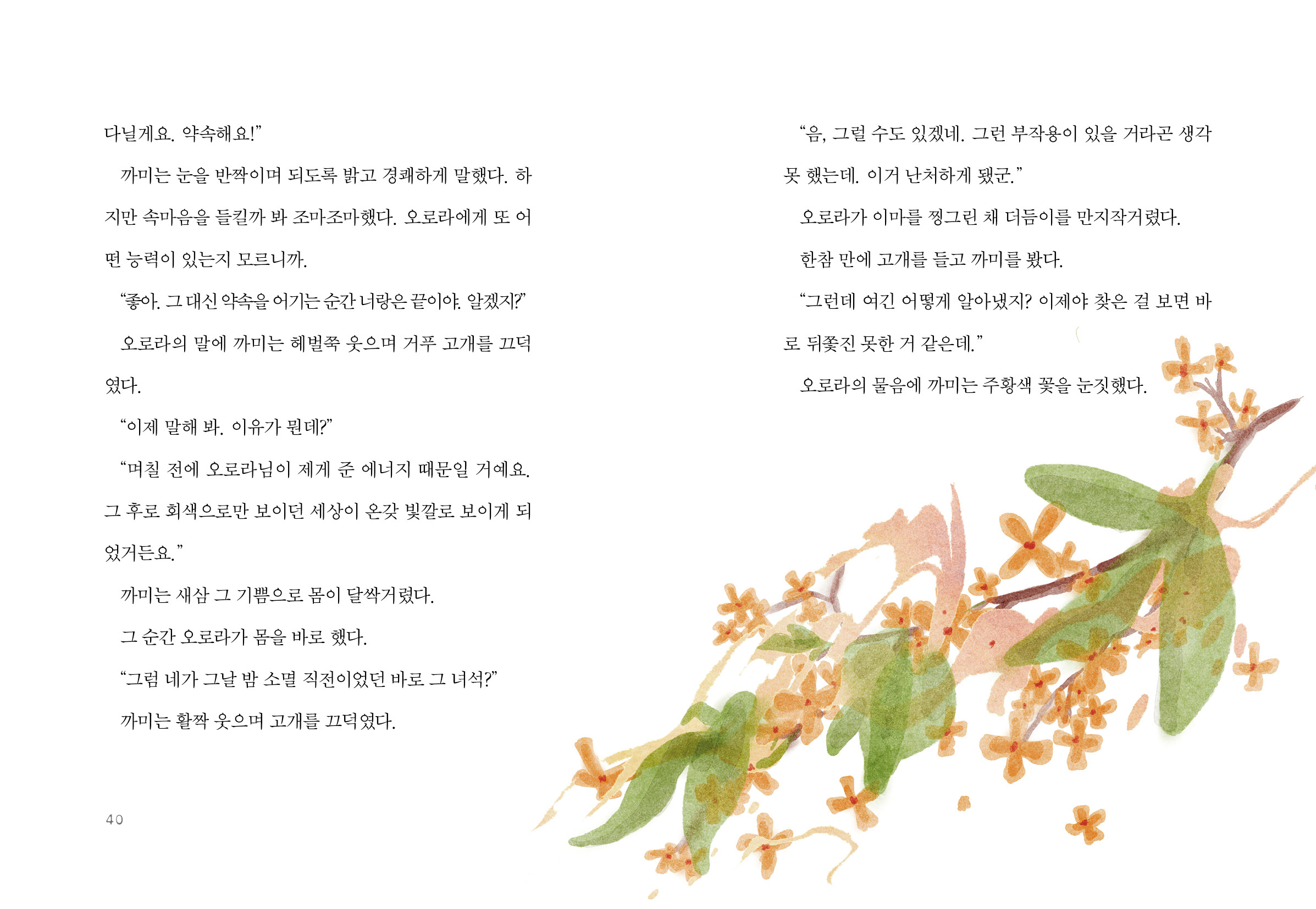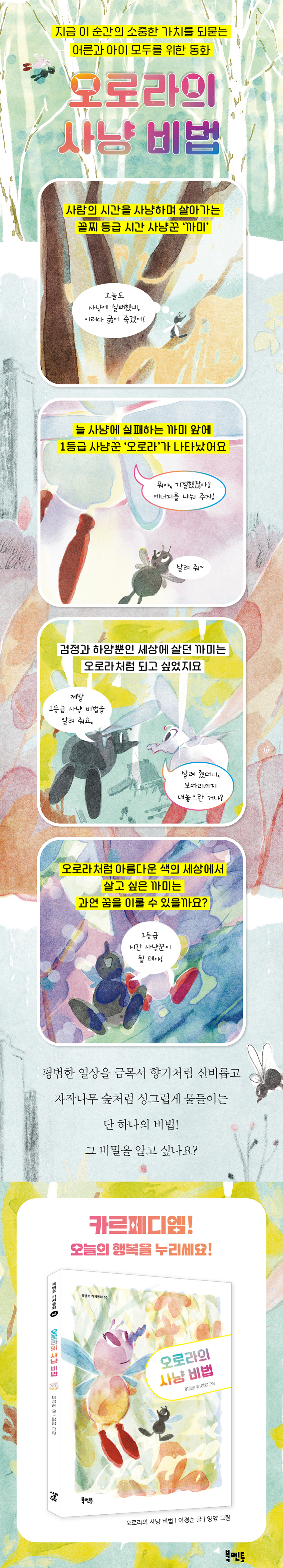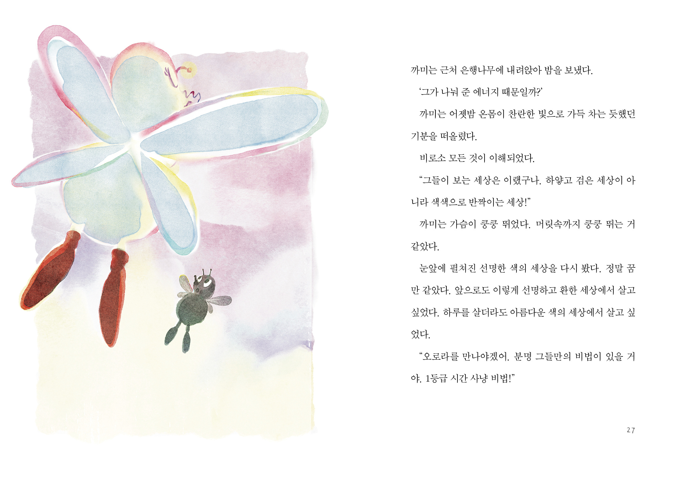 그 뒤 까미에게는 커다란 변화가 일어나요. 온통 검정과 하양밖에 색을 볼 수 없었던 까미가 찬란하게 아름다운 색깔들을 처음 보게 된 거예요. 그간 보지 못했던 꽃과 풀의 아름다움, 하늘과 호수와 산들의 색을 보게 된 까미는 다시는 흑백의 세상으로 돌아가고 싶지 않았어요. 그래서 오로라에게 1등급 시간 사냥 비법을 가르쳐 달라고 합니다. 하지만 결코 쉬운 길이 아니었어요. 과연 오로라만 알고 있다는 그 비법은 무엇일까요? 까미는 1등급 사냥 비법을 알아내 아름다운 색을 만끽하며 살 수 있을까요?