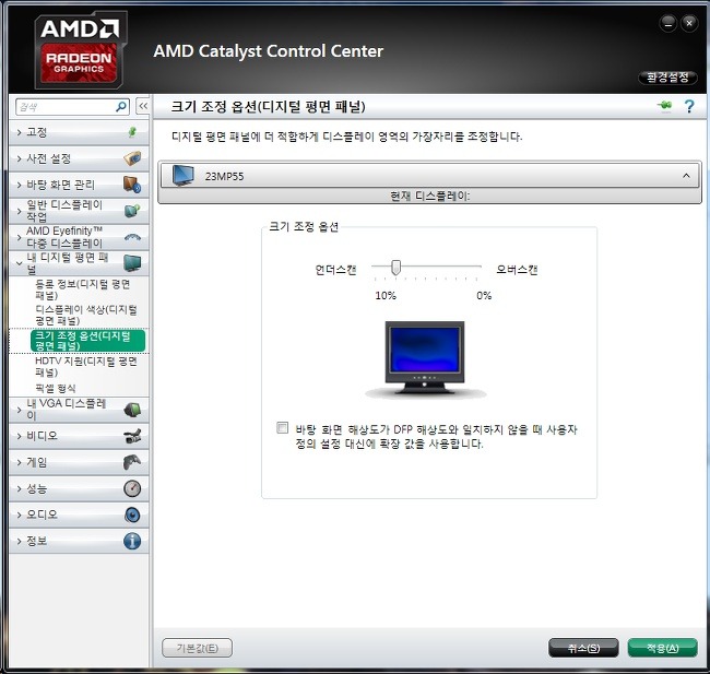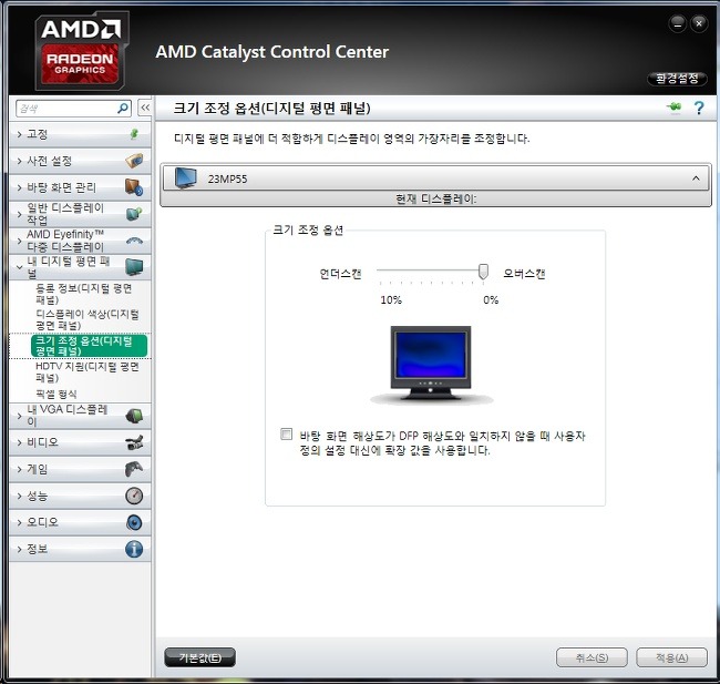언더스캔 상태였다면 아마도 슬라이드바의 막대기가 20% 정도로 치우쳐있을 것이다.