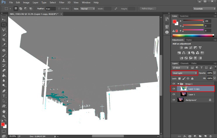 그룹으로 묶인 두 복제 레이어 중, 상단 레이어의 블렌드 모드를 Vivid Light 로 설정하고