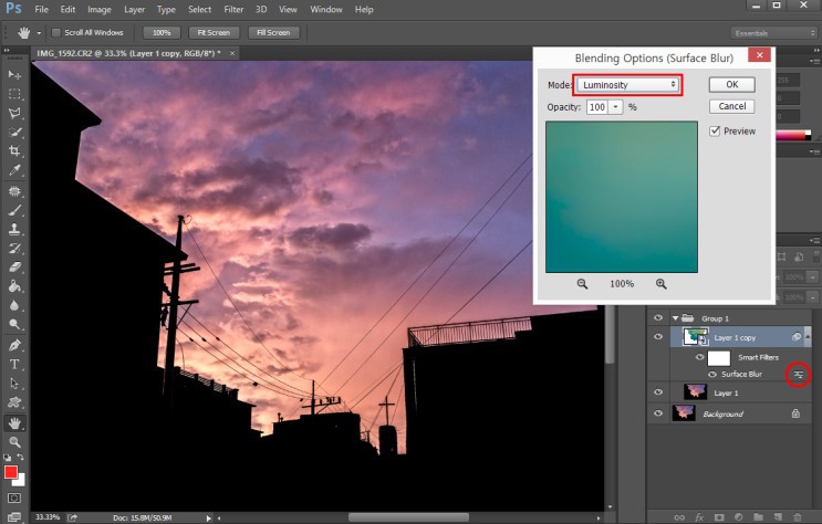 2-7 적용된 Surface Blur 필터의 블렌드모드를 Luminosity 로 변경하여 색상 변형을 막습니다.