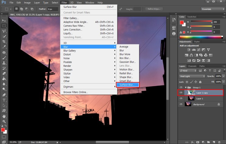2-5 변환된 스마트 오브젝트를 선택하고 Filter 메뉴 > Blur > Surface Blur 항목을 클릭 합니다.