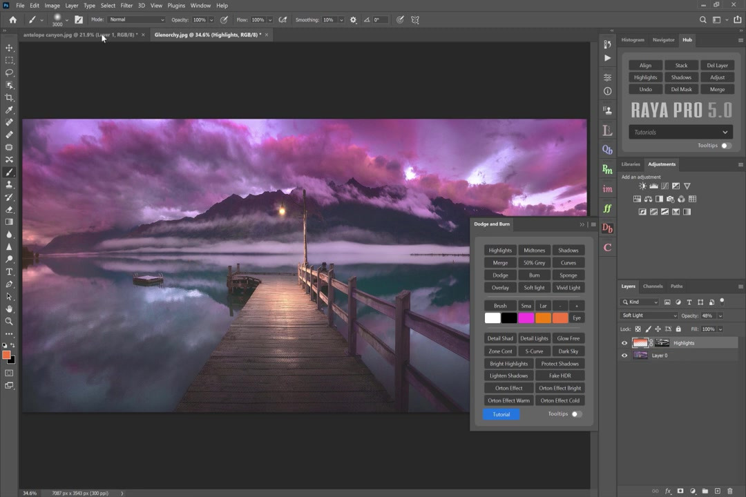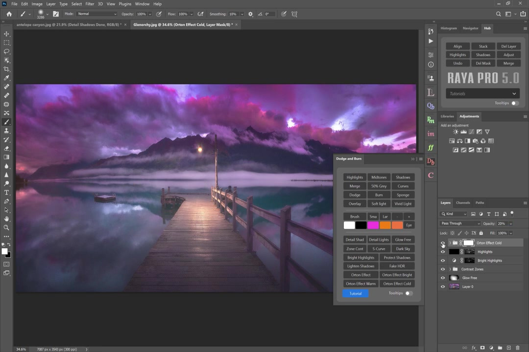 Raya Pro의 Dodge and Burn 패널은 하이라이트, 미드톤, 섀도우 영역을 비파괴적으로 보정하고, 디테일 강화, 글로우 효과, 존 대비, Orton (오턴) 효과 등 다양한 기능을 제공합니다.