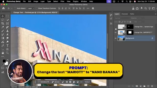 - 간판의 텍스트를 선택하고 새로운 텍스트(예: Marriott를 Nano Banana로)를 입력하면, 원본의 스타일과 글꼴을 유지하면서 텍스트를 변경할 수 있다.