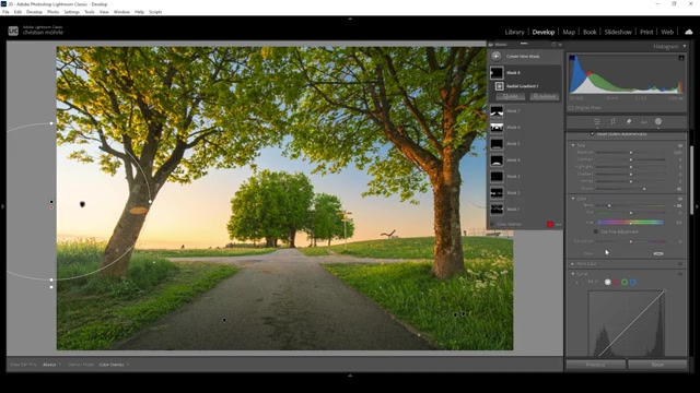 - 마스킹 보정: 풍경 마스크를 사용하여 하늘, 도로, 나무, 자연 지면 등 특정 영역을 선택하고, 각 영역에 맞는 노출, 색상, 대비 등을 조정합니다. 44
