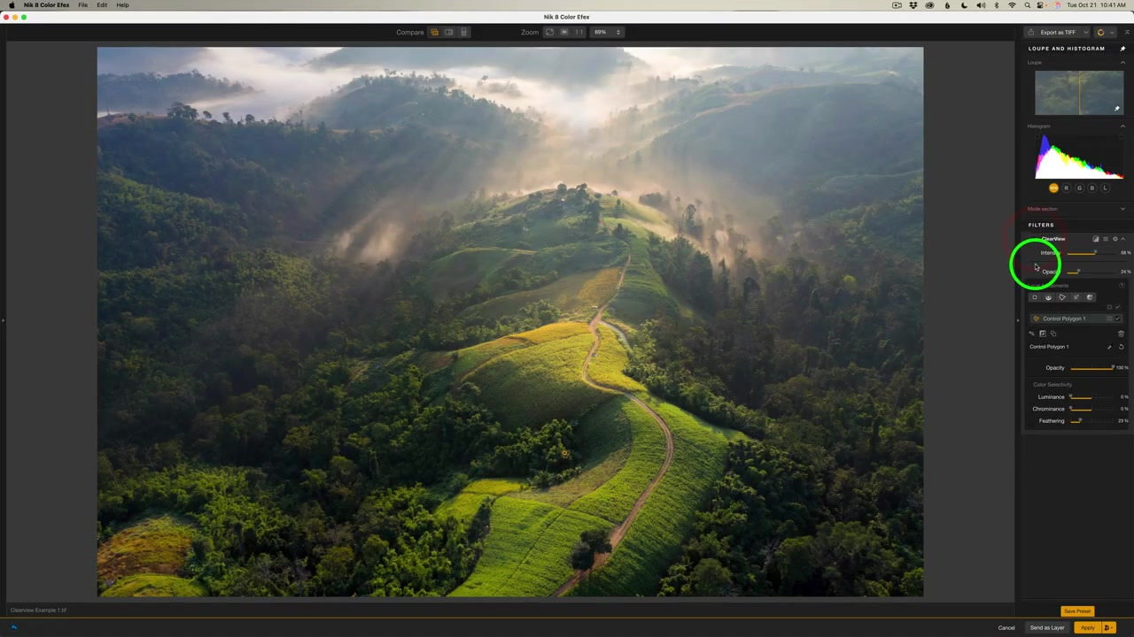 1. 특정 영역의 안개 감소- 안개가 많은 영역의 안개를 줄이기 위해 ClearView 필터의 강도(Intensity) 슬라이더를 사용한다.