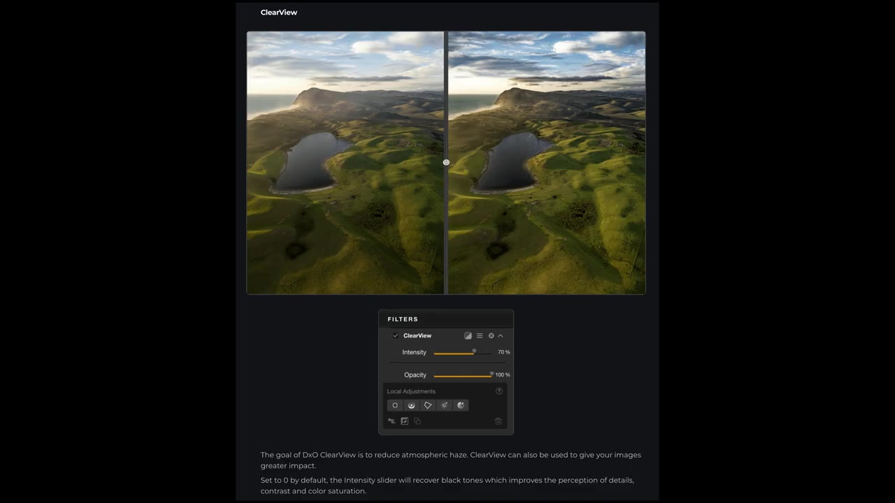 1. 기존 기능과의 차별점- 일반적인 Dehaze 또는 Clarity 슬라이더와 달리, ClearView는 단순히 그림자를 어둡게 하거나 전역 대비를 높이지 않는다.
