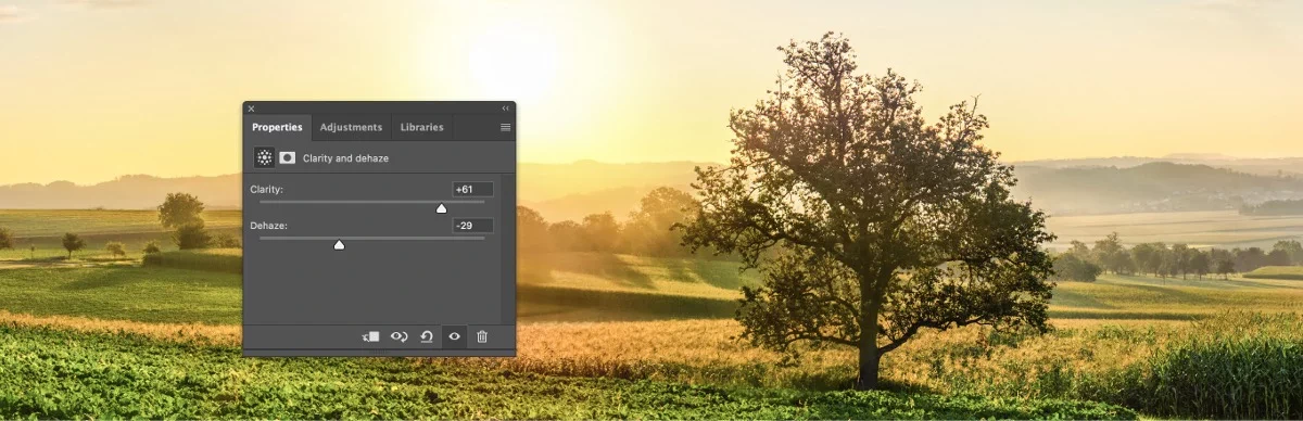1. 선명도 및 디헤이즈로 대비 조정 Adjust contrast with Clarity and dehaze 마지막 업데이트 날짜 2026년 1월 27일 Adobe Photoshop의 Ciarity (선명도) 및 Dehaze (디헤이즈) 조정 레이어를 사용하여 비파괴적으로 중간 영역 대비를 조정하고 안개를 줄입니다. 1. 파일 > Open (열기)를 선택하여 이미지를 찾아보고 선택합니다. 2. 레이어 패널에서 새 Create new fill or Adjustment laye 선택 한 다음 Clarity and Dehaze 선명도 및 디헤이즈 3. 속성 패널에서 이 슬라이더를 이동하여 이미지 구조를 개선하고 안개를 줄이세요. - Clarity (선명도): 중간 영역 대비를 조정하고 이미지에 선명도를 추가합니다. - Dehaze (디헤이즈): 안개를 조정하고 대비를 개선합니다. 4. 레이어 이름을 지정하고 레이어 옵션을 설정한 다음 Enter키를 누릅니다. |