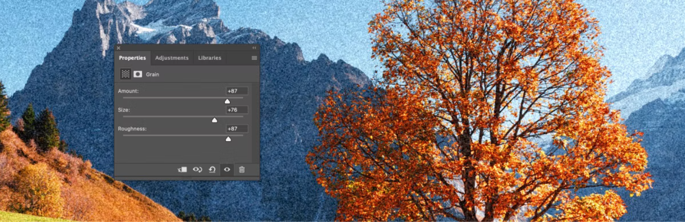 2. Adjust texture with Grain Grain으로 질감을 조절 최종 업데이트일: 2026년 1월 27일 Adobe Photoshop의 그레인 조정 레이어를 사용하여 이미지에 그레인을 비파괴적으로 추가하세요. 1. 파일 > 열기를 선택하여 이미지를 찾아 선택하세요. 2. 레이어 패널 에서 Create new fill or adjustment layer에서 Grain을 선택 합니다. 3. 속성 패널 에서 이 슬라이더를 움직여 Grain을 조정하세요. a) Amount (양) : Grain의 전체적인 강도를 조절합니다. b) Size (크기) : 개별 Grain 입자의 크기를 조절합니다. c) Roughness (거칠기) : Grain의 무작위성을 조절하여 더 부드럽거나 거친 느낌을 연출합니다. 눈 덮인 산, 가을 나무, 풀이 무성한 언덕으로 이루어진 풍경 사진에 그레인(Grine) 조정 레이어 속성 패널을 적용한 모습입니다. 양(Amount), 크기(Size), 거칠기(Roughness) 슬라이더가 모두 높은 값으로 설정되어 있습니다. 포토샵의 그레인 조정 레이어를 사용하여 이미지의 질감을 조정하고 필름 같은 효과를 추가하세요. 4. 레이어 이름을 지정하고 레이어 옵션을 설정한 다음 Enter 키를 누르십시오. |