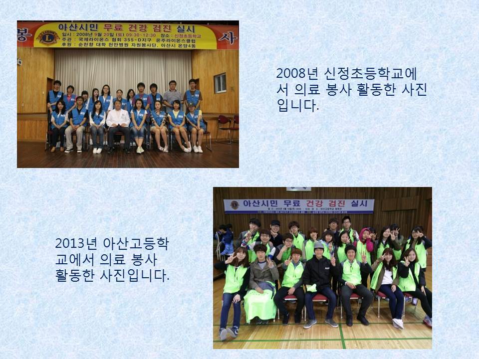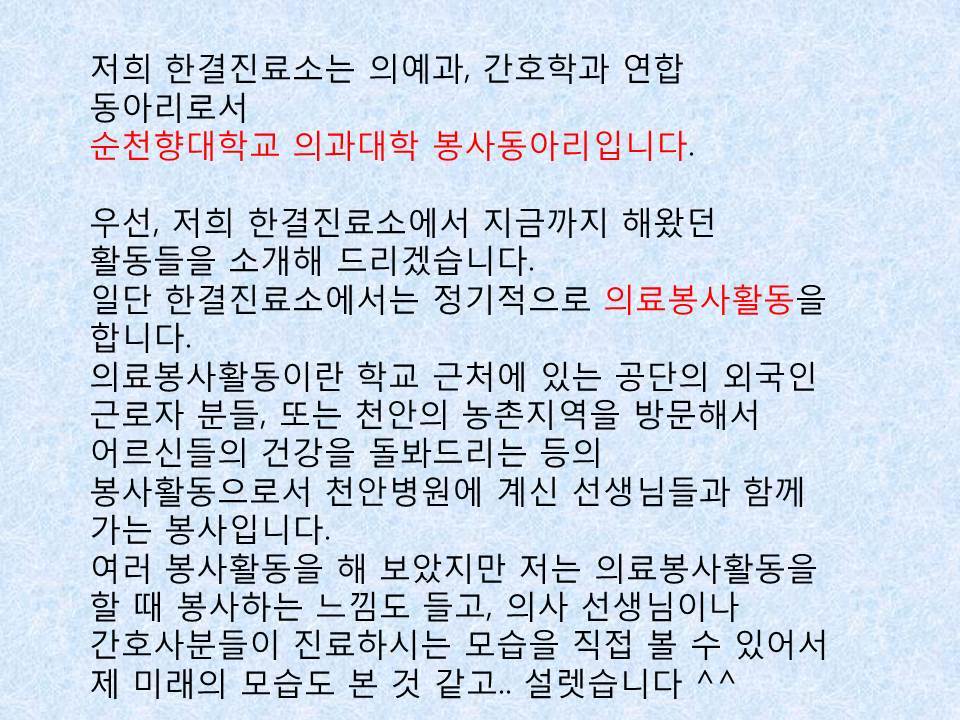 안녕하세요~! 순천향대학교 의과대학[의예,간호] 봉사동아리 한결진료소를 소개합니다^^ 작성자13배진성|작성시간14.02.05|조회수1,453 목록 댓글 12 글자크기 작게가 글자크기 크게가 다음검색 현재 게시글 추가 기능 열기 북마크 공유하기 신고 센터로 신고 댓글 댓글 12 댓글쓰기 답글쓰기 댓글 리스트 작성자이나래 | 작성시간 14.02.05 4등한결 짱짱^0^ 작성자12장소영 | 작성시간 14.02.05 아름다운 인연ㅋㅋㅋㅋㅋㅋㅋㅋㅋㅋ 한결 좋아요♥ 작성자13유중완 | 작성시간 14.02.06 내가진짜 여럿 살렸다 ㅎㅎㅎㅎㅎ 잘만들었당 ㅎㅎ 작성자13이록 | 작성시간 14.02.06 한결 짱짱짜아아앙 봉사하면서 선배들이랑 친해질 수 있어요!! 작성자12안유영 | 작성시간 14.02.09 한결♥.♥ 댓글 전체보기