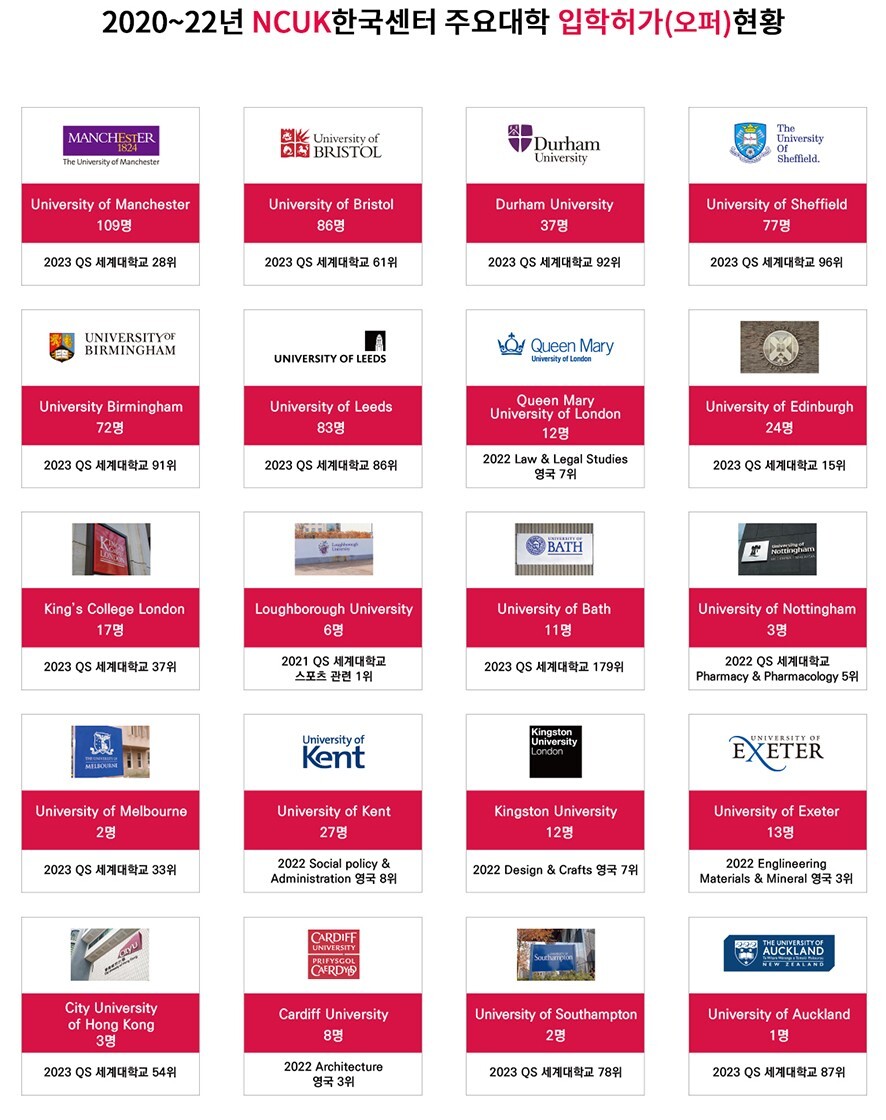 IEN의 NCUK 파운데이션 과정은 영국대학교 지원을 타 파운데이션과정에 비해 빨리 하기 때문에 영국대학교 입학허가(Offer)를 빨리 받을 수 있습니다. 또한 과정을 마친 후에도 시간적 여유가 있기 때문에 최족 성적이 희망 대학교 입학 기준에 미달 될 경우 재시험 기회를 통해 이를 만회할 수 있습니다.