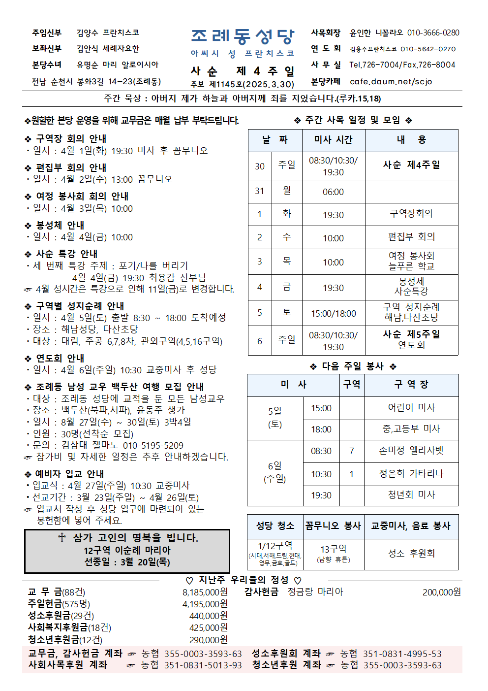 사순 제4주일 (25.3.30) 본당주보 작성자착칸 왕비|작성시간25.03.28|조회수182 목록 댓글 0 글자크기 작게가 글자크기 크게가 다음검색 현재 게시글 추가 기능 열기 북마크 공유하기 신고 센터로 신고 댓글 댓글 0 댓글쓰기 답글쓰기 댓글 리스트