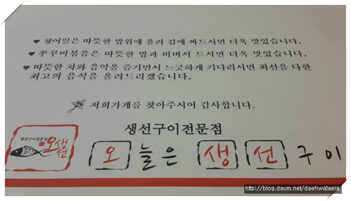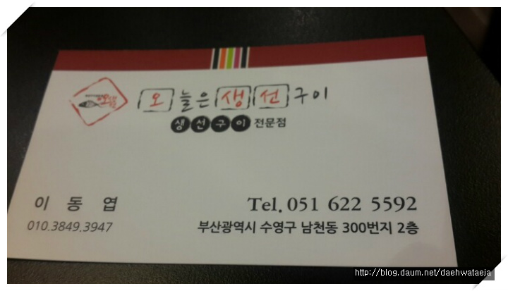 01 상호 오생선(오늘은생선구이) 02 전화 번호 051-622-5592 03 위치 부산 수영구 남천동 300번지 2층,한나여성병원 앞 골목 04 휴무일 매주 2,4주 일요일 05 영업시간 오전 11 시 ~ 저녁/밤 21시까지 06 크레디트 카드 YES 07 주차장 한나여성병원앞 1시간 무료주차 08 비 고
