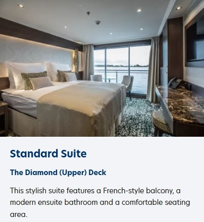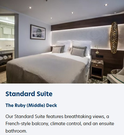 | 참조사항 • 크루즈 선박에는 표준 2핀 원형 유럽식 플러그 소켓이 설치되어 있으니 적절한 어댑터 지참하셔야 합니다. • 크루즈 내 통화는 유로이며 Visa, MasterCard, Maestro 신용카드를 사용하실 수 있습니다. • 정장은 필수가 아니며, 매일 스마트한 캐주얼 복장으로 오시면 됩니다. 별도의 복장 규정은 없습니다. 단, 남성분들은 저녁 식사 시 반바지나 조끼를 착용하실 수 없으며 재킷과 넥타이를 착용하실 수 있습니다. 셰프 디너에서는 본인이 원하시는 경우, 더욱 특별한 복장을 선택하실 수 있습니다. • 예약 당시 사정에 의해 선실룸이 변경될 경우 가격 변동이 있습니다 ※ 대체 선실룸: The Diamond (Upper) Deck Stern Superior Suite 400파운드(+) The Ruby (Middle) Deck Standard Suite 200파운드(-) |