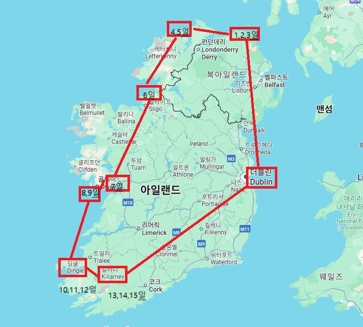 | 제15일 | 킬라니 더블린 | 기차 전용차량 | - 호텔 조식 후 - 킬라니 역으로 이동하여(1시간 소요) - 킬라니 역에서 기차를 타고 더블린으로 이동 - 더블린 시내투어 젊음의 거리 템플바 아일랜드를 대표하는 흑맥주 양조장인 기네스스토어 등 - 호텔 체크인 후 휴식 호텔: 4성급 조식: 호텔식 중식: 현지식 석식: 현지식/호텔식 |