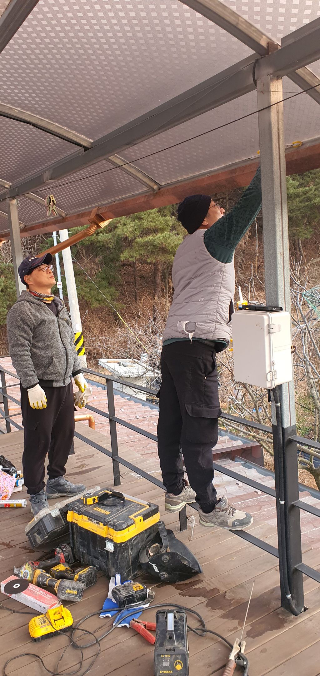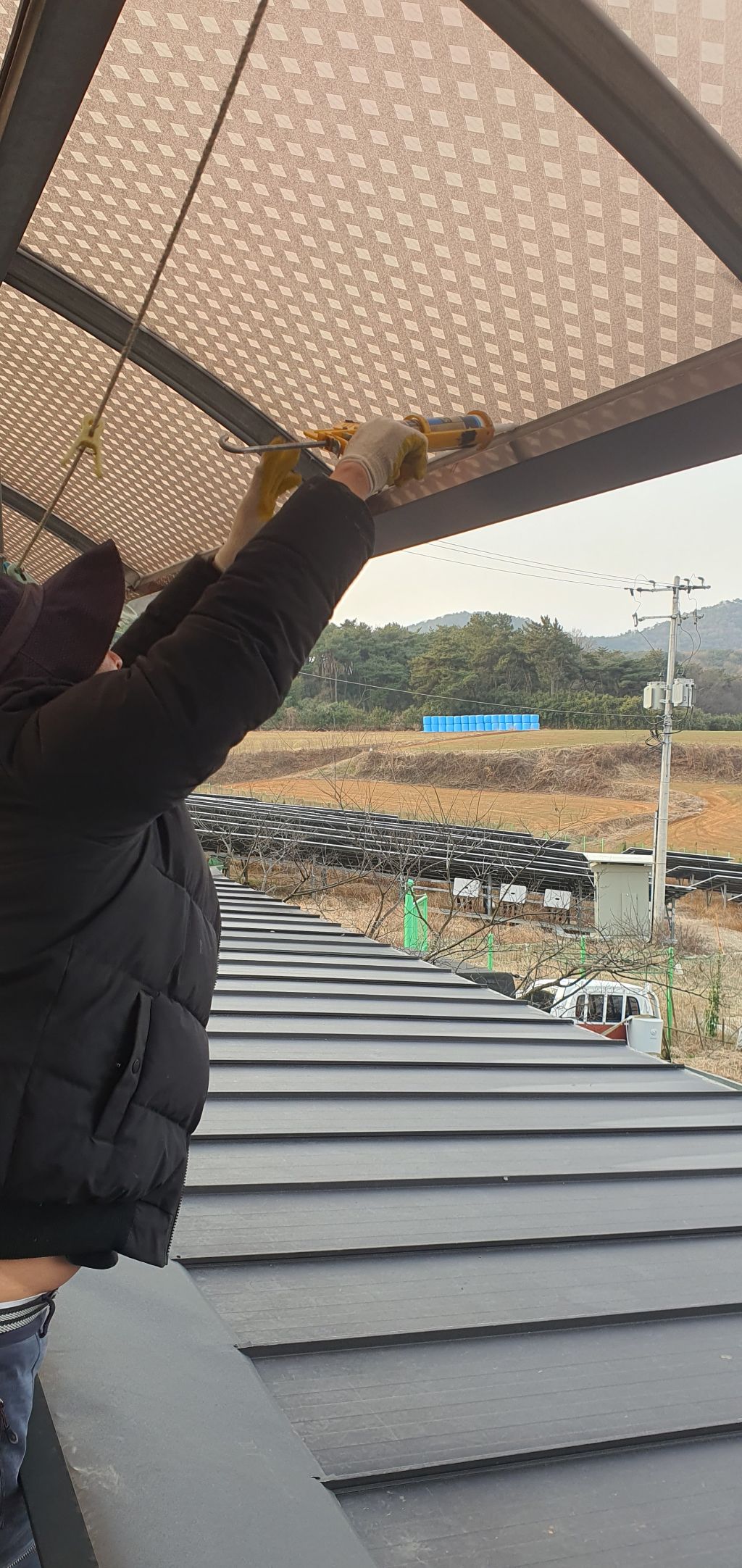 높이가 높아서 상당히 위험하고 바람이 많이 불어서 실리콘도 많이 쏘고 피스도 많이 쏴서 안전하게 일을 마무리합니다