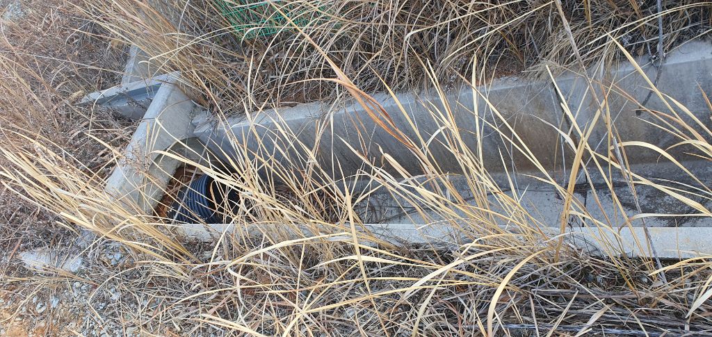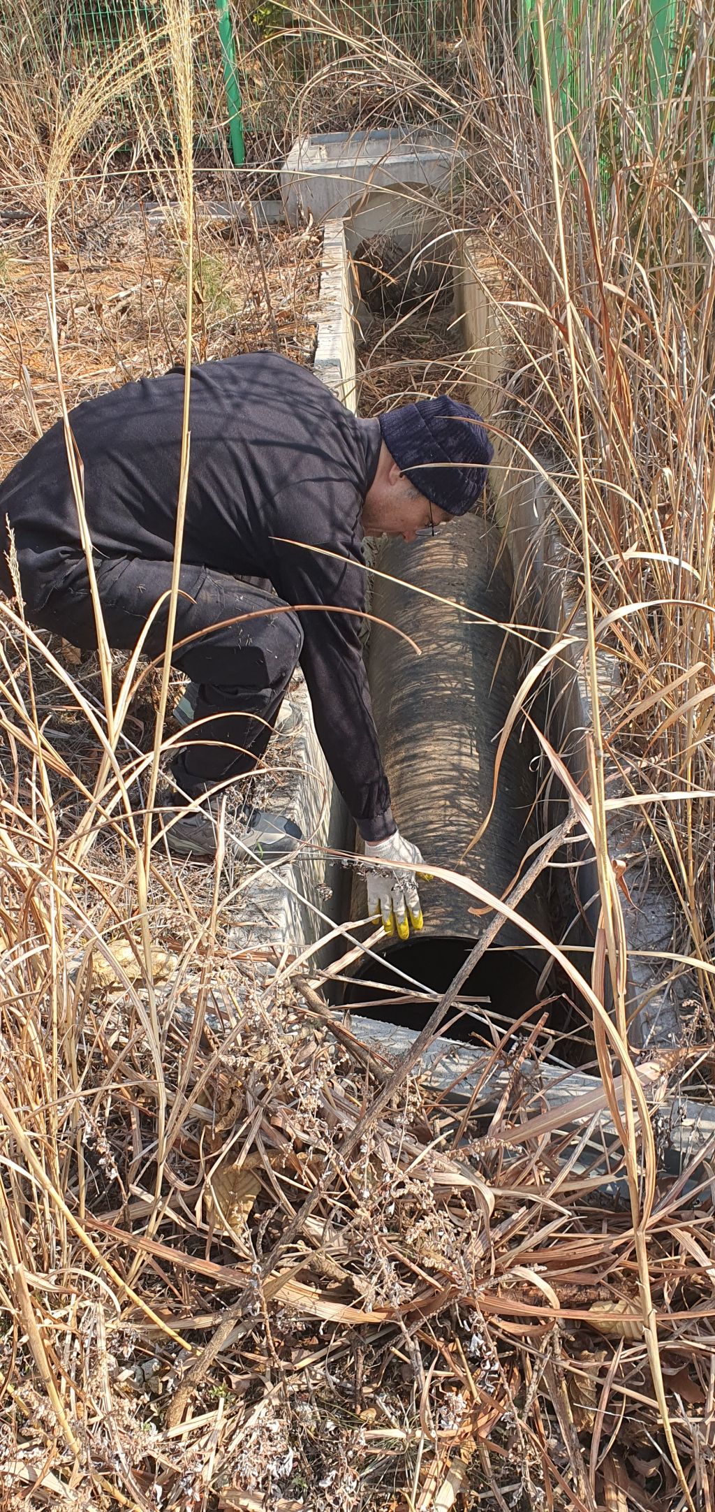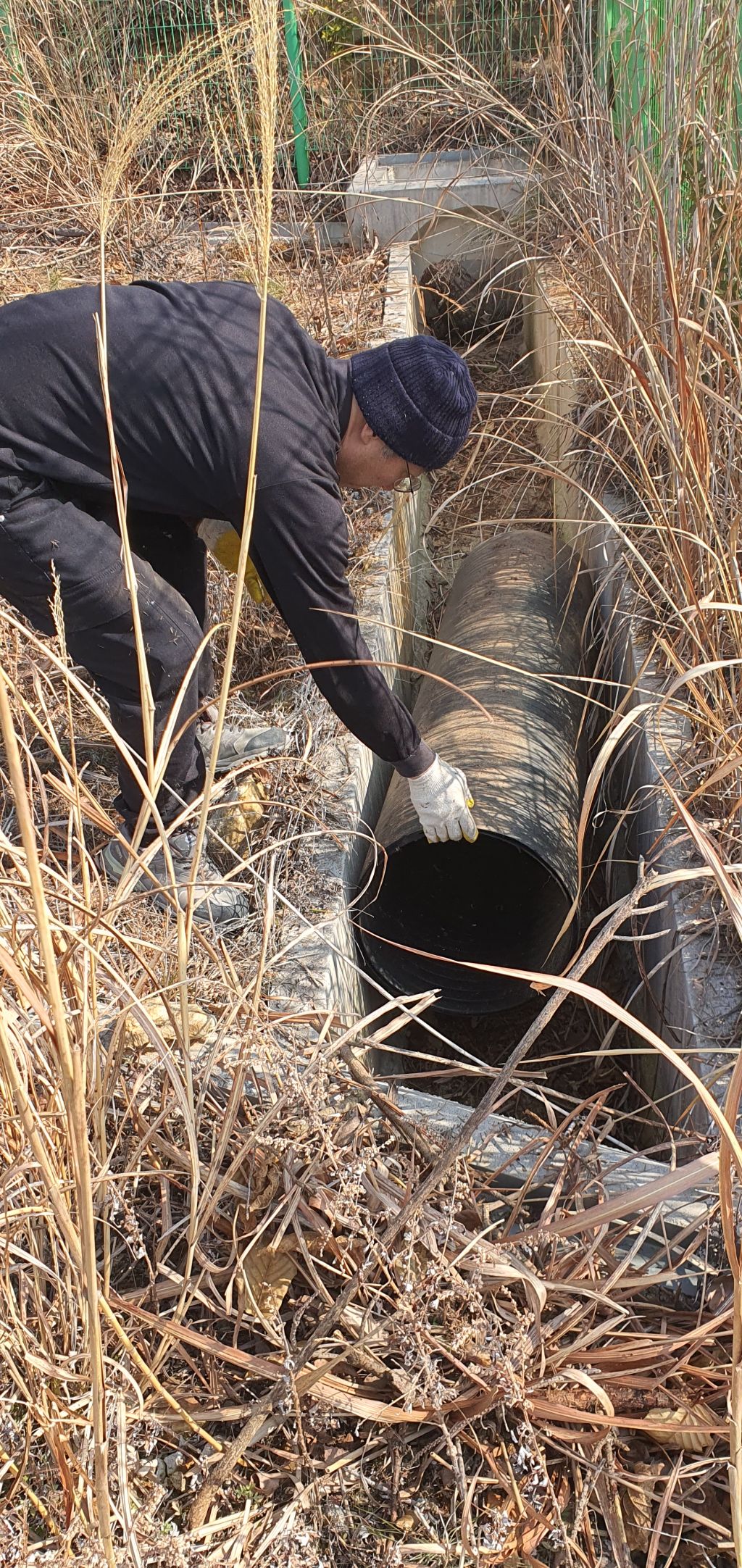 가을에 낙엽과 토사 유출 가을 장마 등으로 토사 유출이 많은 배수로 보수공사입니다