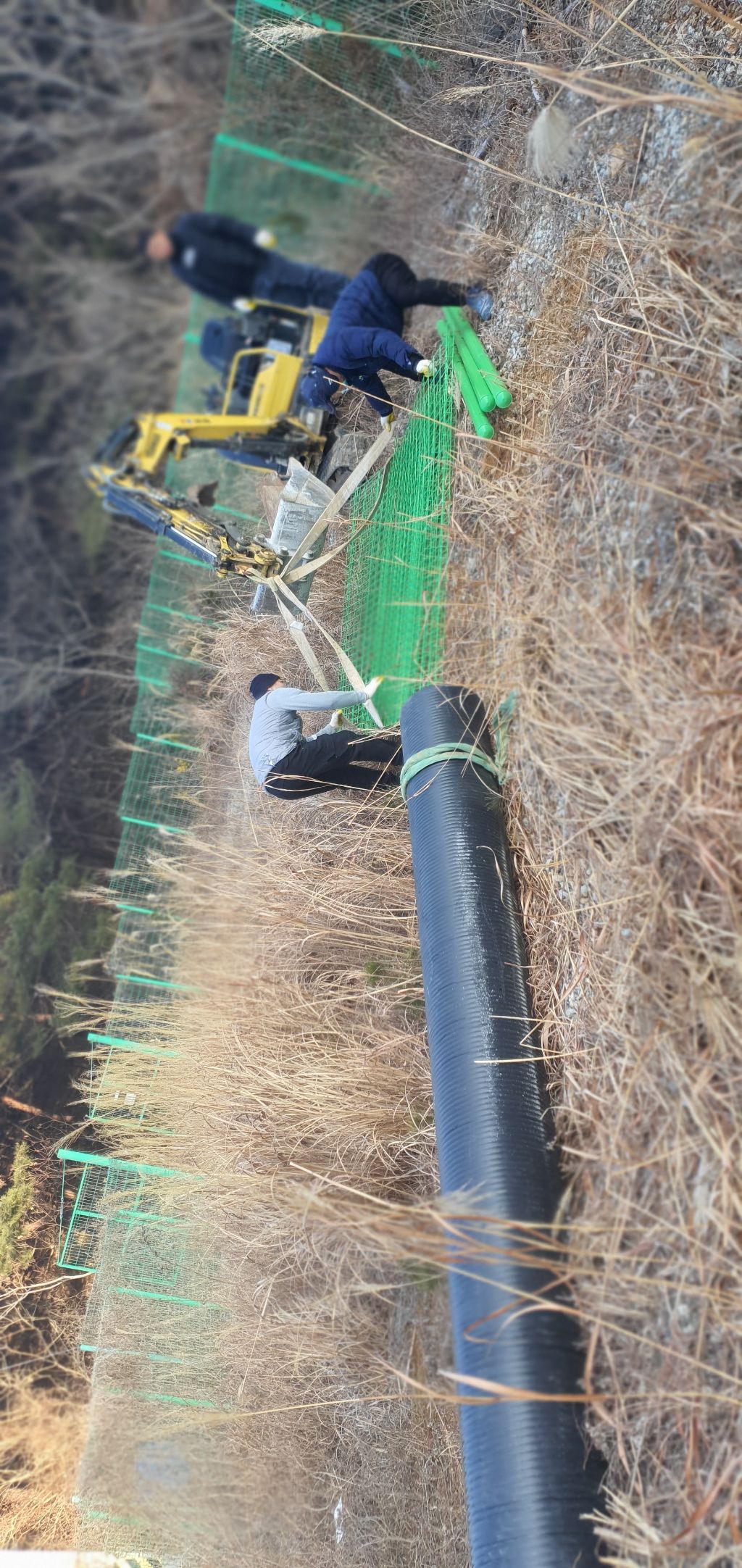 450파이 관로로 엘보와 연결하여 코너를 돌아가는 물기를 자유롭게 터 주고 위쪽에 재생석을 깔아서 덤프트럭이 지나다녀도 괜찮을만큼 시공할 예정입니다
