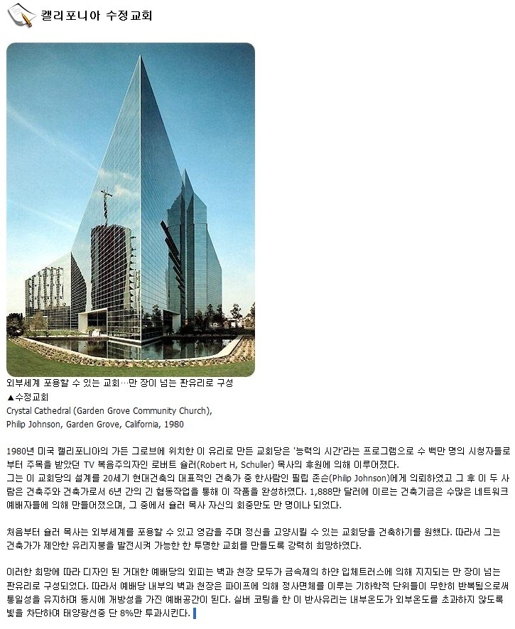 적극적인 사고 방식으로 유명한 로버트 슐러 목사의 캘리포니아 가든 그로브 크리스탈(수정) 교회...