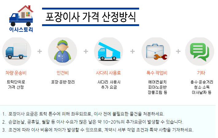 1. 인건비 - 이사당일 투입 될 작업 인원을 말합니다. 필요에따라 작업인원이 추가 될 경우 추가비용이 발생되어 포장이사가격에 영향을 줍니다.