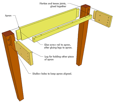 가장 튼튼하게 에이프런과 다리를 연결하는 방법은 장부결합을 하는 것입니다. 하지만 장부결합을 본드로 고정시켜 버리면 나중에 분해할 수가 없습니다. 시중에서 파는 대부분의 테이블들을 자세히 보면 에이프런이 다리와 연결되어 있지 않습니다. 대신 레일과 레일을 연결하는 대각선의 보강목이 사용됩니다. 이 보강목과 다리를 큰 볼트로 죄면 다리가 에이프런에 당겨져서 밀착이 되는 방식입니다.