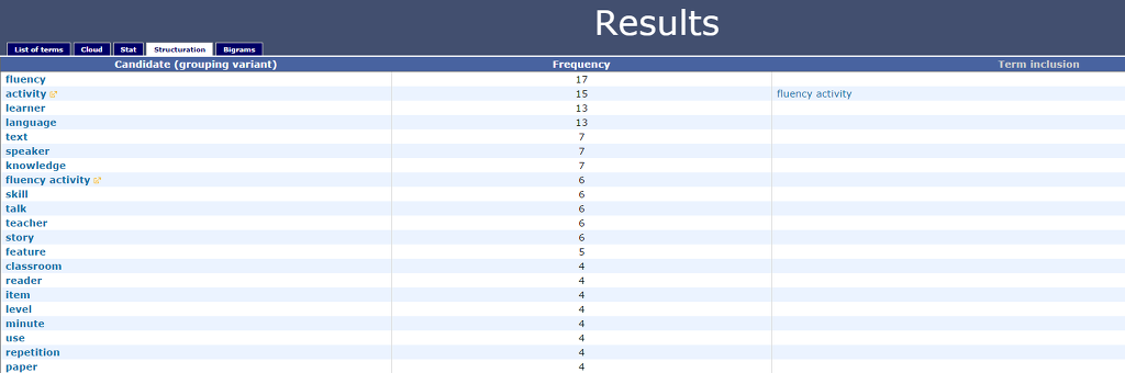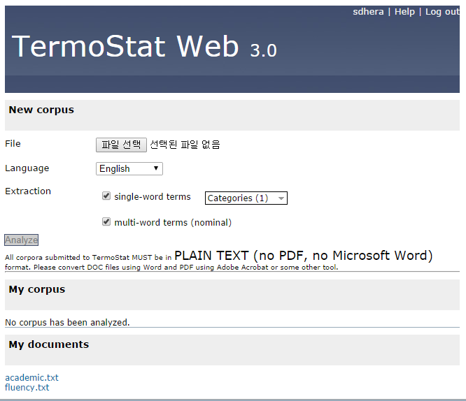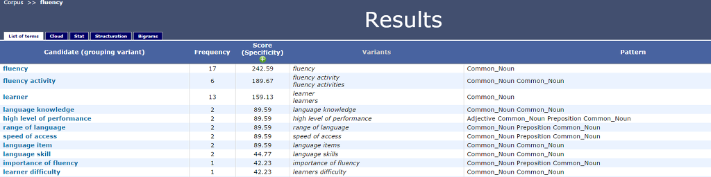 Patrick Drouin가 개발한 온라인 텍스트 분석기로서 자체 비교 코퍼스가 구축되어 있어 분석하고자 하는 텍스트(txt)만 입력하면 technical word와 collocation의 빈도수와 "Specificity (Lafon, 1980)"의 수치로 제시된다. 단어는 명사, 동사, 형용사, 부사를 선택적으로 검색 가능하며 collocation의 경우 2-8단어로 구성된 표현까지 일괄 검색하고 한 번 입력된 데이터는 서버에 저장되어 "My corpus"라는 항목에서 다시 불러와 확인할 수 있다. 단, 구글의 크롬에 최적화 되어 있으며 가입 후 무료 사용이 가능하다. 또한 분석 가능한 데이터 사이즈가 정확히 파악은 되지 않았으나 250,000 단어까지는 분석 가능한 것이 확인되었고 소규모의 ESP 코퍼스 분석에 적절하다고 판단된다.