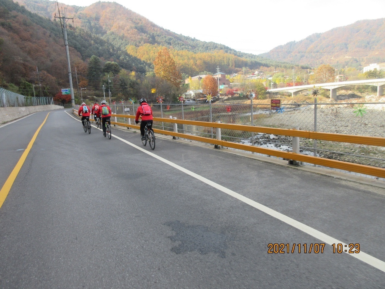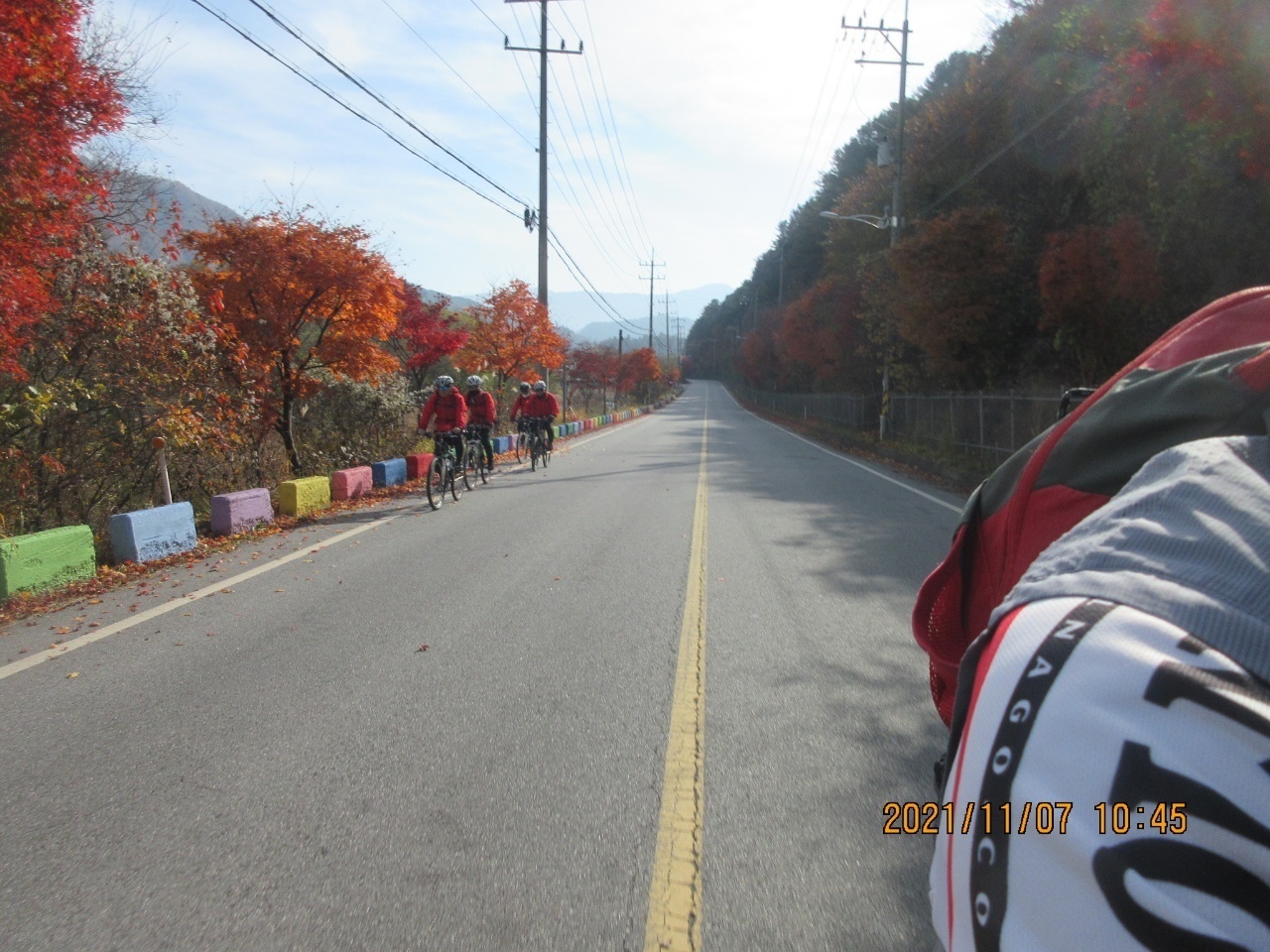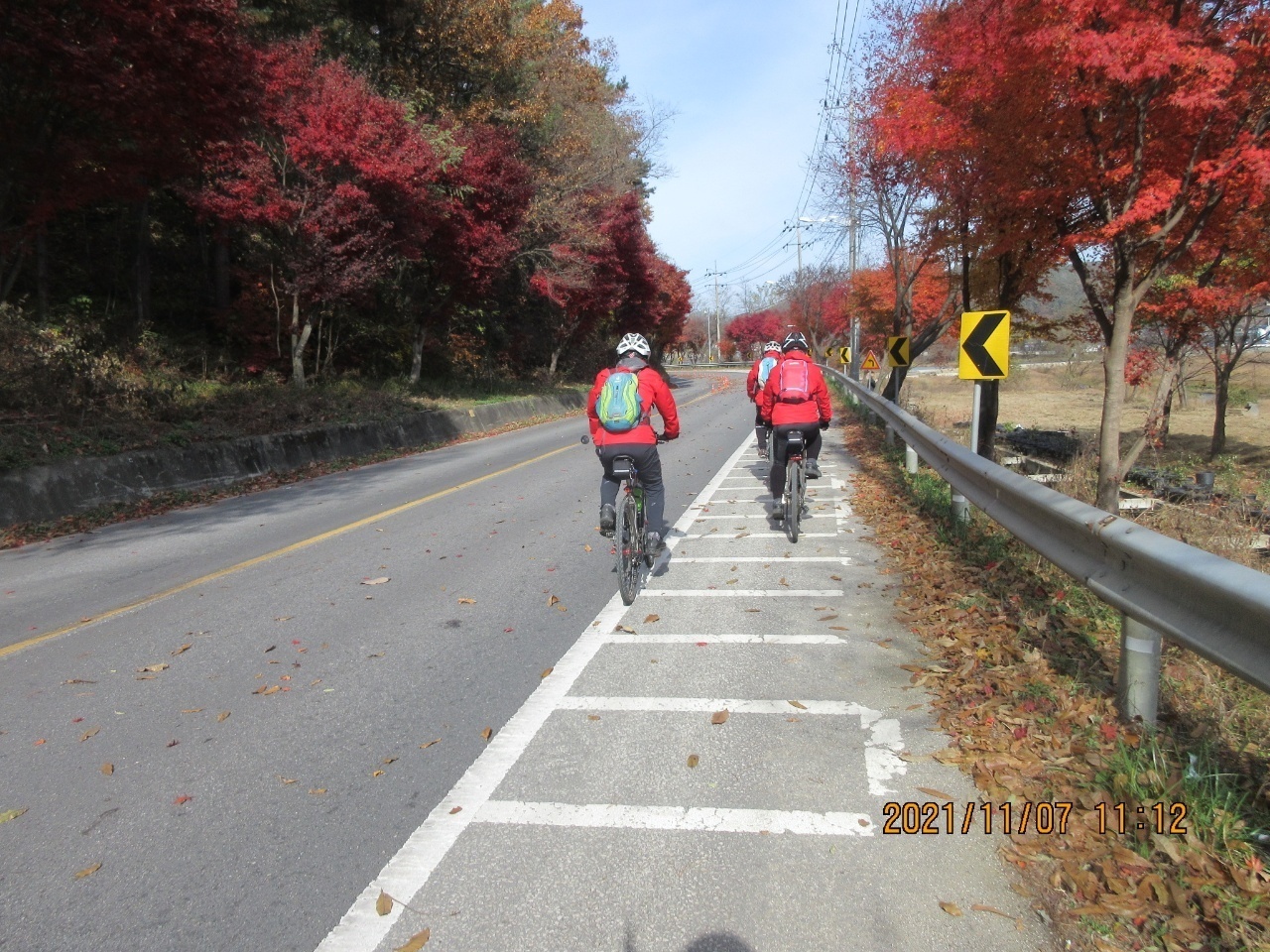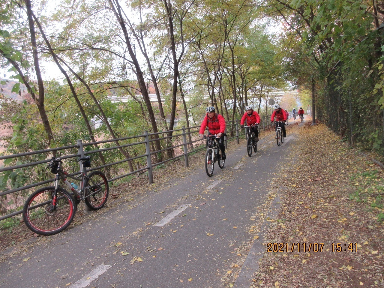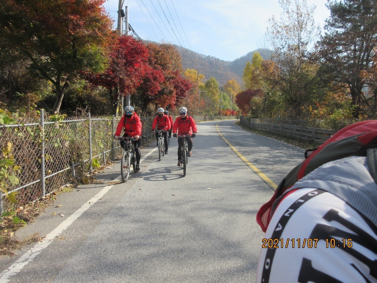 거리에는 단풍잎들이 우수수 떨어져 쓸쓸한 가을 분위기를 느낄 수 있었다. 이번 여정은 가을 풍경의 안구정화로 지루할 틈이 없었으며. 경사 5도이내로 페달링도 한결 가벼웠다. 바이크 손대장은 편안하고 여유롭게 가을 풍광을 감상하면서 즐긴 즐거운 여행이었다고 술회하였다. 회원들은 모두 행복한 표정이었다. 쉐도우수는 사진촬영하는라 바쁘게 움직였다. 라이딩 도중에 사진을 찍는다는 것은 보통일이 아니다. 스머프 차는 쉐도우수 덕분에 편안하게 라이딩에 열중할 수 있었다. 쉐도우수에게 고마움을 전한다. 그리고 시종일관 안전하게 안내해준 람보림에게 찬사를 보낸다.