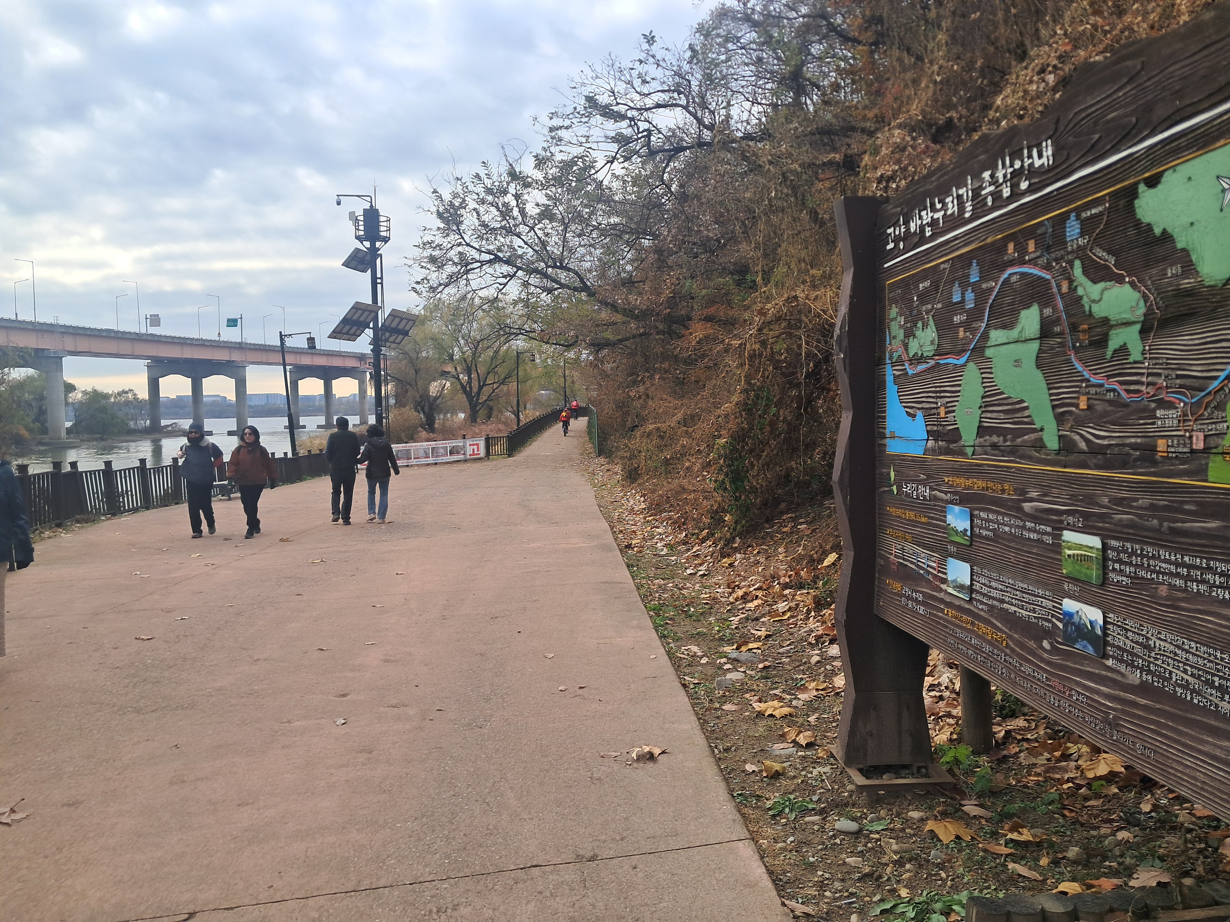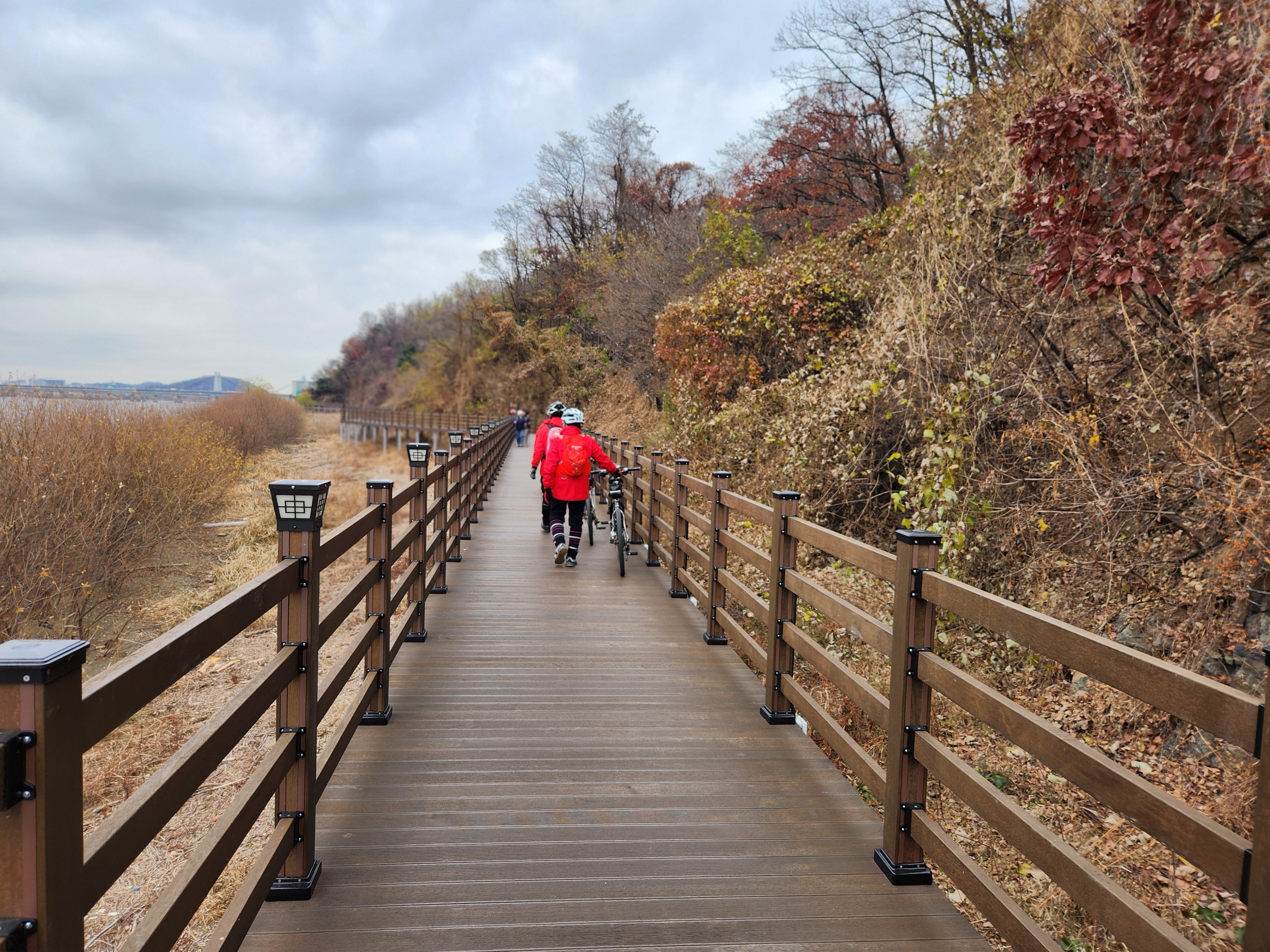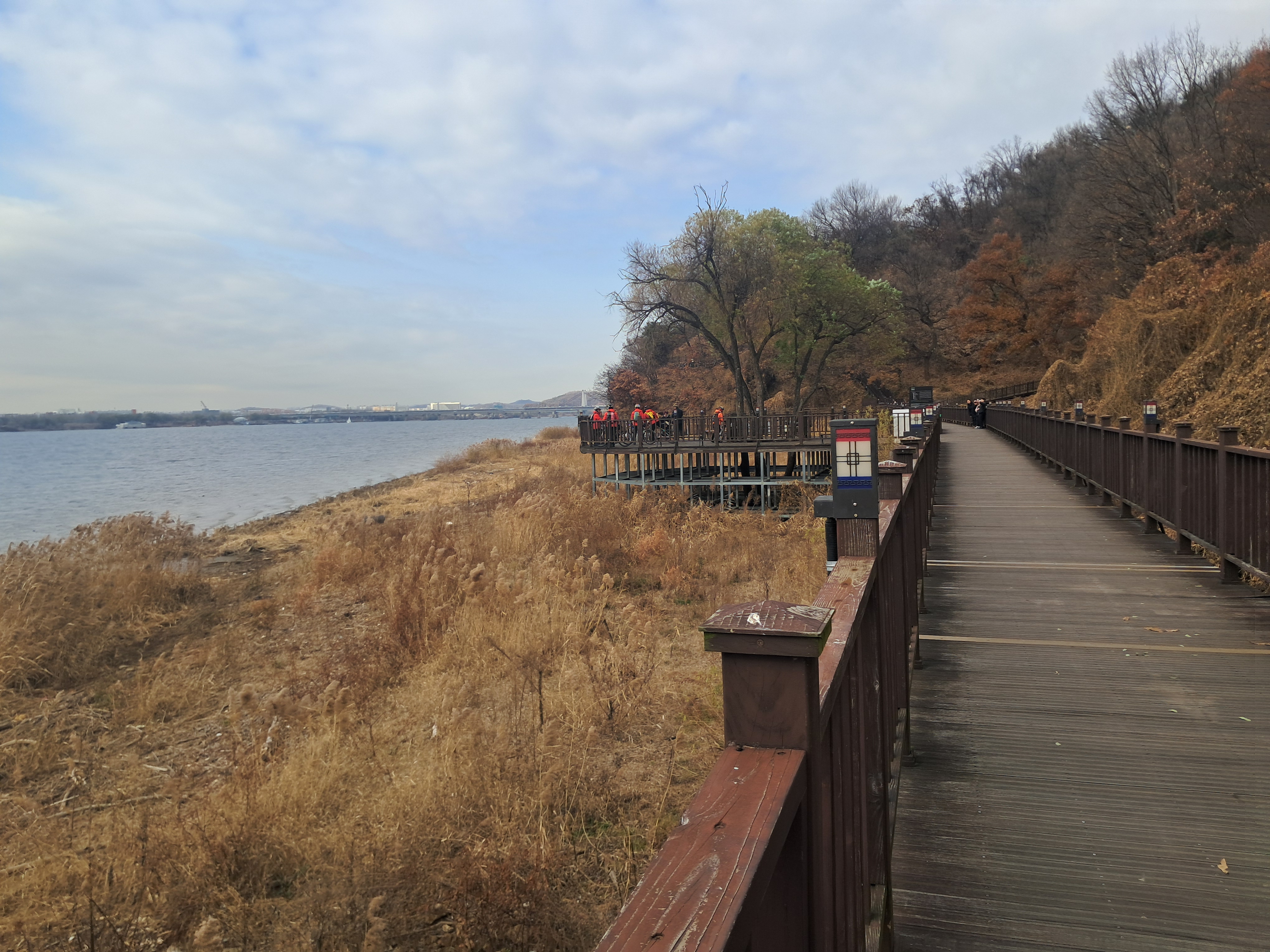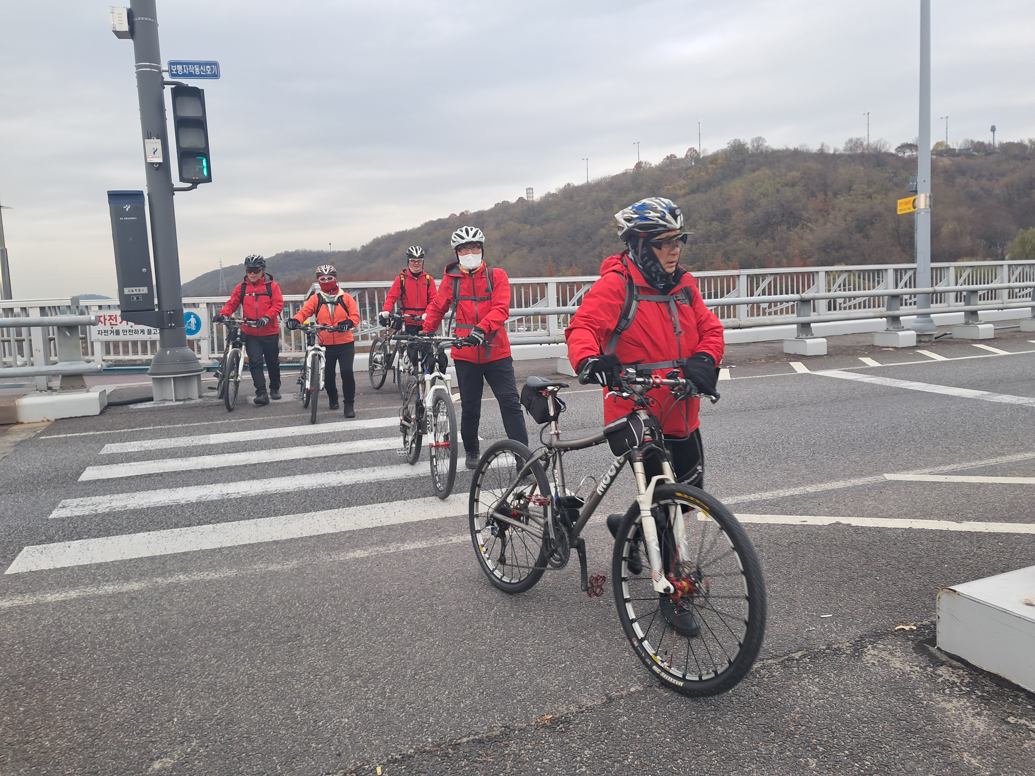 어느새 가을의 끝물이다. 낙엽들이 우수수 떨어지고 낙목이 점차 늘어나고 있어 떠나가는 가을이 허전하고 쓸쓸하기만 하다. 송년회를 겸한 가을의 마지막 라이딩은 한강을 중심으로 펼쳐지는 향연으로 용산구, 마포구,고양시 덕양구, 강서구, 영등포구 순으로 이어지는 코스다. 금년 라이딩은 계획대로 하지 못한 것이 못내 아쉽지만 자연을 벗삼아 바이콜 전사들과 함께한 아름다운 추억은 영원히 간직될 것이다. 여정의 시작은 잠수교 북단 오전 10시다. 잠수교는 새롭게 변신한다고 한다. 전용 보행로로 바뀌고 숲길과 함께 야외영화관과 수상식물, 수변무대가 들어설 예정이라고 한다.