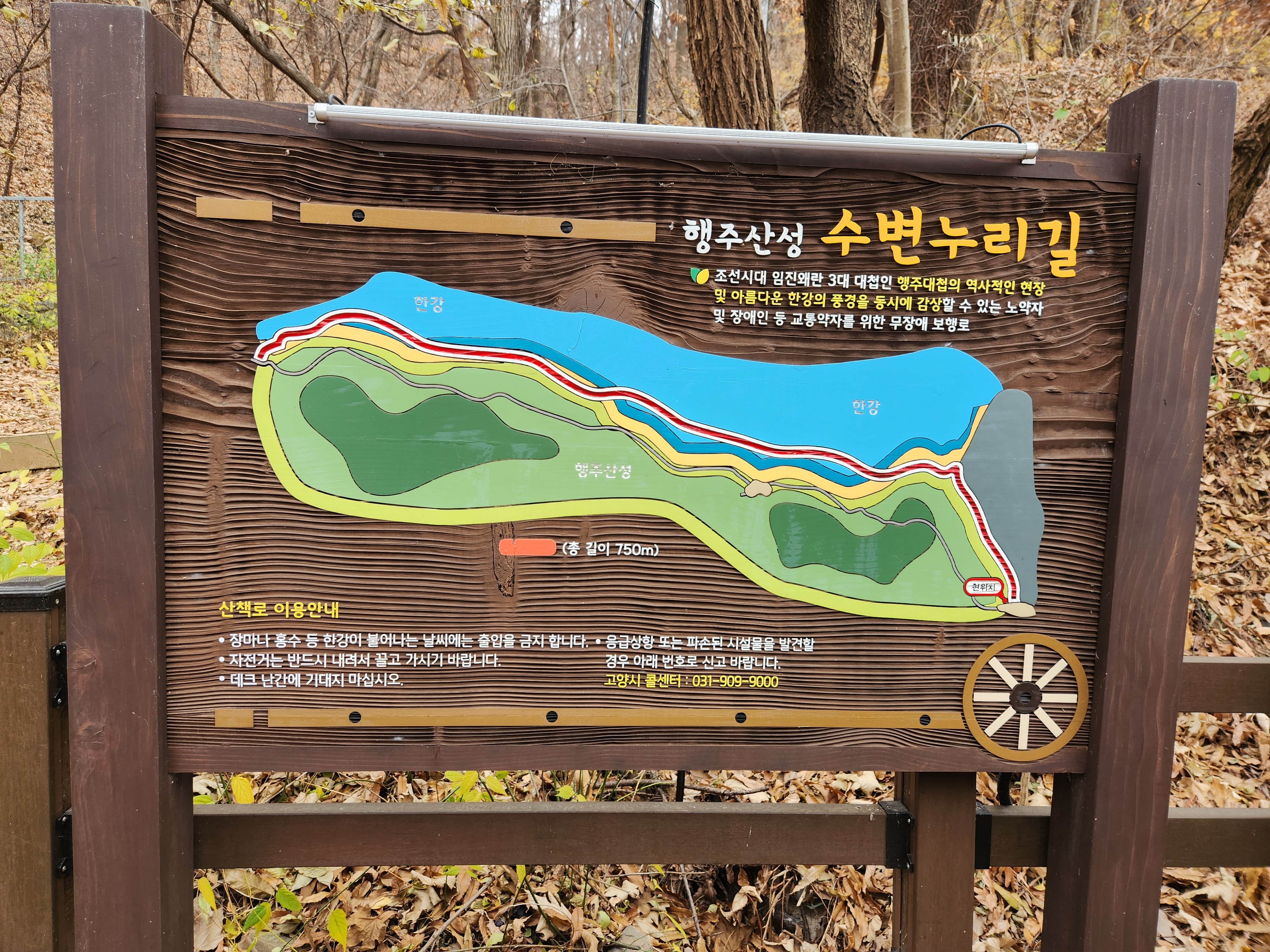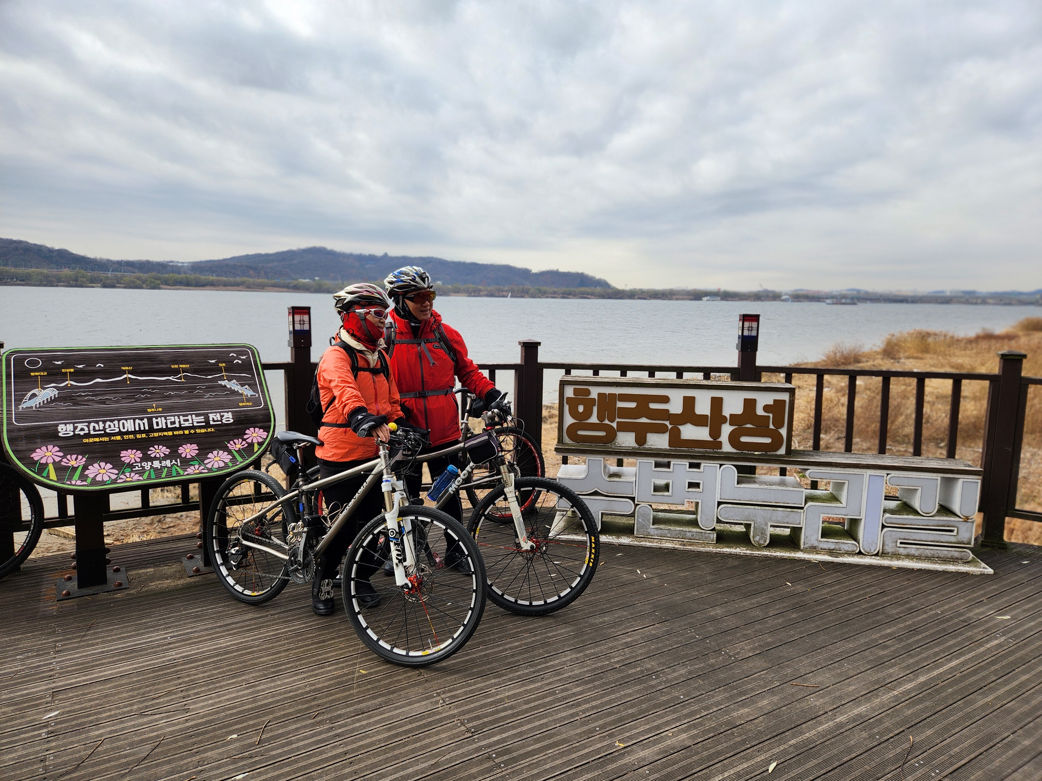 나무와 수풀이 우거져 있어 제법 운치가 있다. 이곳은 바닷물과 민물이 어우러지는 기수역(汽水域)이라 바다생물을 만나볼 수 있다. 이곳을 지나면 덕양산(행주산성)이 뚜렷하게 보인다. 덕양산(행주산성)은 작은 산이지만 한강을 끼고 있어 적의 도하작전을 방어할 수 있는 천혜의 요새이기도 하다. 군 출신이라 그런지 행주산성을 볼 때마다 1592년 임진왜란 전쟁 당시 상황들을 떠올리곤 한다. 행주산성 부근 맛집을 찾을 때마다 자전거 도로를 이용하였지만 이번에는 행주산성 둘레길인 수변누리길(데크길)를 따라 자전거를 밀바하면서 이동하였다. 이 길은 한강과 동행하는 평화누리길 4-1코스로 한강과 행주산성을 감상할 수 있는 아름다운 길이다.