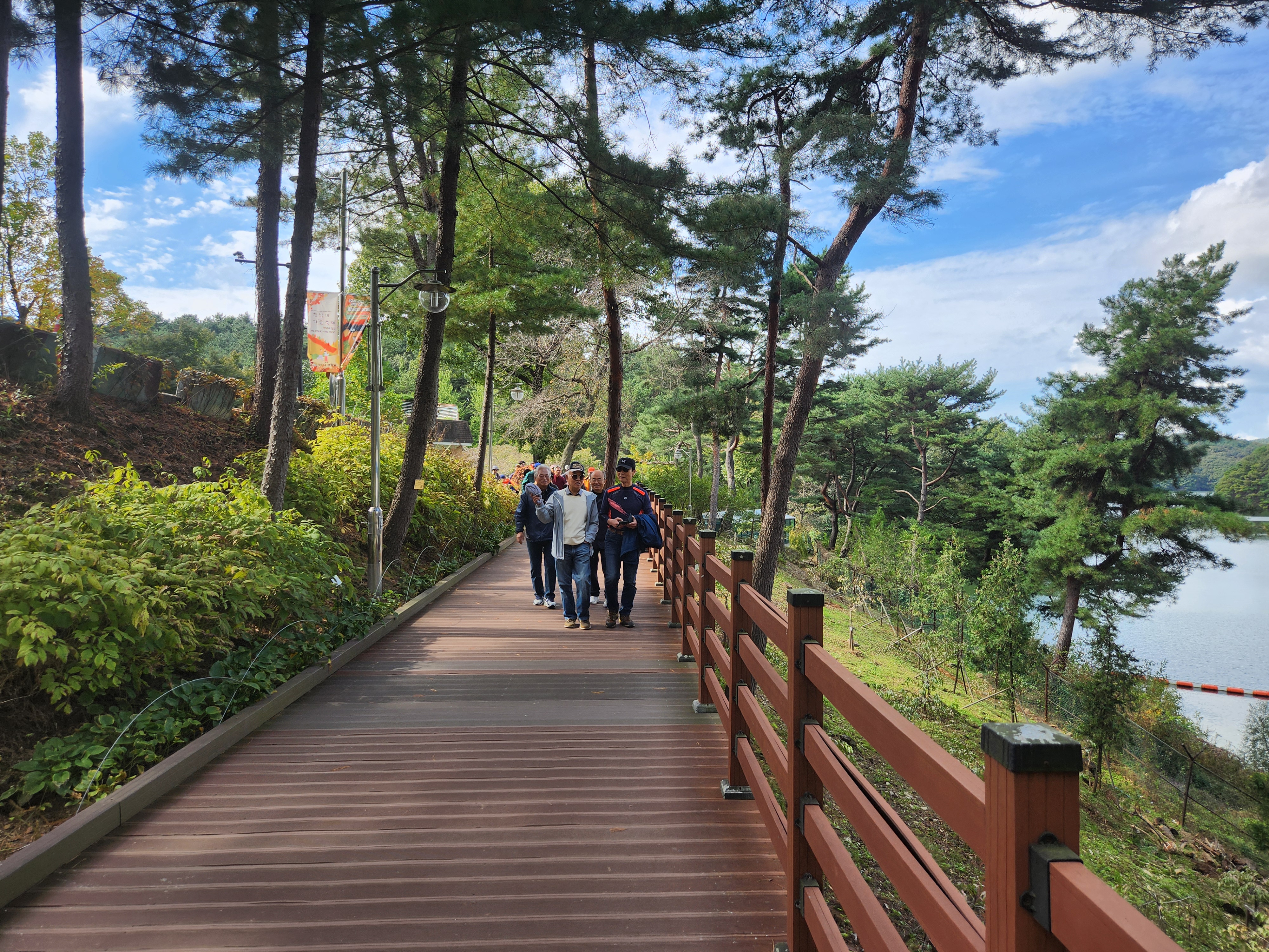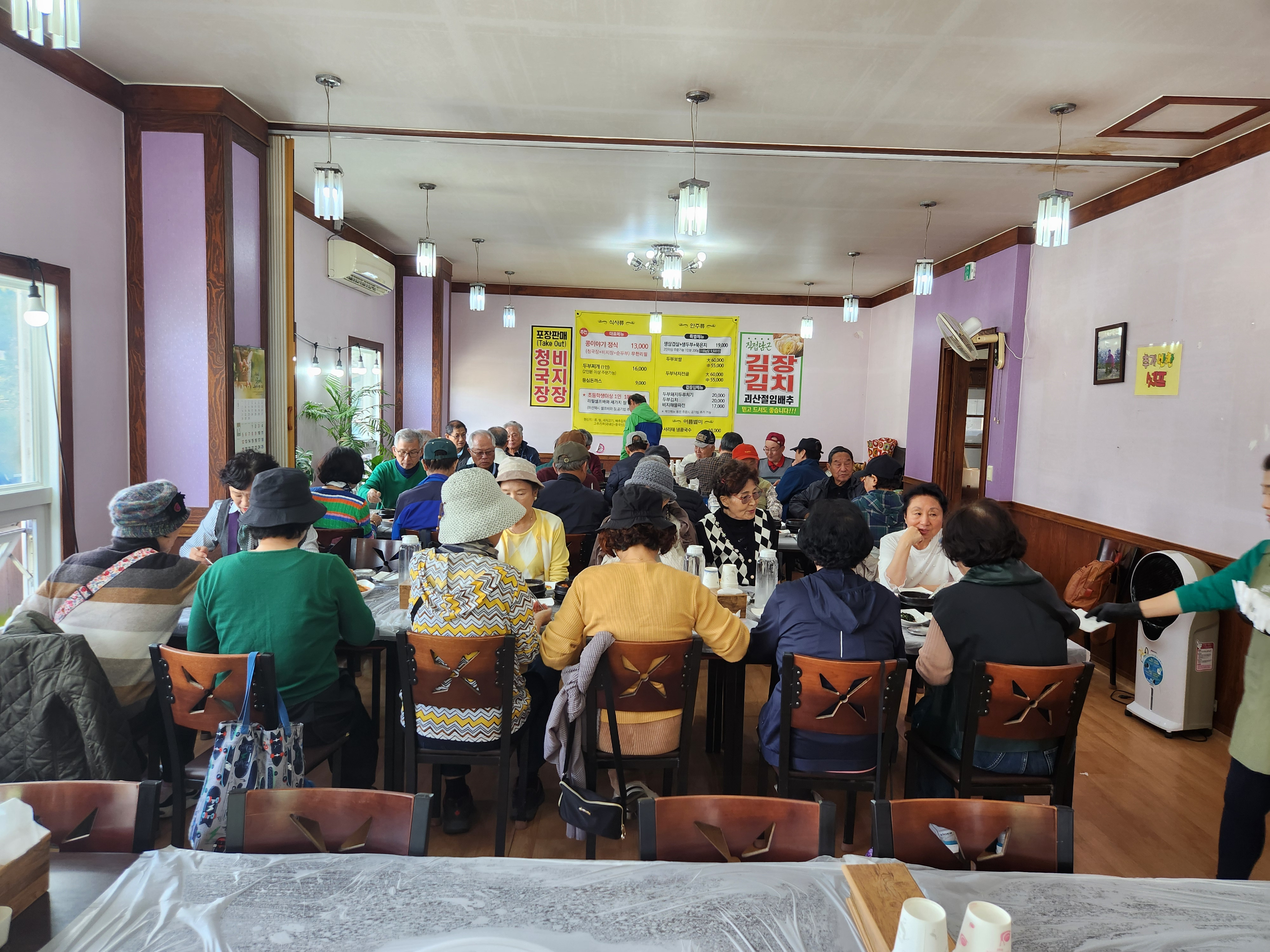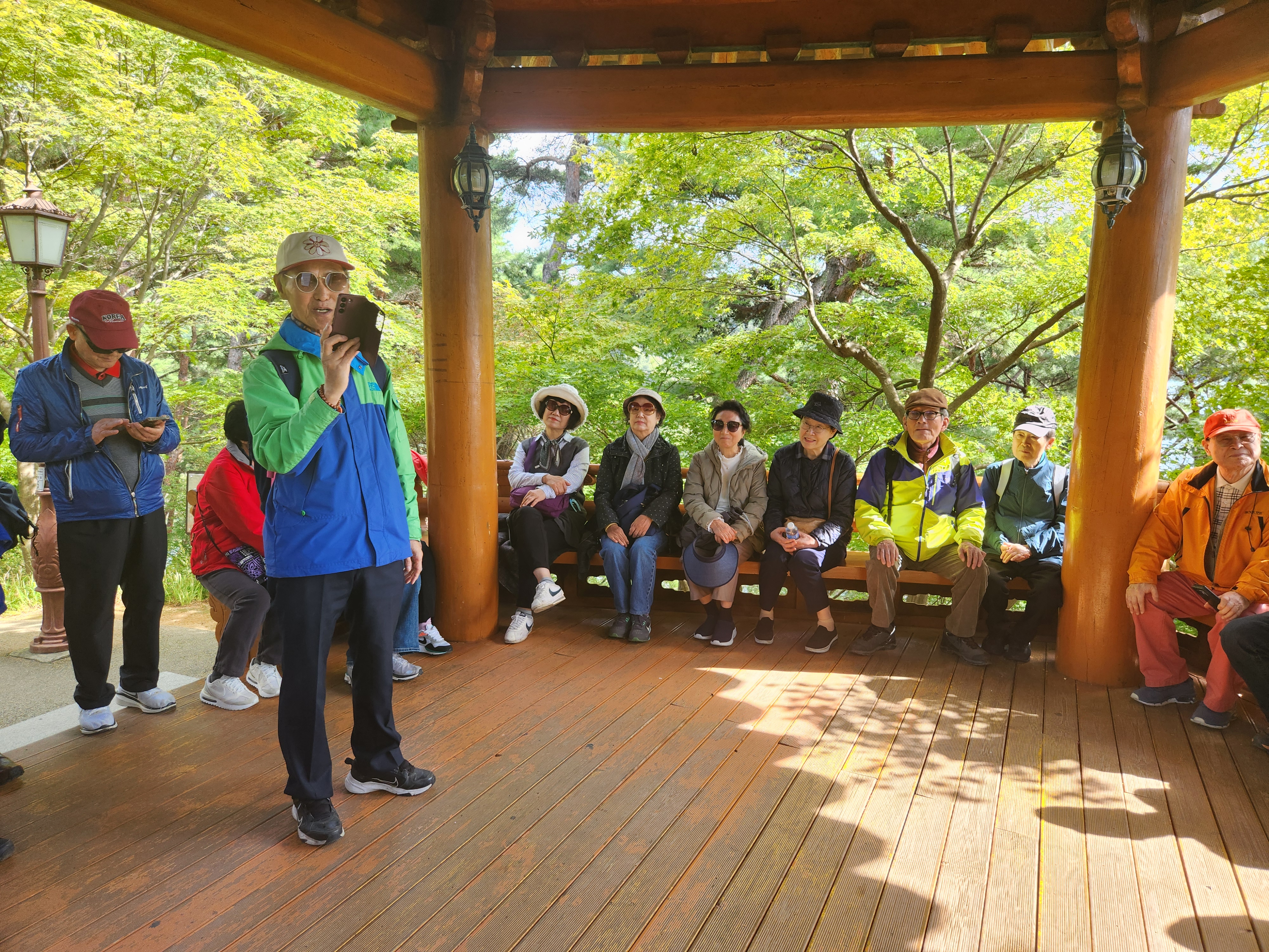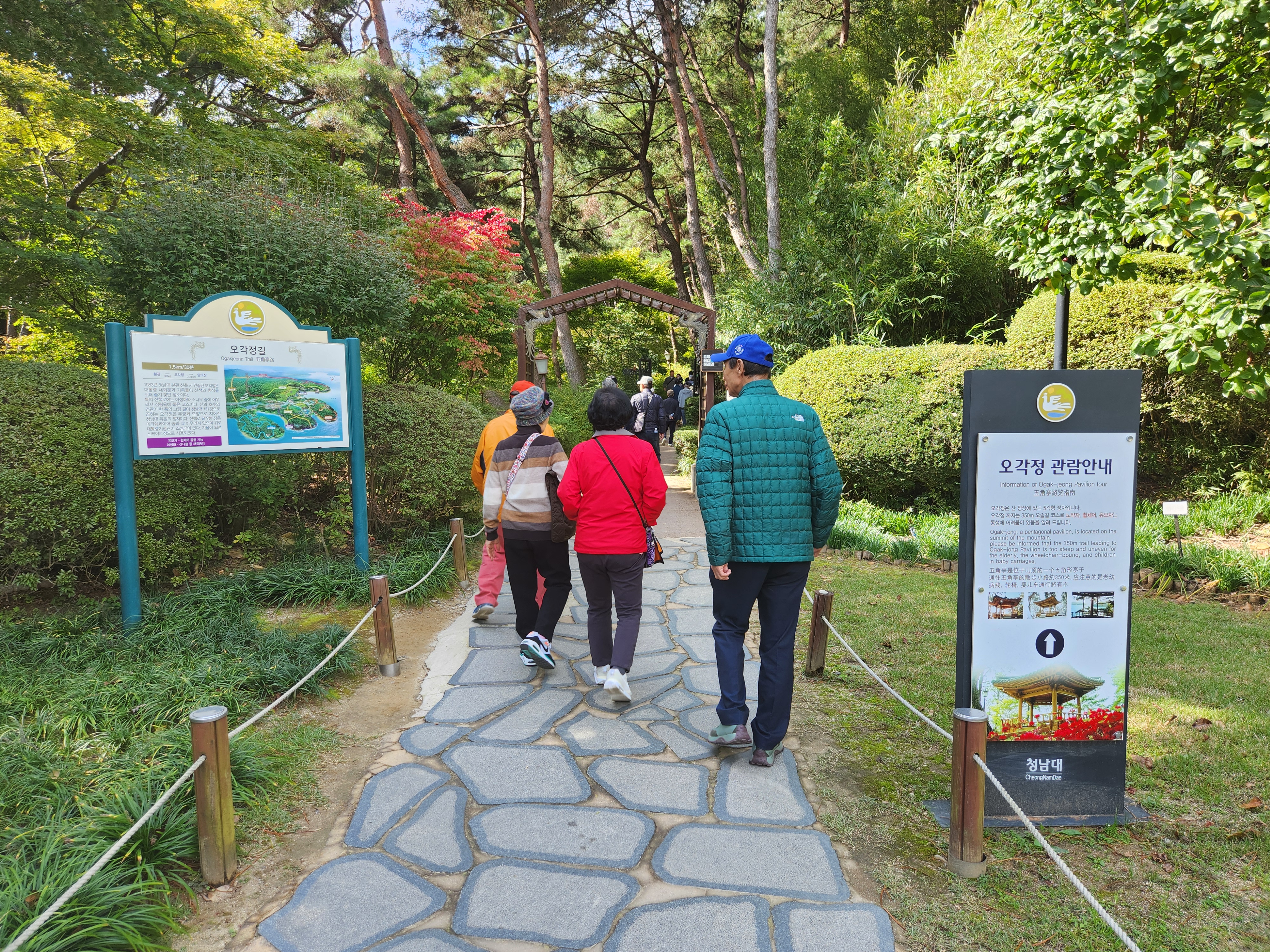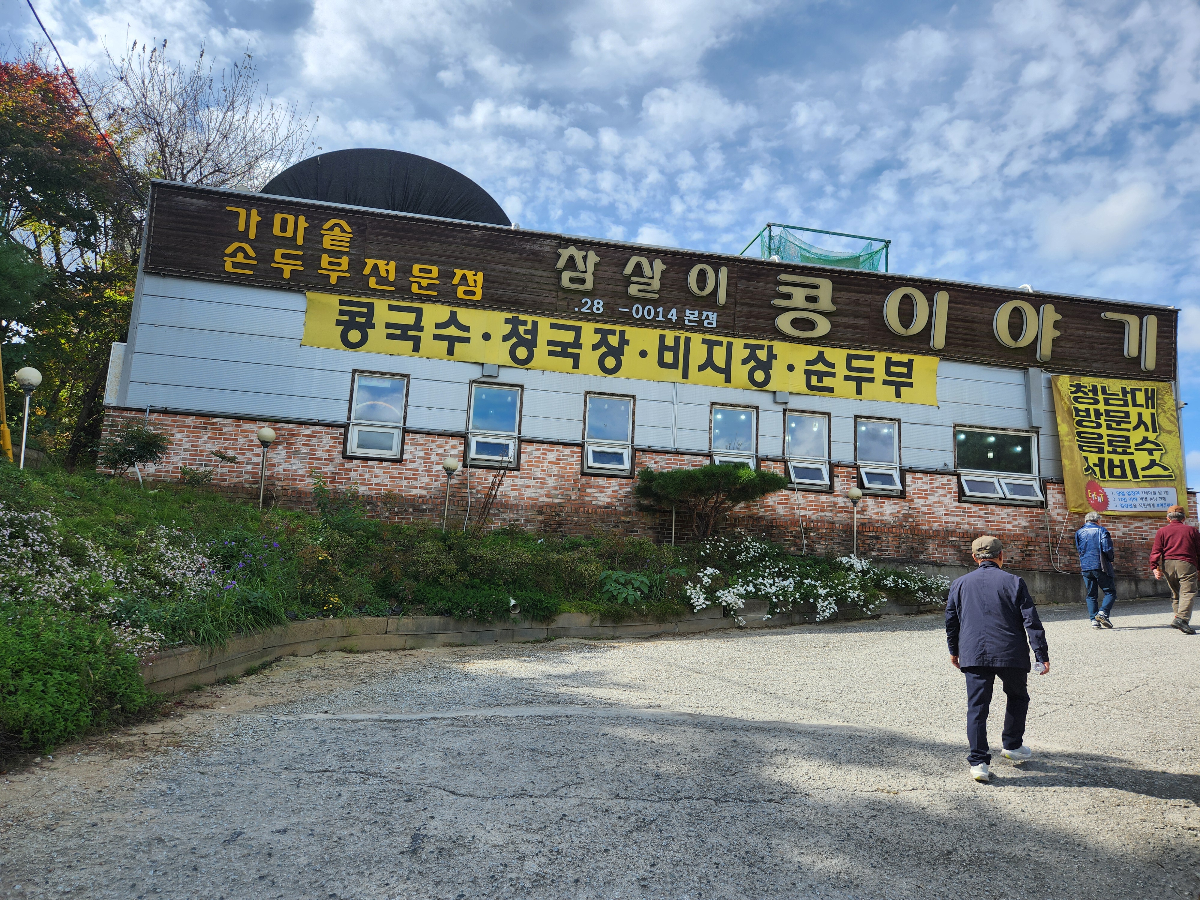 본관을 둘러보고 오각정으로 향한다. 오각정은 20여년 동안 대통령 내외분과가족분들의 산책코스로 가장 사랑을 받아온 곳이다. 다양한 야생화와 숲이 어우러져 삼림욕하기에도 좋고 호수를 바라보면서 물멍쉬멍하기에도 더할나위없다. 정자에 오르면 전인구 동문은 의례 챗지피티에 의례하여 시 한 수를 읊는다. 시는 언제 들어도 감성을 자극한다. 청남대을 둘러보고 속리산 법주사로 향한다. 약 1시간이 소요된다. 법주사로 가는 길에 오후 1시 넘어서 가마솥 손두부전문점에서 콩이야기 정식(청국장, 콩비지,손두부, 13,000원)으로 오찬을 즐기고 관광버스에 다시 오른다.