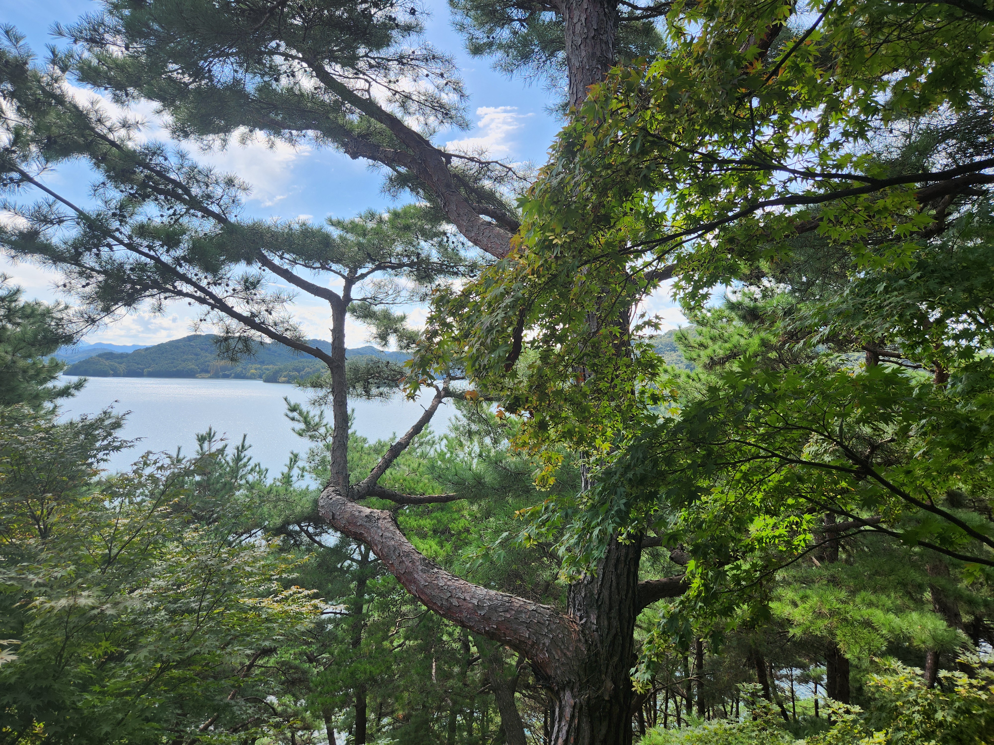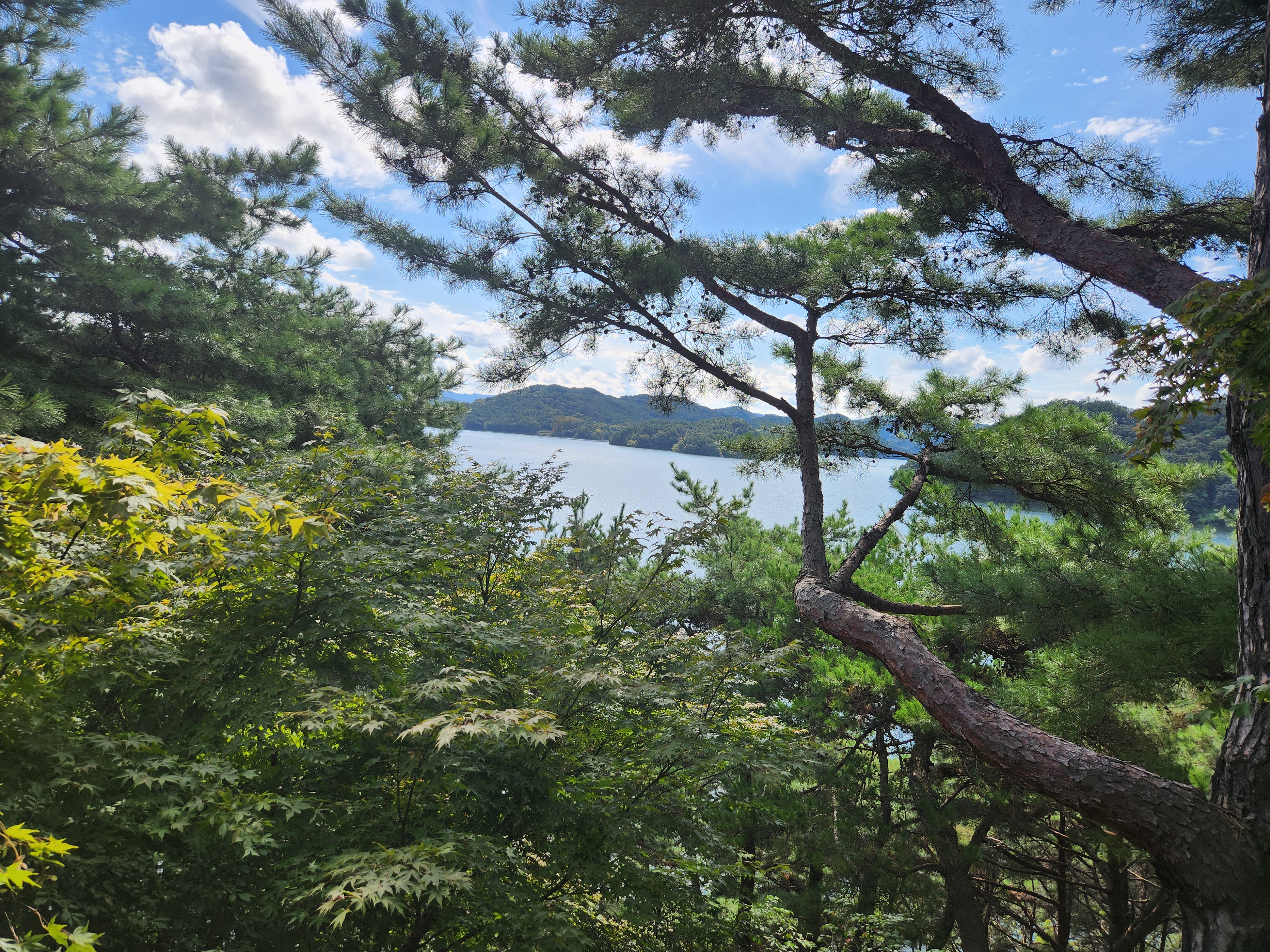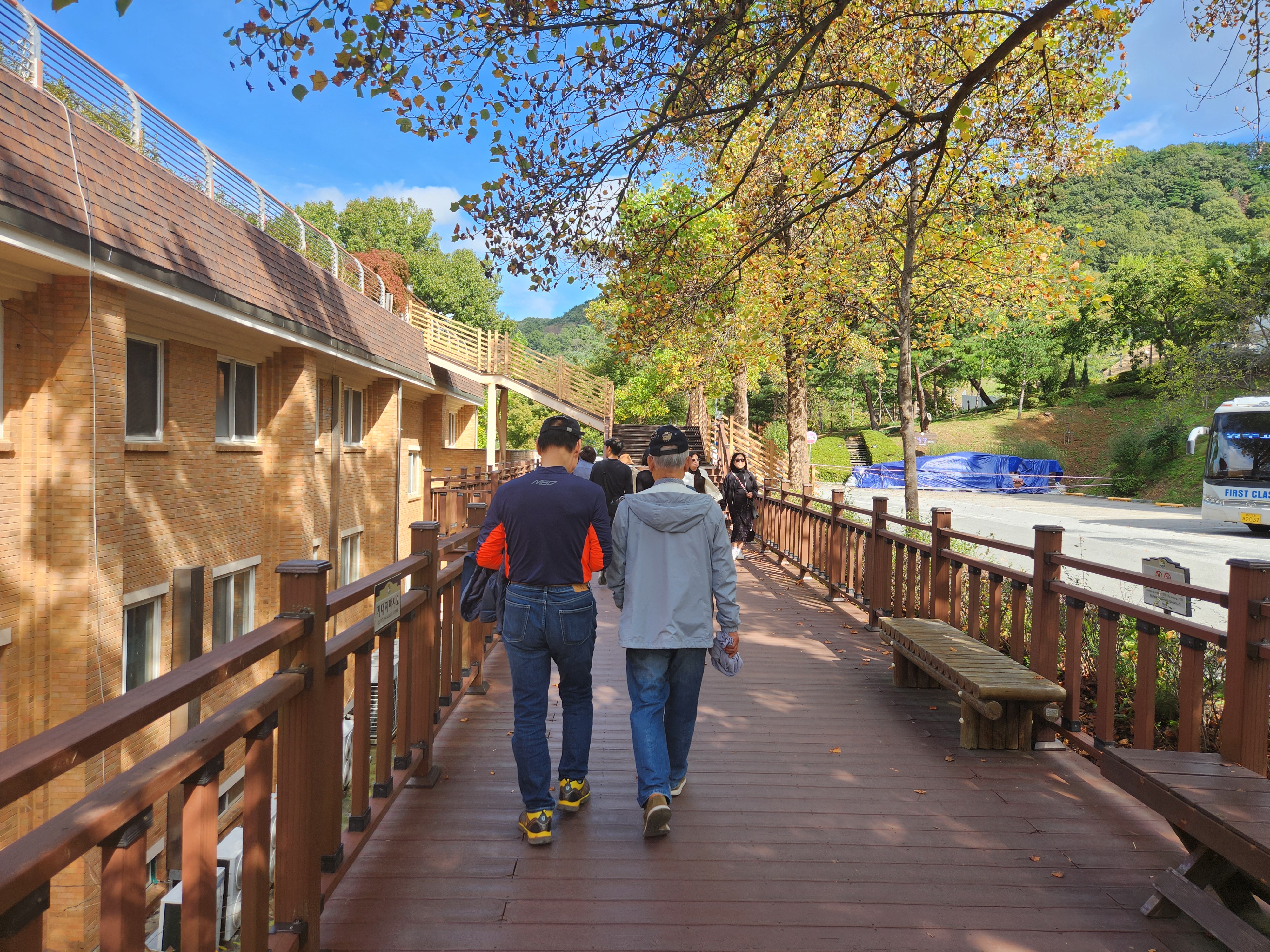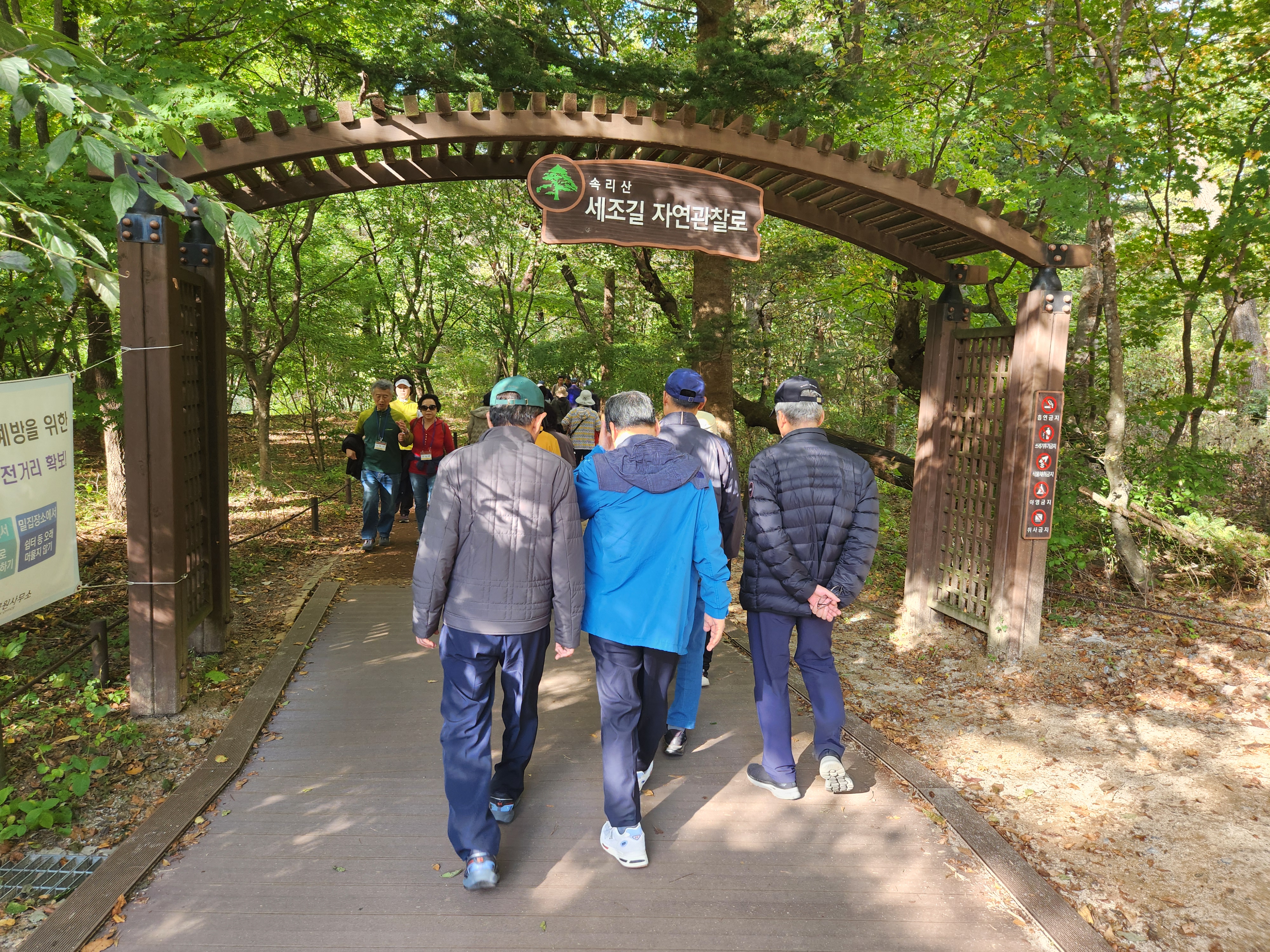 본관을 둘러보고 오각정으로 향한다. 오각정은 20여년 동안 대통령 내외분과가족분들의 산책코스로 가장 사랑을 받아온 곳이다. 다양한 야생화와 숲이 어우러져 삼림욕하기에도 좋고 호수를 바라보면서 물멍쉬멍하기에도 더할나위없다. 정자에 오르면 전인구 동문은 의례 챗지피티에 의례하여 시 한 수를 읊는다. 시는 언제 들어도 감성을 자극한다. 청남대을 둘러보고 속리산 법주사로 향한다. 약 1시간이 소요된다. 법주사로 가는 길에 오후 1시 넘어서 가마솥 손두부전문점에서 콩이야기 정식(청국장, 콩비지,손두부, 13,000원)으로 오찬을 즐기고 관광버스에 다시 오른다.