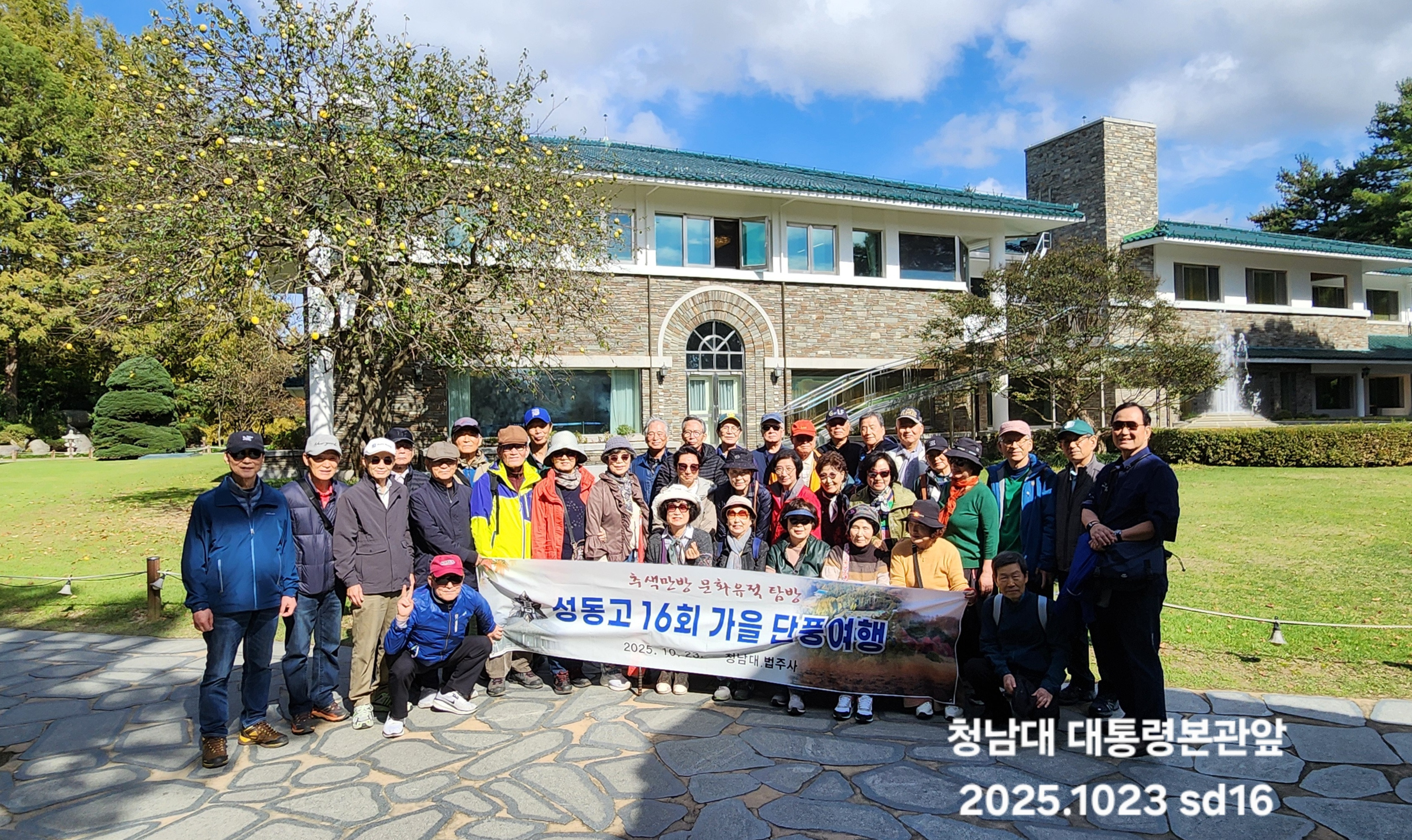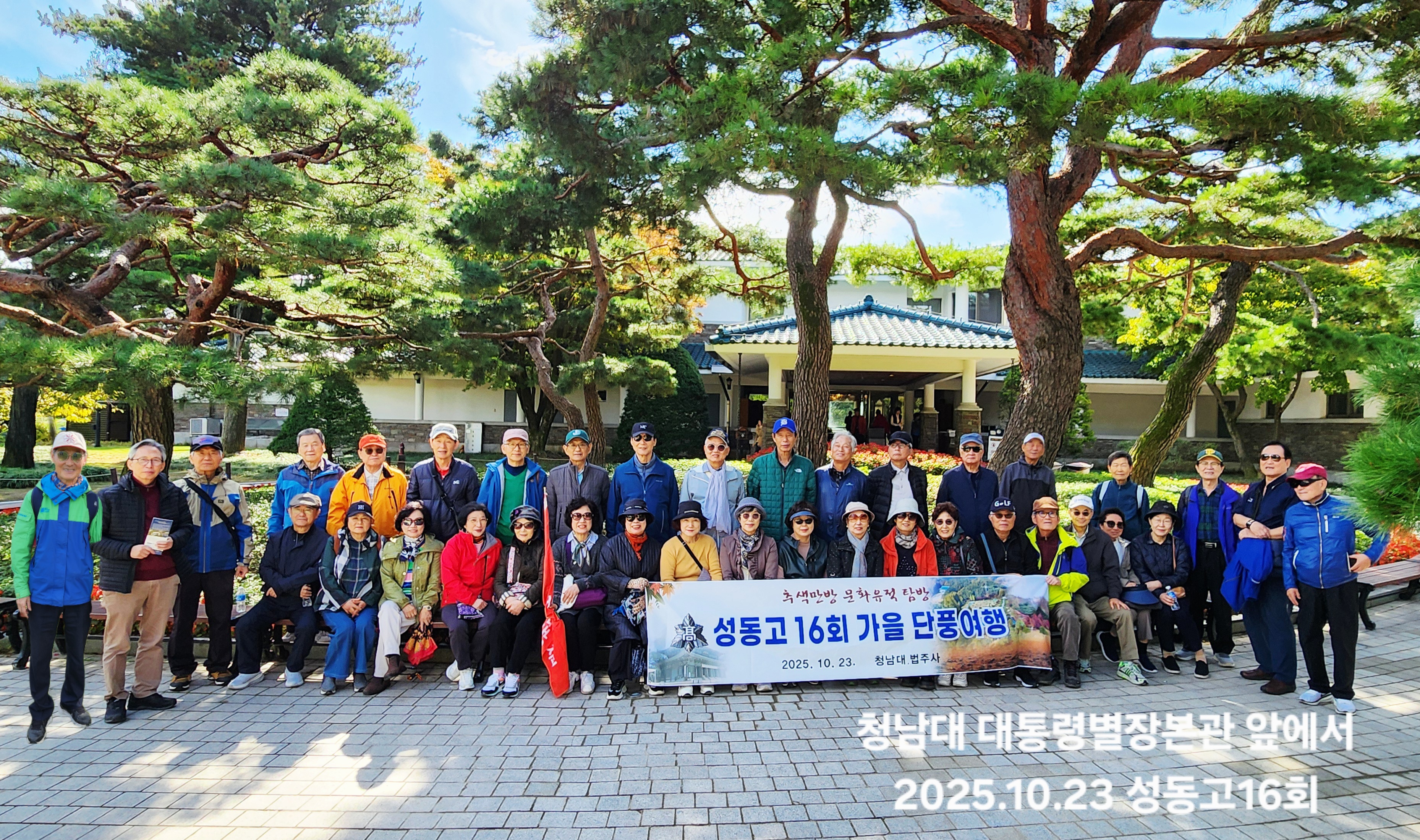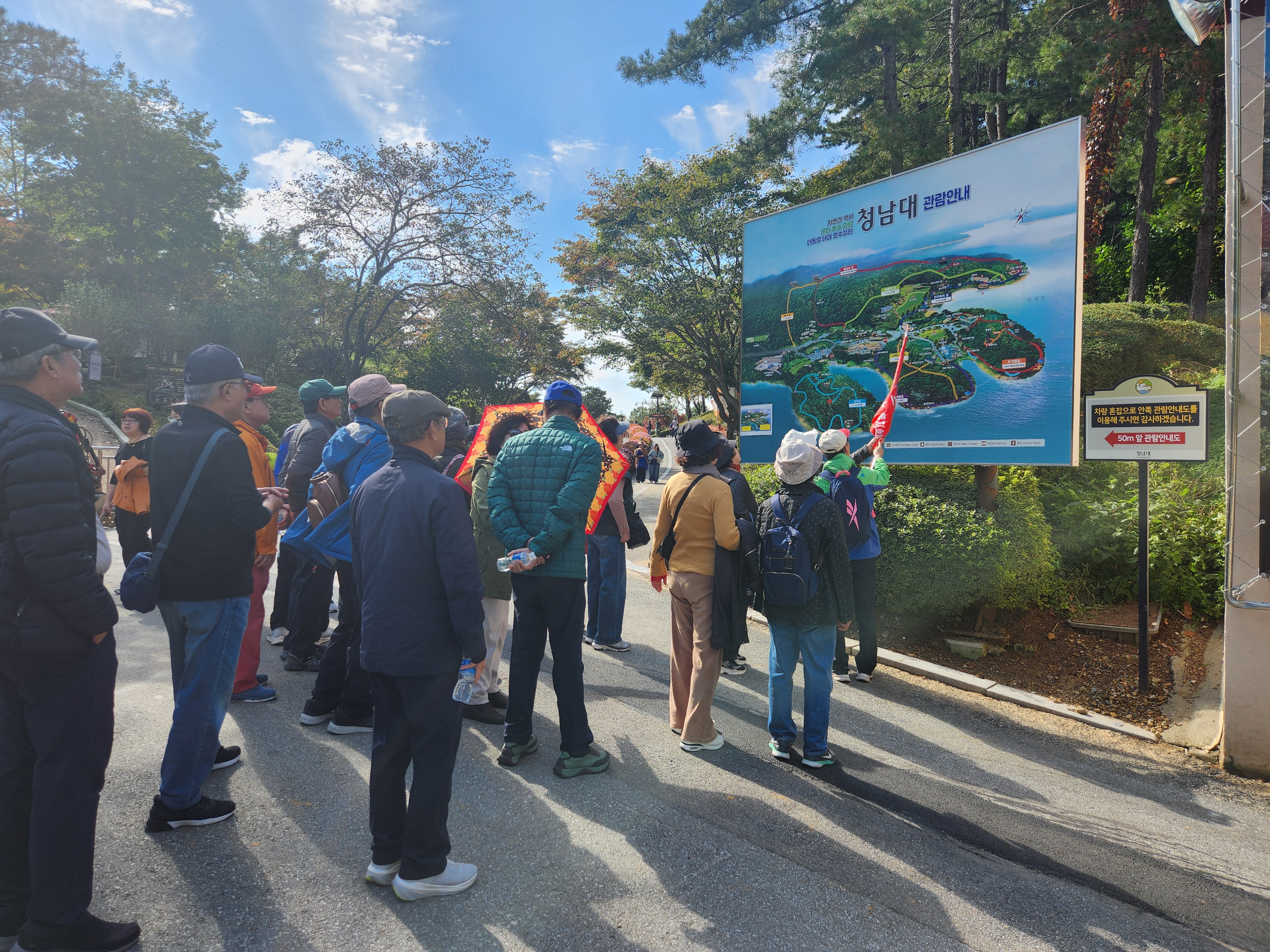 가을은 점점 깊어만 가고 날씨는 쌀쌀해지고 있다. 가을은 여행하기에 가장 좋은 계절이기도 하다. 쌀쌀한 바람과 푸른 하늘에 알록달록한 단풍이 여행길에 오르게 한다. sd`16 동문회는 10월을 맞이하여 충북 청남대와 속리산 법주사를 가을 여행지로 선정하였다. 해마다 이맘때는 가을여행을 떠난다. 사당역에서 관광버스에 탑승하고 경부고속도로에서 당진,영덕 고속도로로 갈아타면 2시간 이내에 청남대에 도착한다. 참가인원은 부부동반을 포함하여 37명이다. 청남대는 20년 간 전두환, 노무현, 김영삼, 김대중, 노무현 등 5명의 대통령이 휴식과 함께 국정을 운영하던 곳으로 대청호를 품고있어 경치가 제법 아름답다.