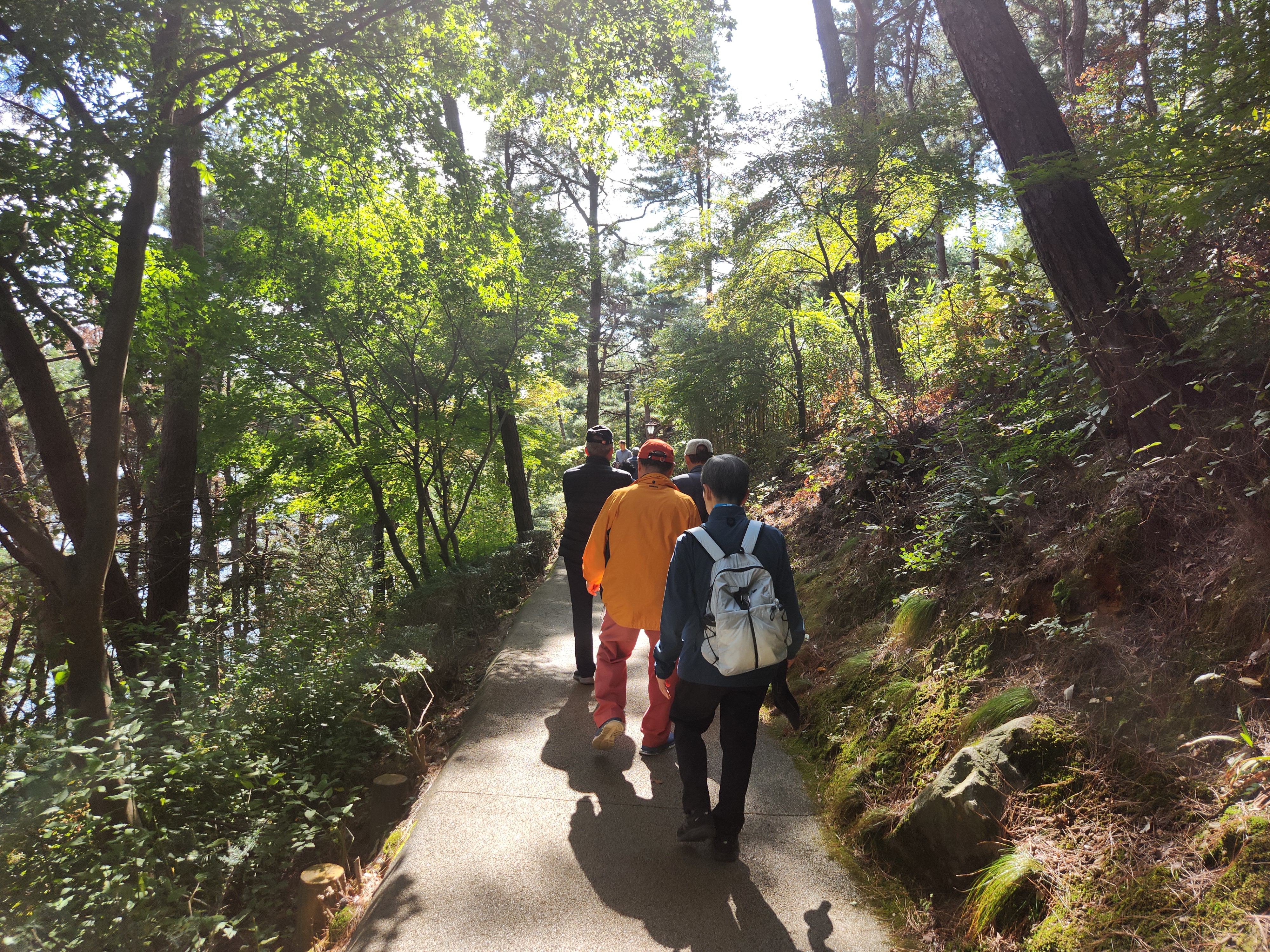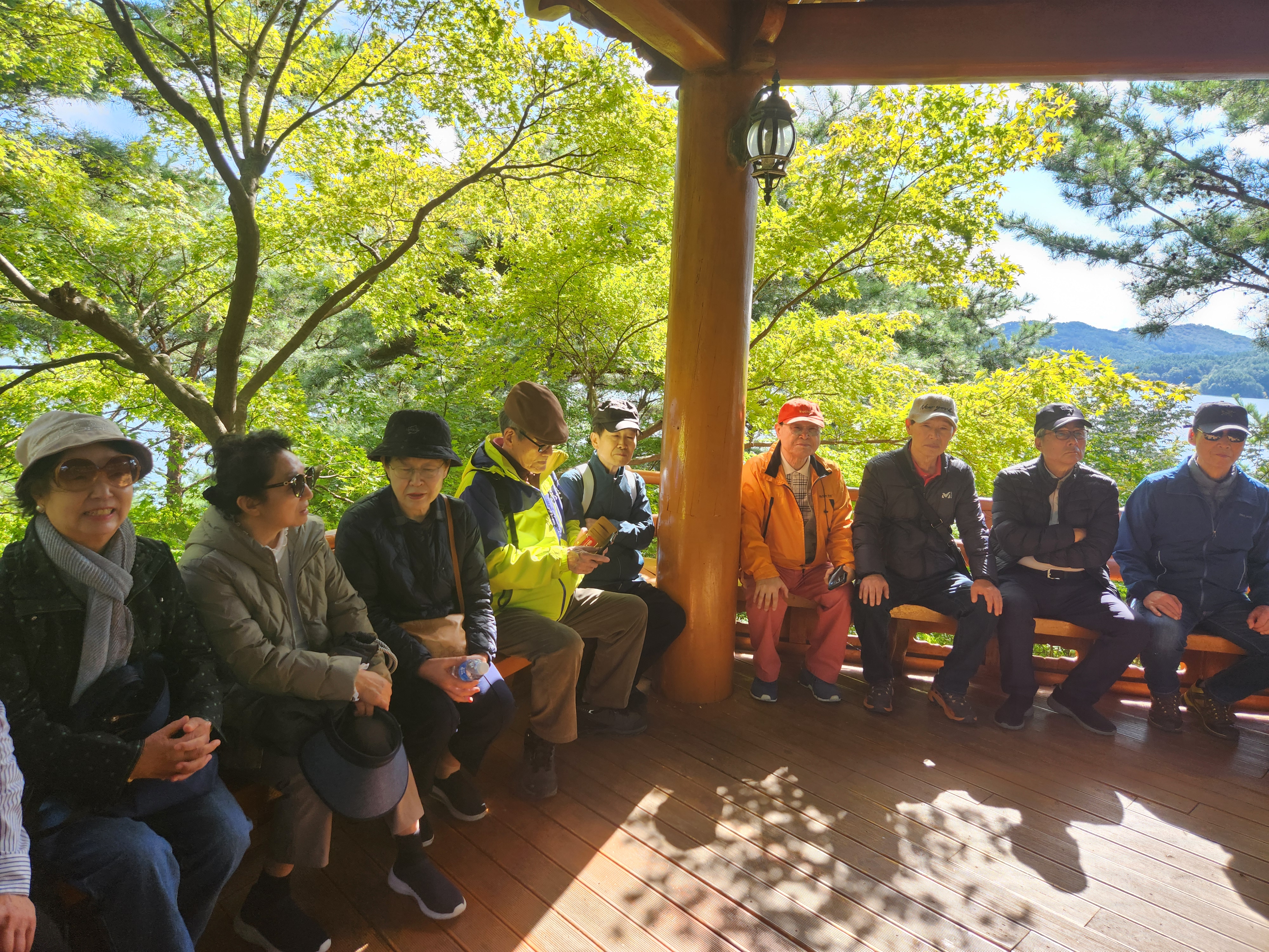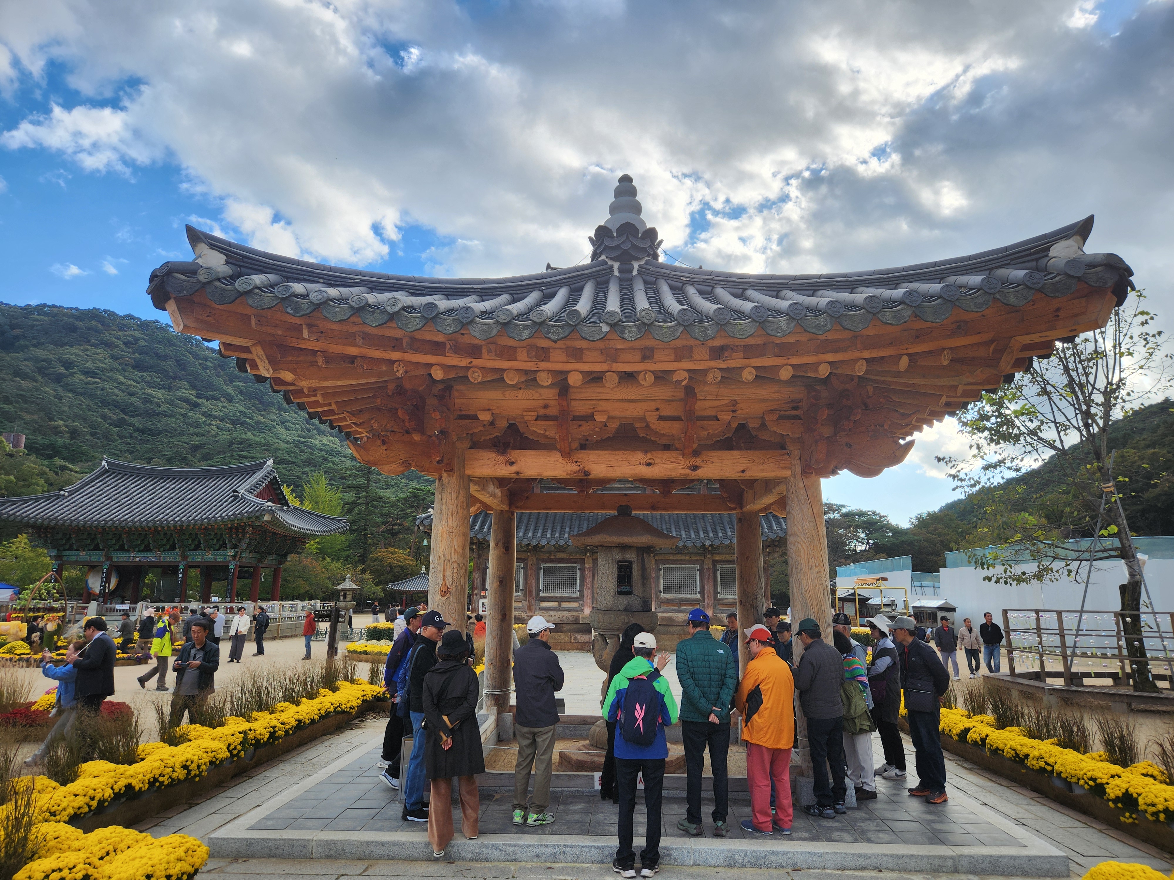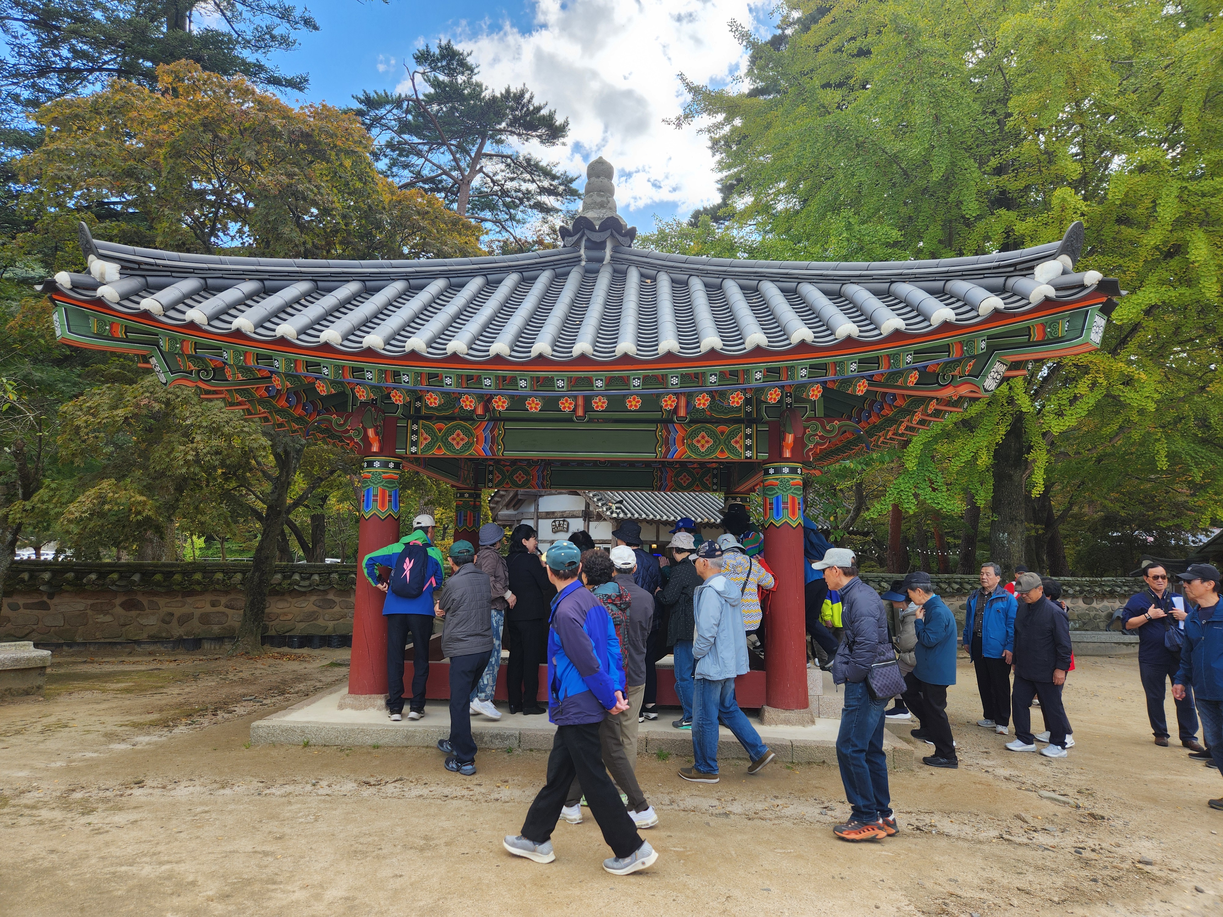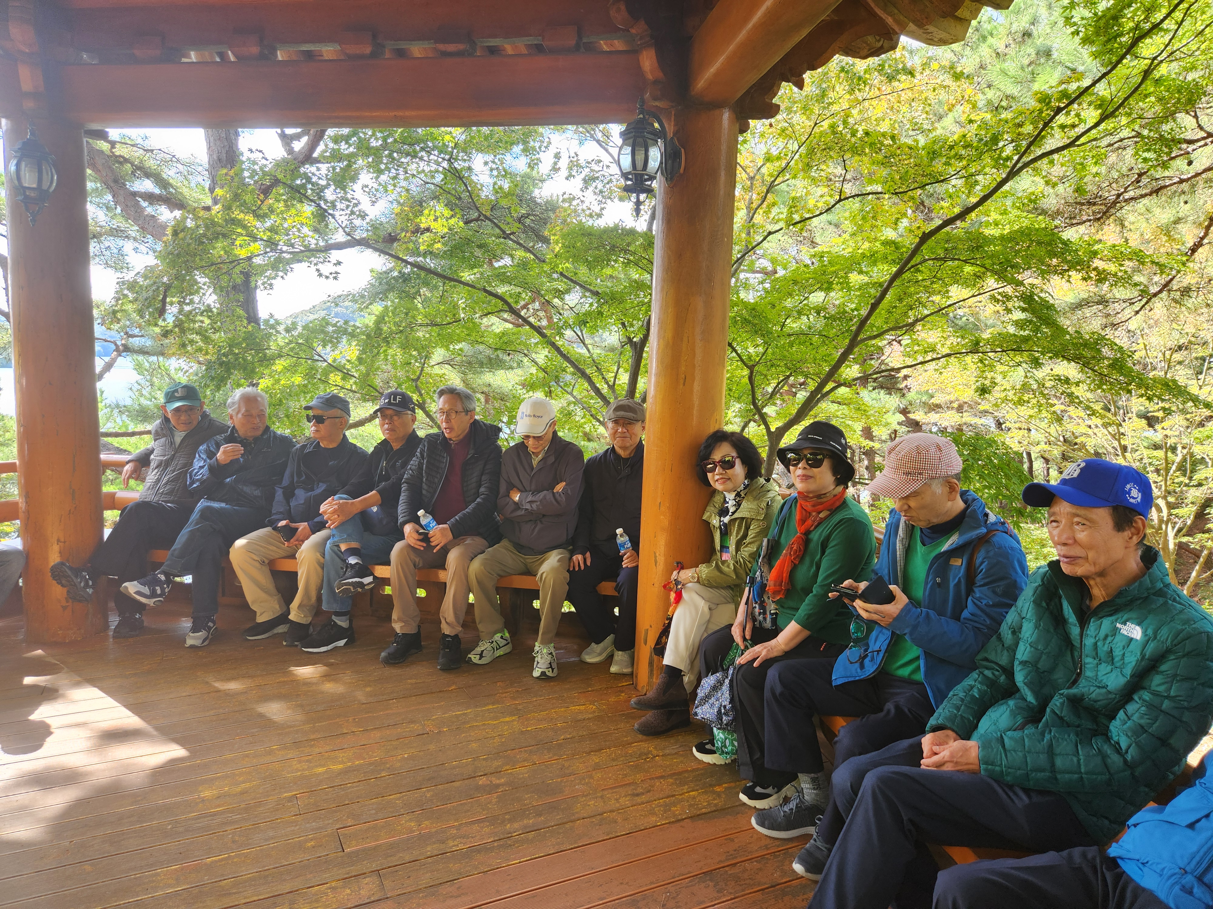 청산유수로 말씀하시는 해설을 듣고 몰랐던 사실들을 알게된 소중한 시간이었다. 회장단에서 수고하신 댓가로 수건을 선물하였다. 속리산 자락에 위치한 법주사는 병풍처럼 둘러싸인 산줄기와 어우러져 그 자체로도 아름답지만 단풍이 들면 더욱 그림같은 풍경이 펼쳐질 것으로 생각된다. 법주사를 뒤로하고 상경길에 오른다. 상경도중에 안성휴게소에서 각자 취향에 맞는 저녁식사를 하고 밤 8시경에 신분당선 상현역에서 각산진비하였다. 전형적인 가을 날씨로 여행하기에 더할나위 없었다. 어느 여행보다도 더 알차고 풍요로운 여행길이었다. 동문들 모두 즐거움과 행복이 가득하였다.