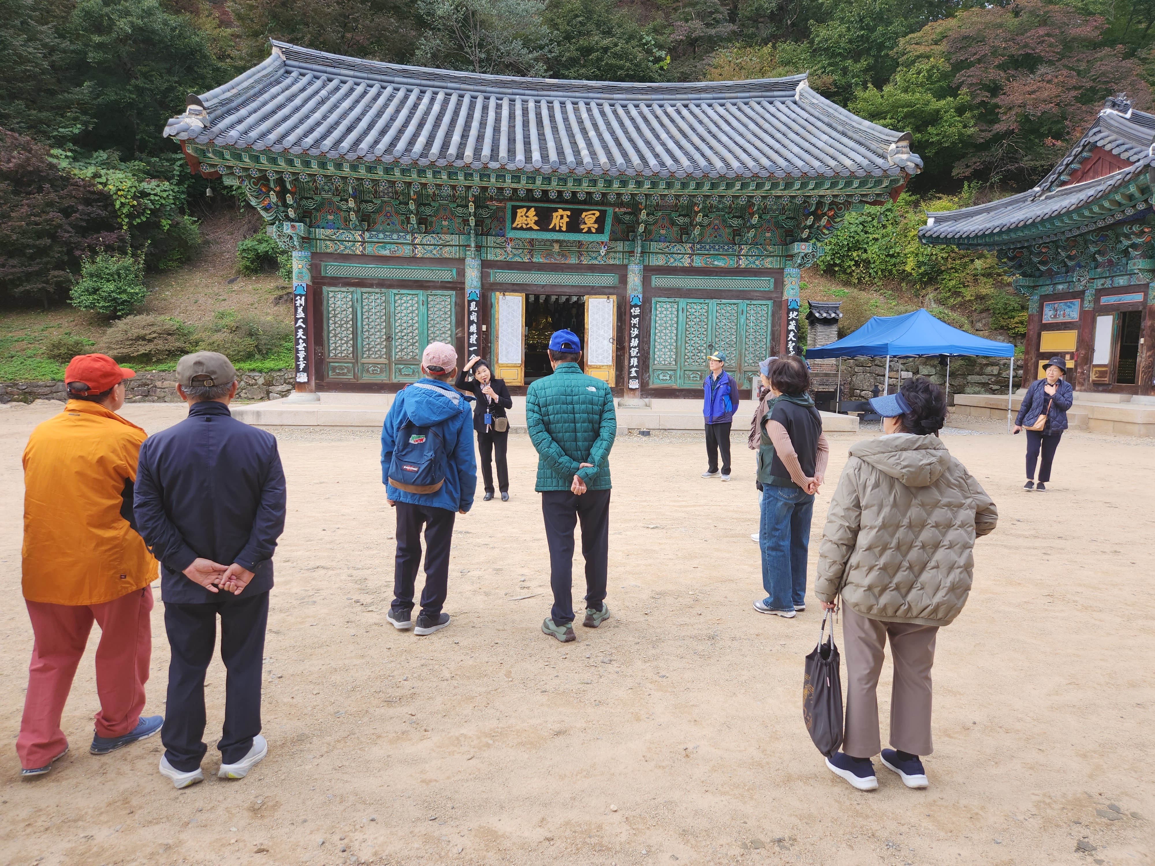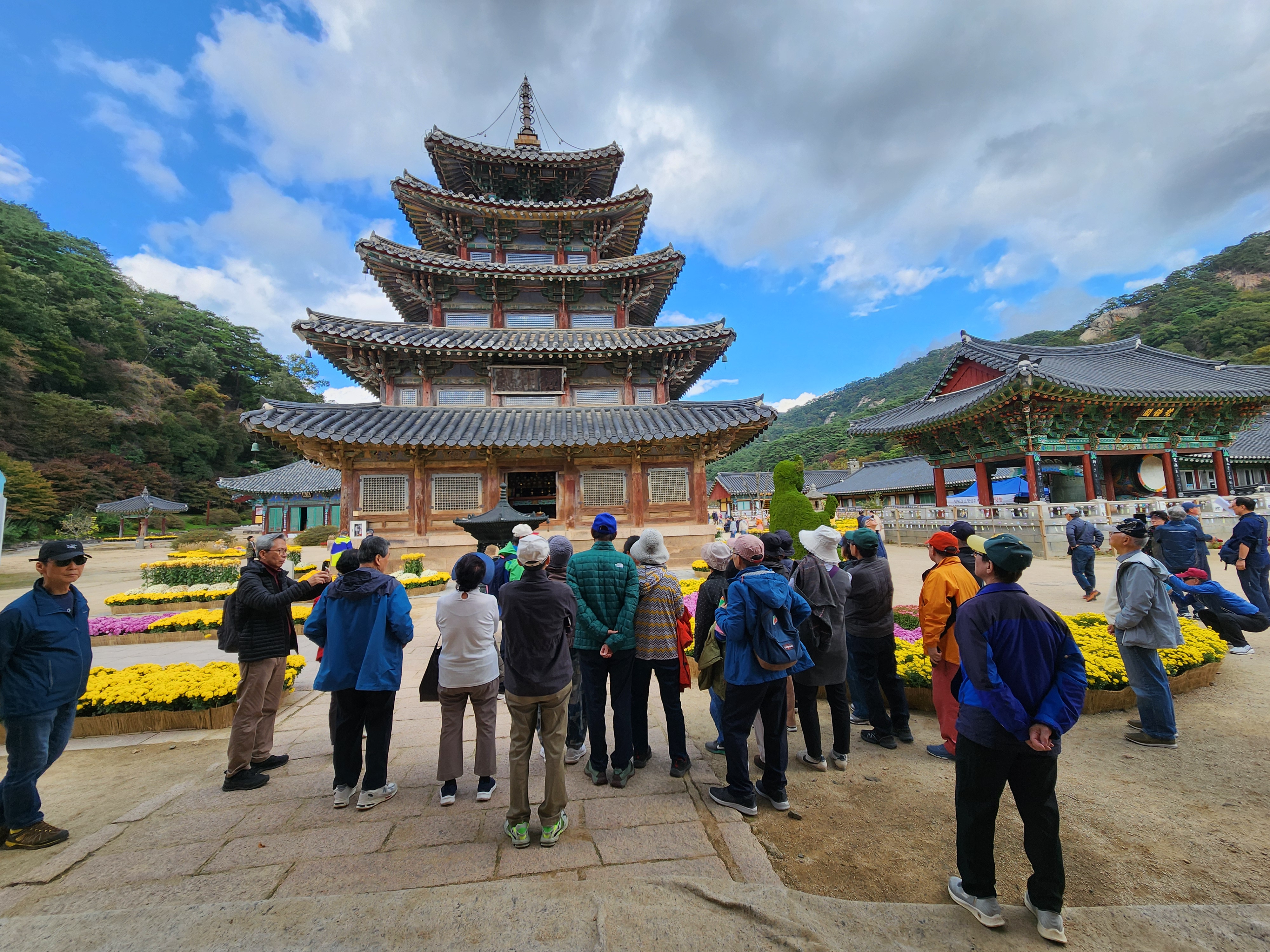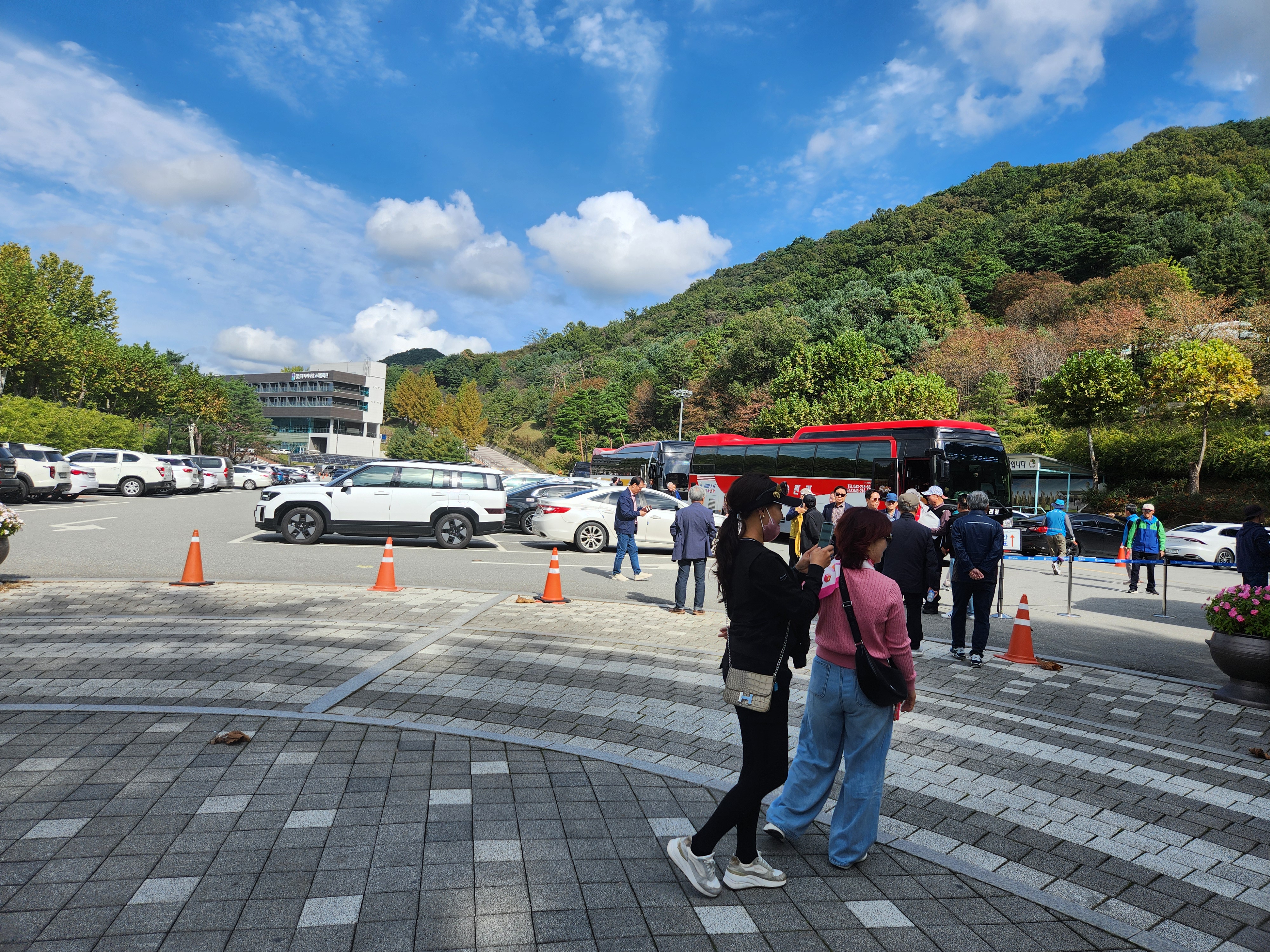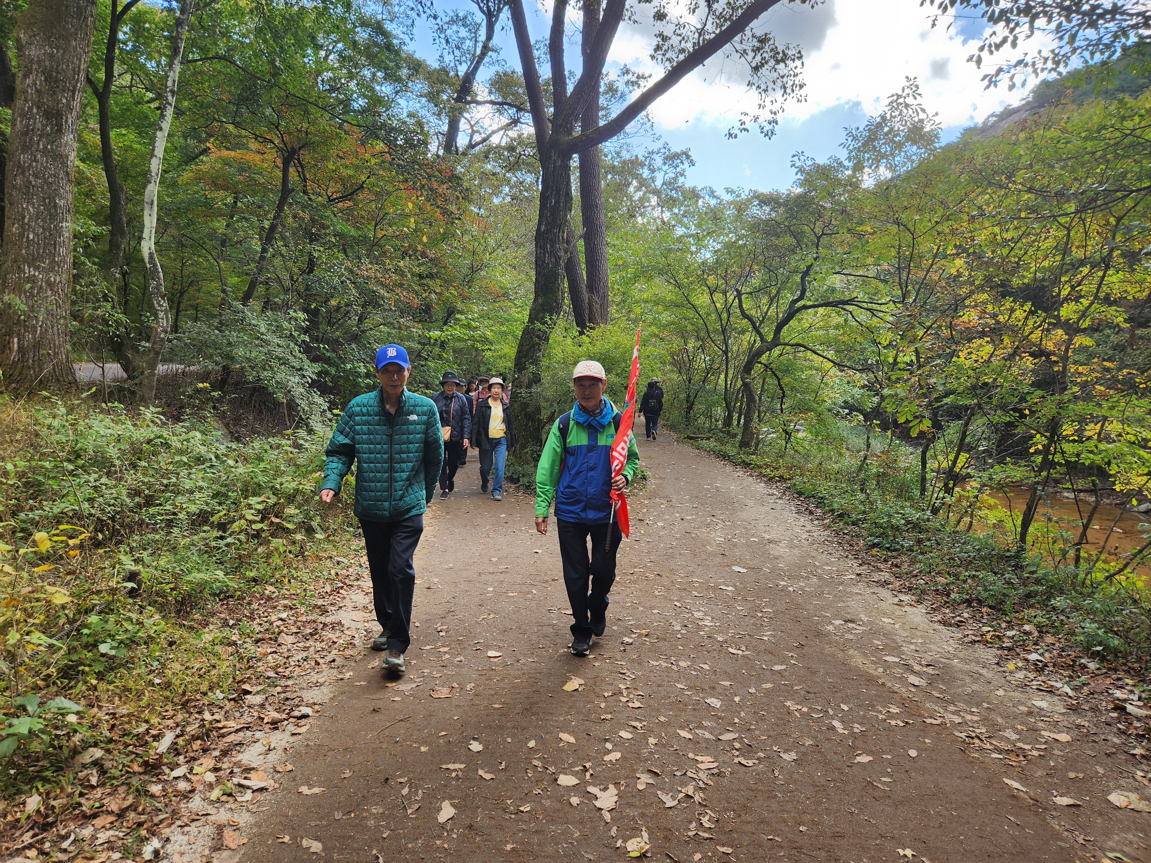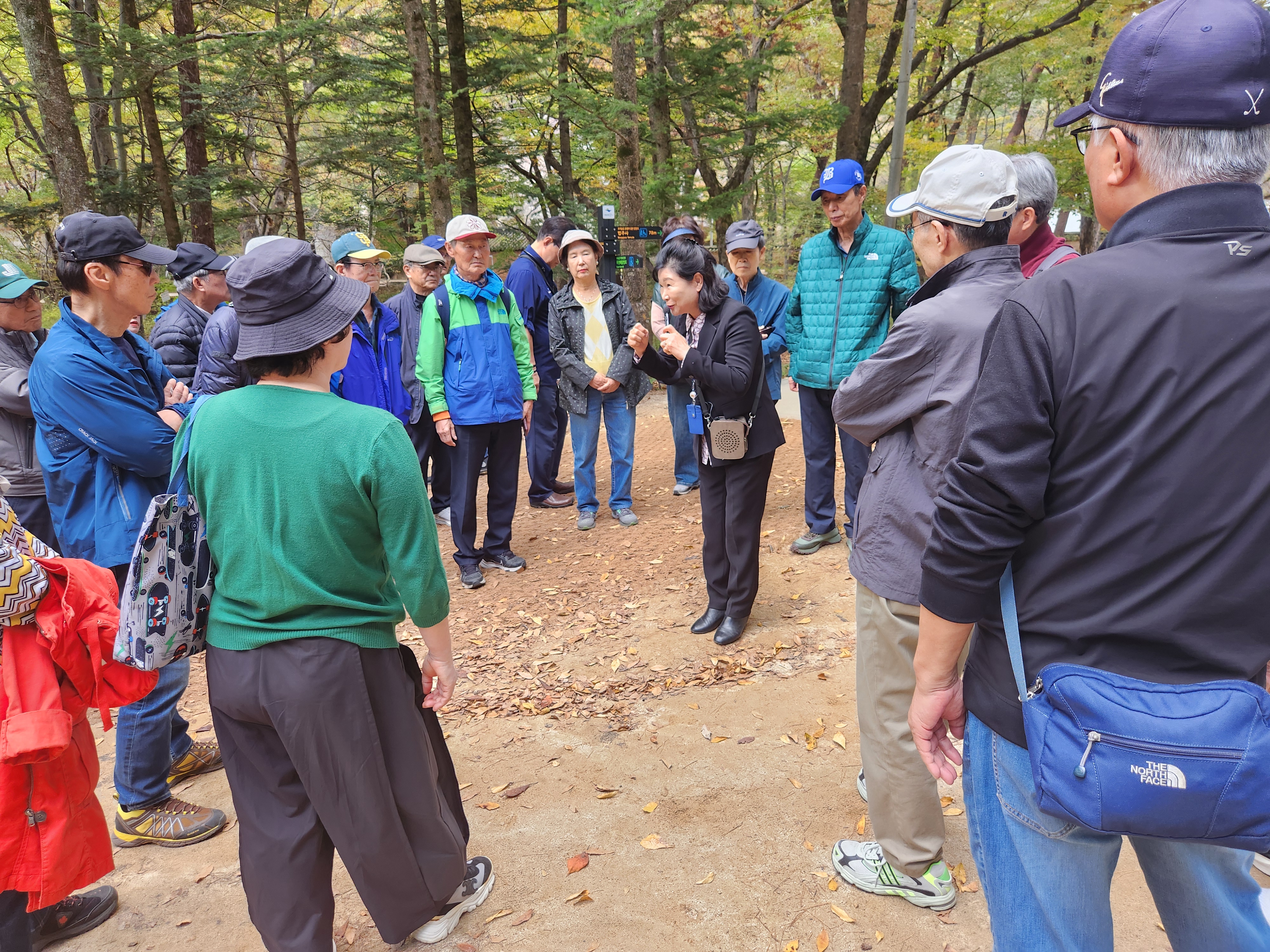 청산유수로 말씀하시는 해설을 듣고 몰랐던 사실들을 알게된 소중한 시간이었다. 회장단에서 수고하신 댓가로 수건을 선물하였다. 속리산 자락에 위치한 법주사는 병풍처럼 둘러싸인 산줄기와 어우러져 그 자체로도 아름답지만 단풍이 들면 더욱 그림같은 풍경이 펼쳐질 것으로 생각된다. 법주사를 뒤로하고 상경길에 오른다. 상경도중에 안성휴게소에서 각자 취향에 맞는 저녁식사를 하고 밤 8시경에 신분당선 상현역에서 각산진비하였다. 전형적인 가을 날씨로 여행하기에 더할나위 없었다. 어느 여행보다도 더 알차고 풍요로운 여행길이었다. 동문들 모두 즐거움과 행복이 가득하였다.