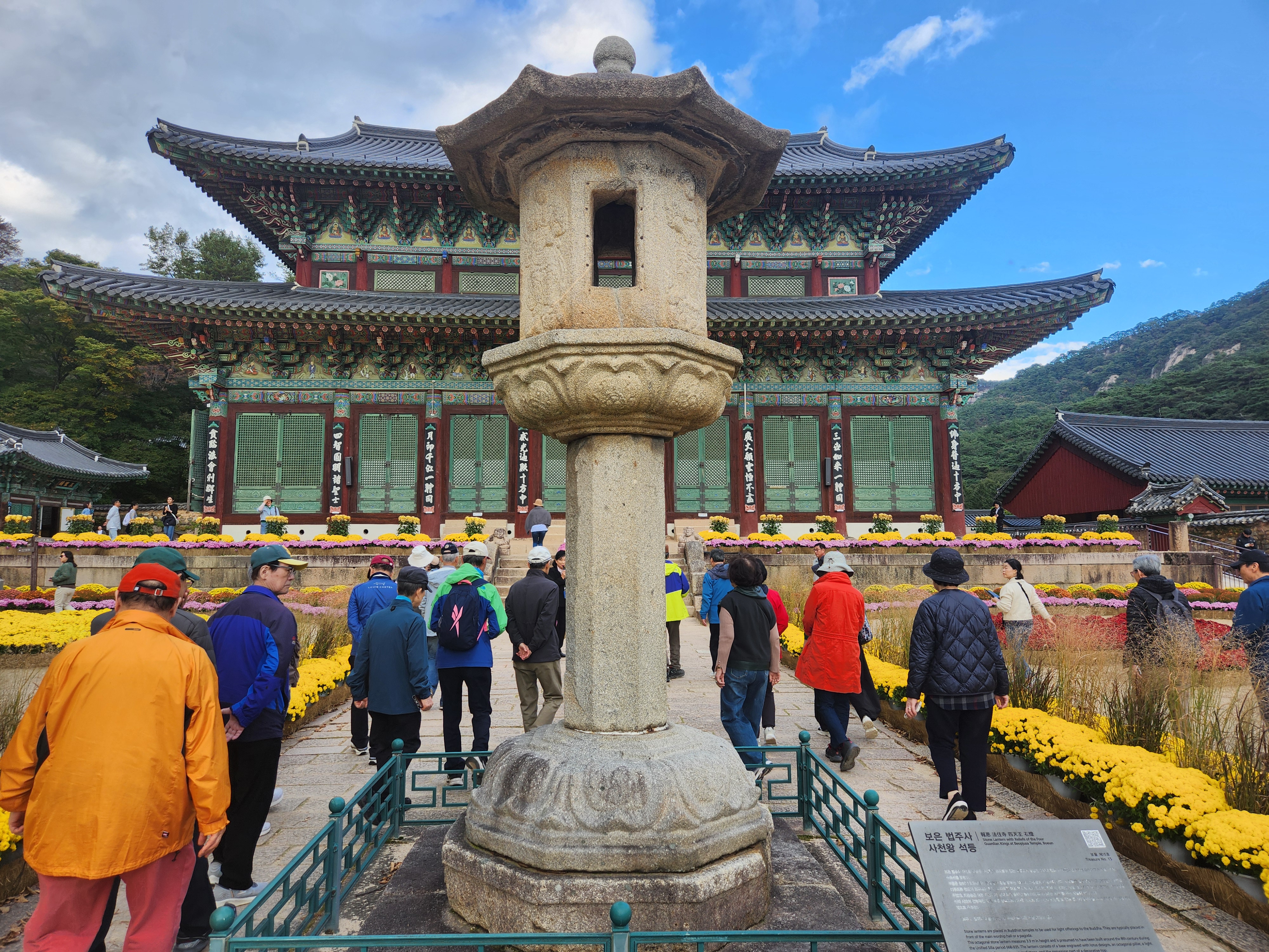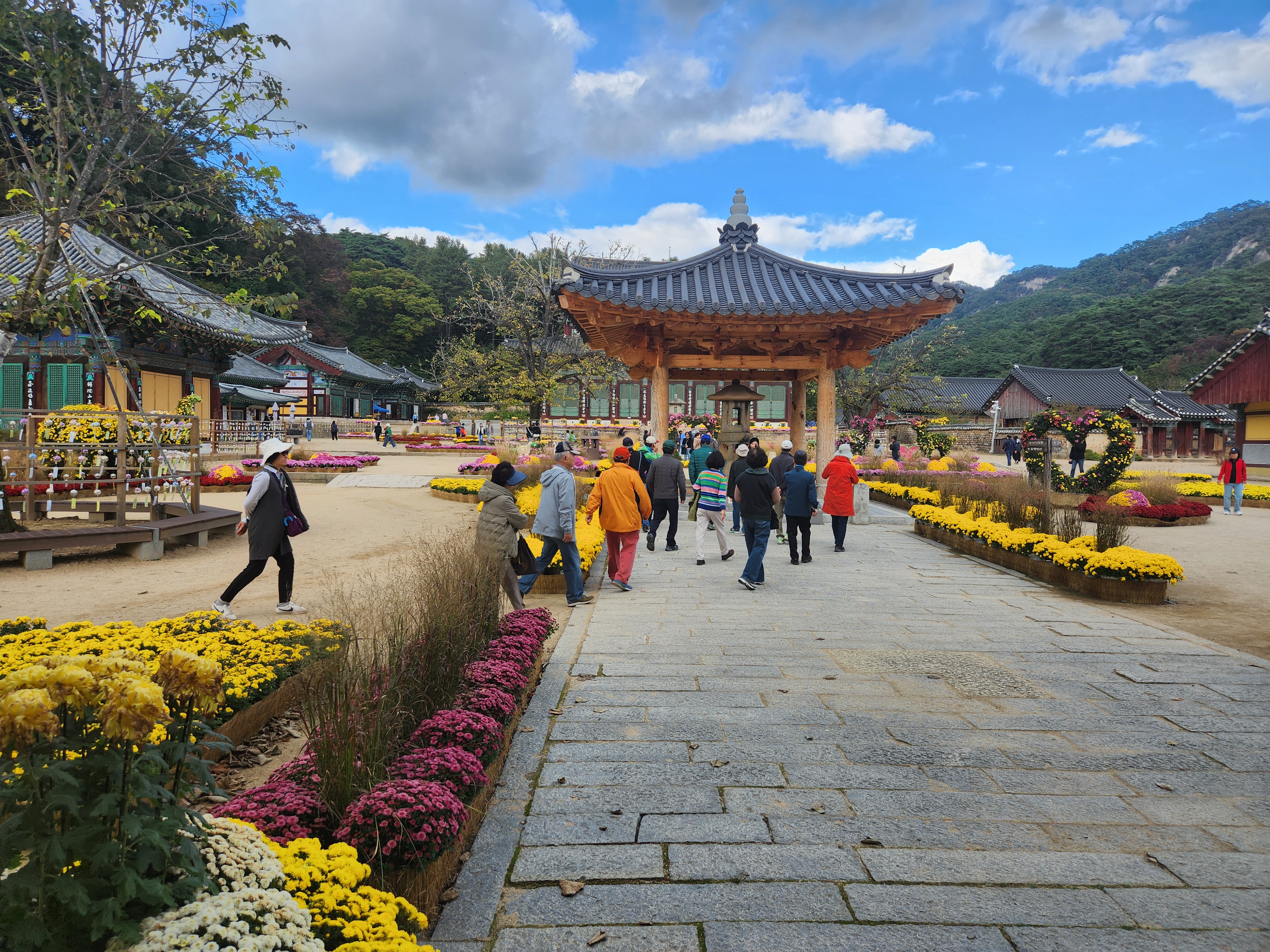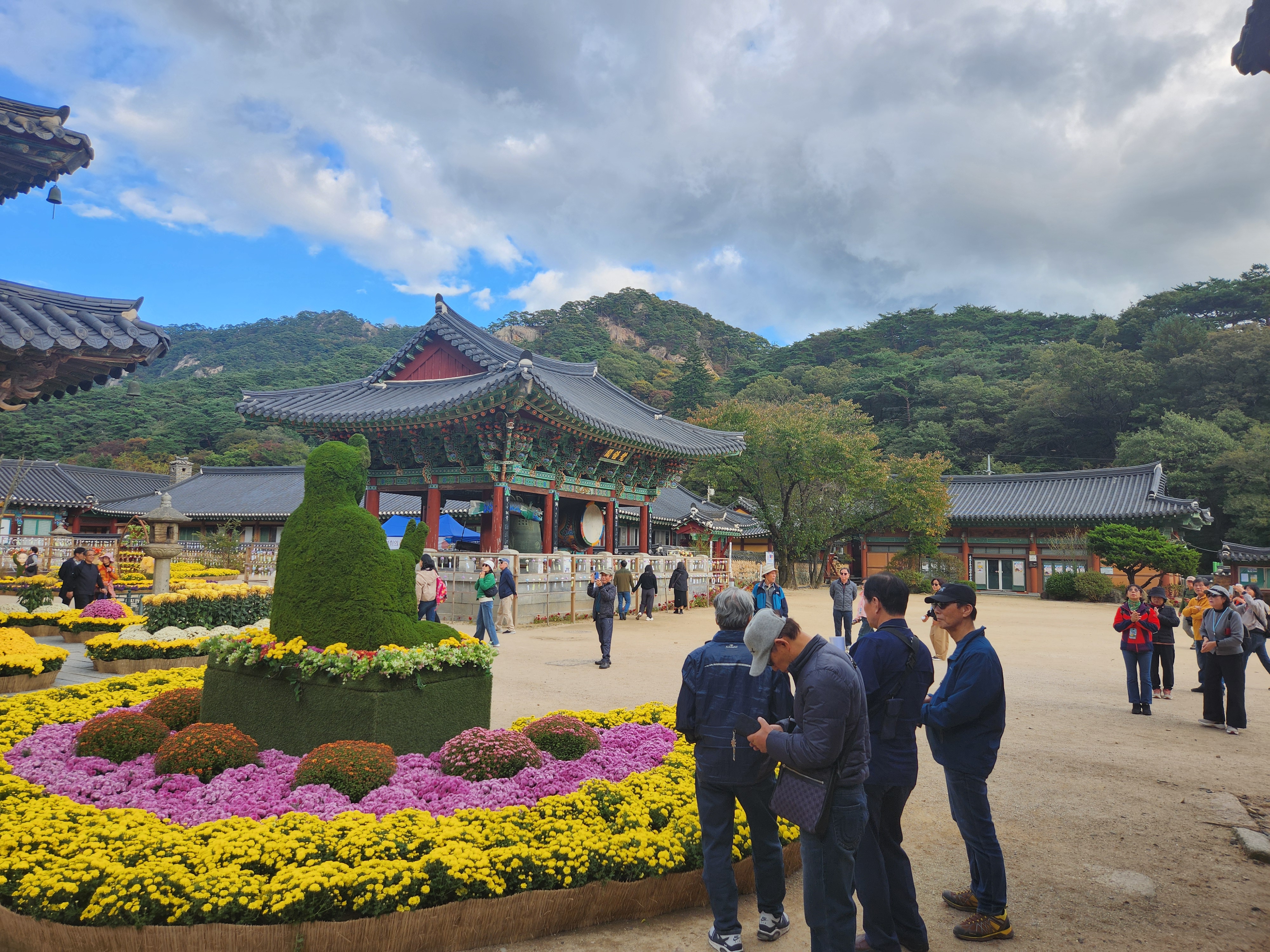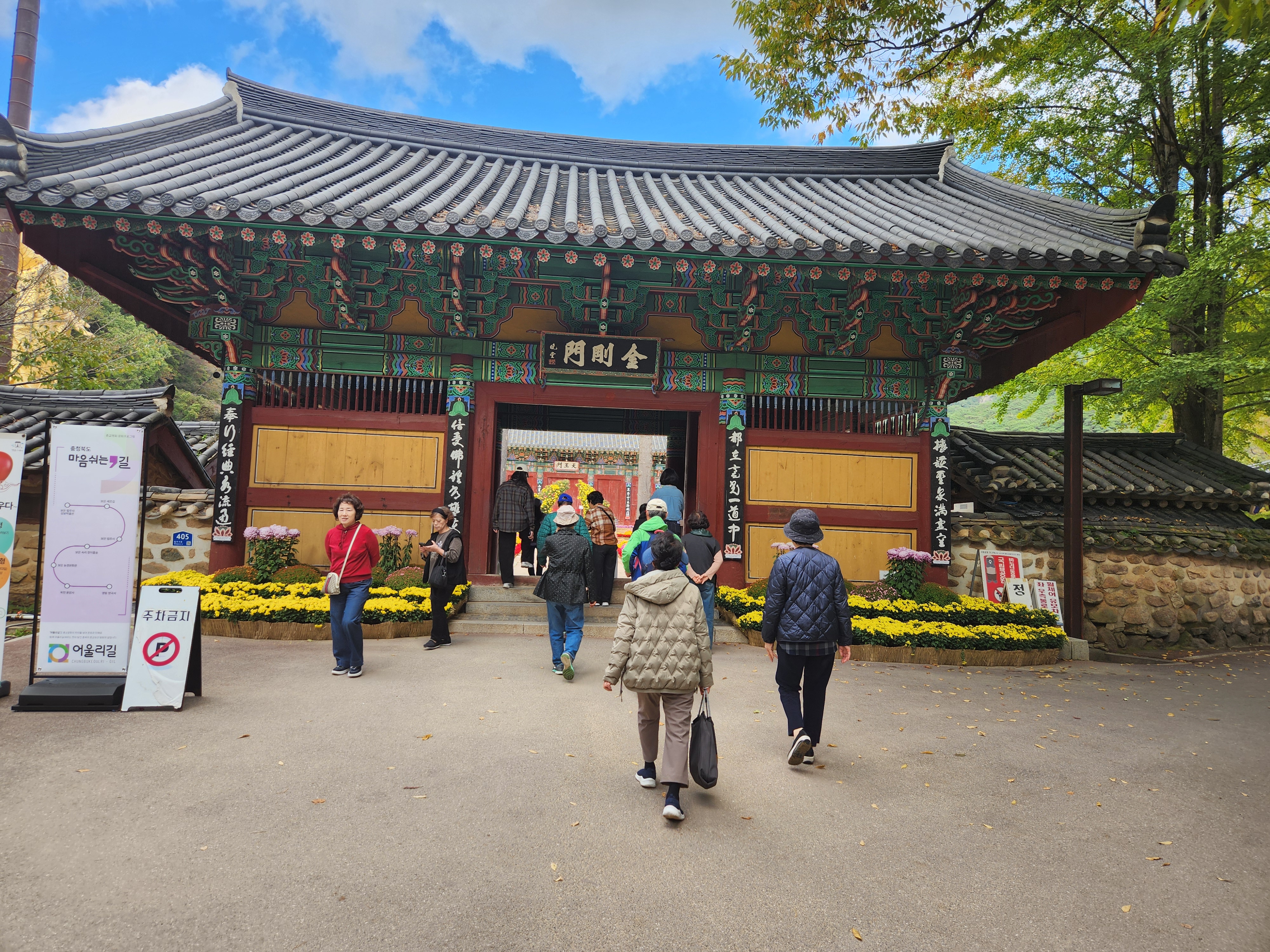 여성해설사는 나이가 드신 분으로 법주사의 역사에 대하여 자세히 설명하고 금강문을 통과하면 금동미륵대불과 천왕문이 한눈에 들어온다 법주사는 서기 553년 진흥왕 14년에 승려 의신이 창건한 천년고찰로 부처님의 법이 머문다'는 뜻을 가지고 있다. 임진왜란시 전소된 것을 유정이 팔상전을 중건하는 등 수차례에 걸쳐 중수를 거쳤다. 법주사를 지키는 천왕문(악귀들을 물리치는 사천왕상을 모신 곳)으로 가는 길 양옆으로 알록달록한 국화꽃으로 단장하였다. 국화꽃 전시회는 2025년 10월 16일부터 11월 말까지이다. 국화꽃이 아름다워 시선을 뗄 수 없다. 꽃은 누구나 다 좋아한다.