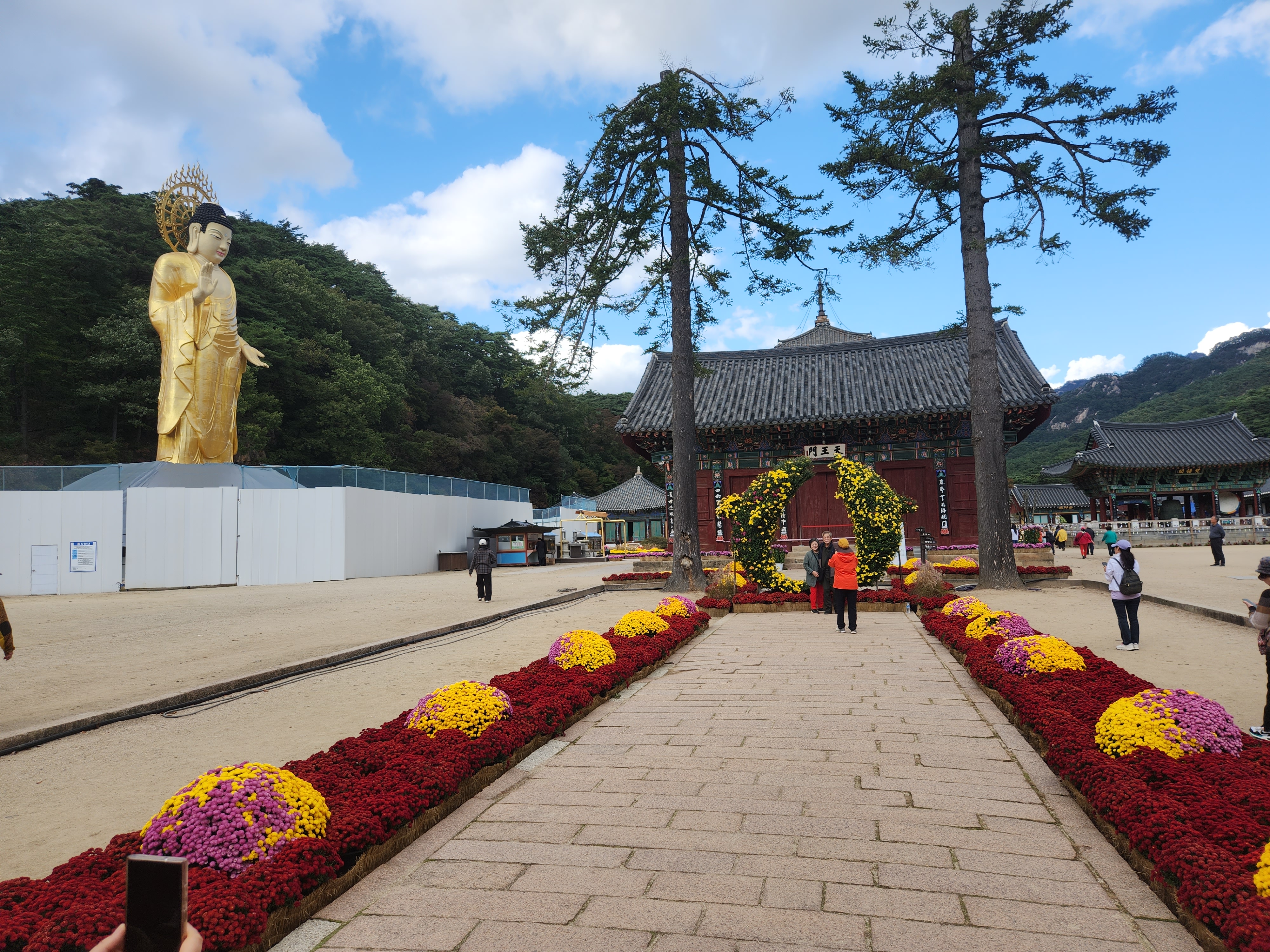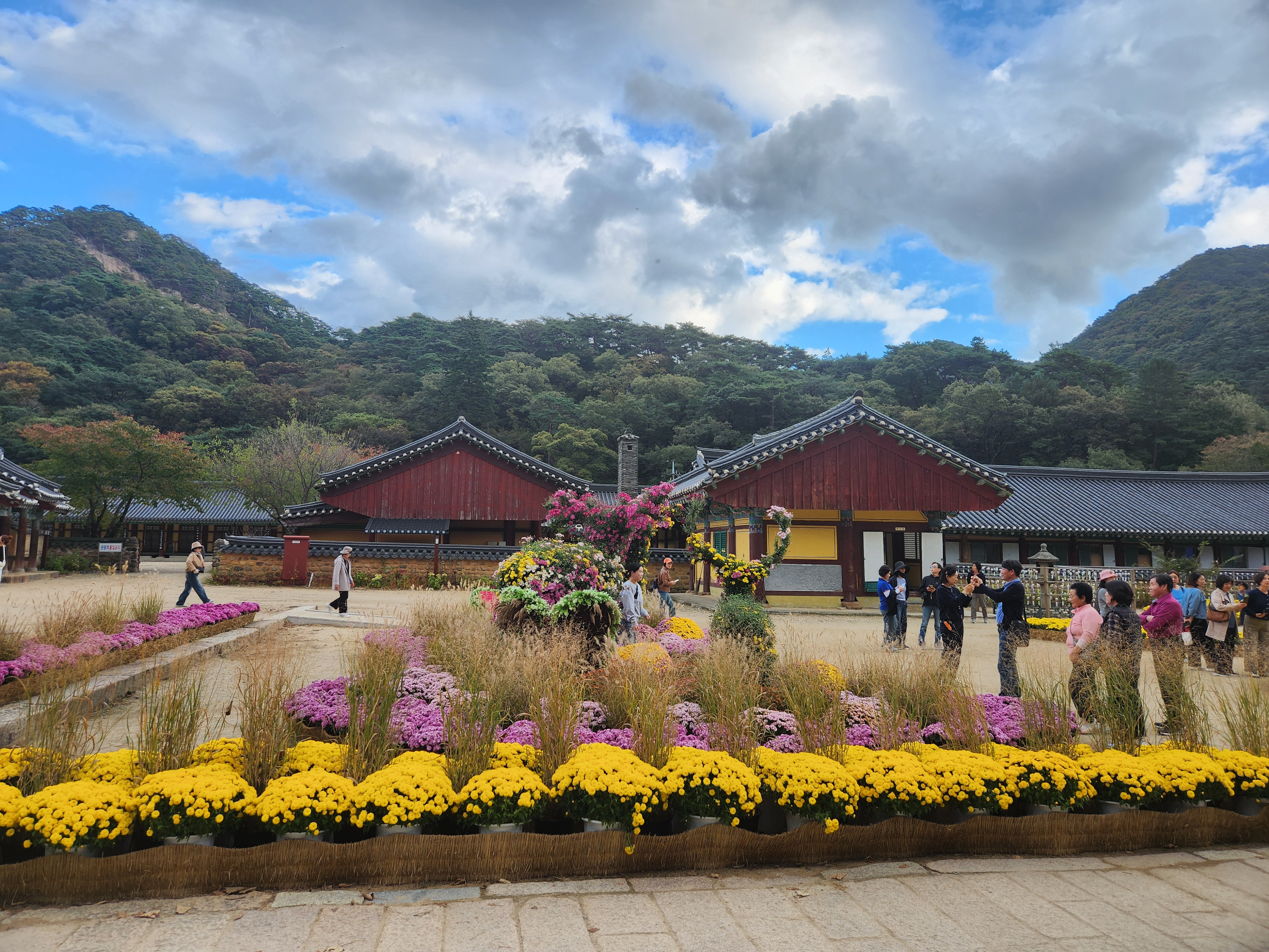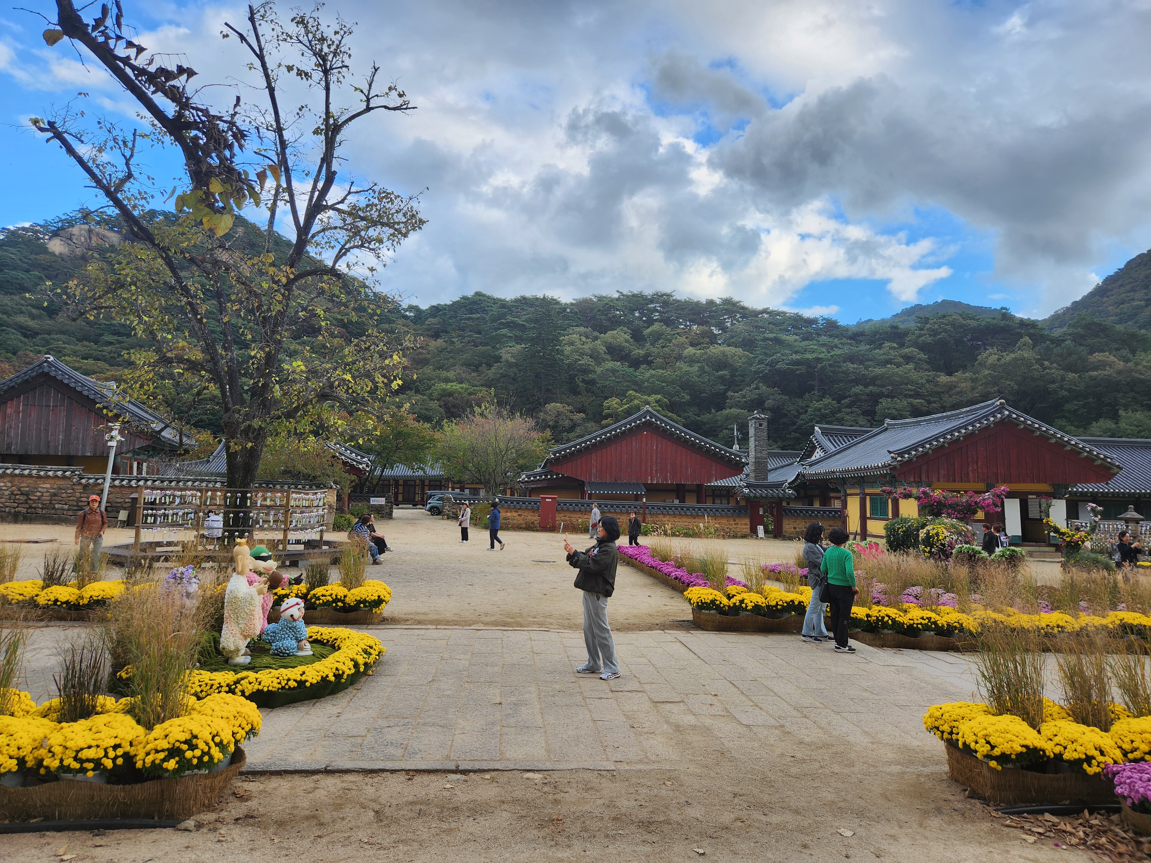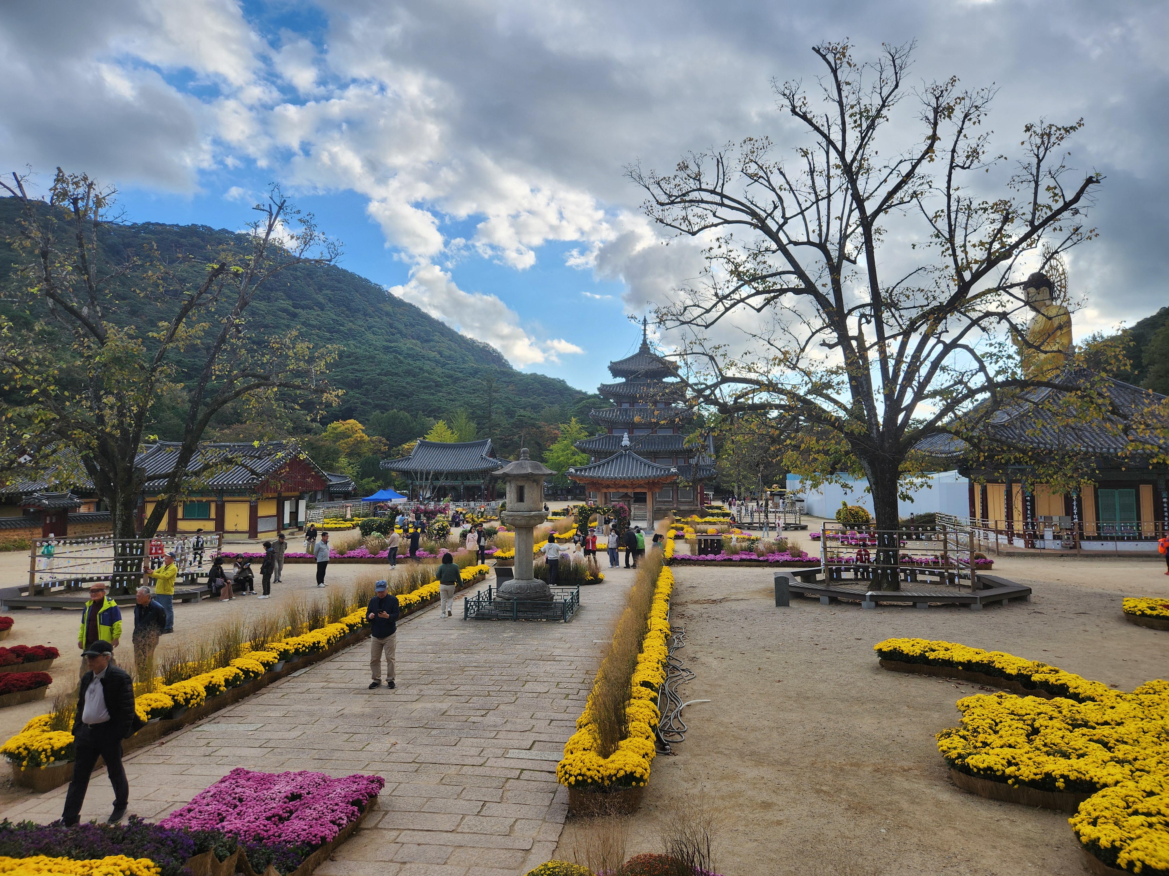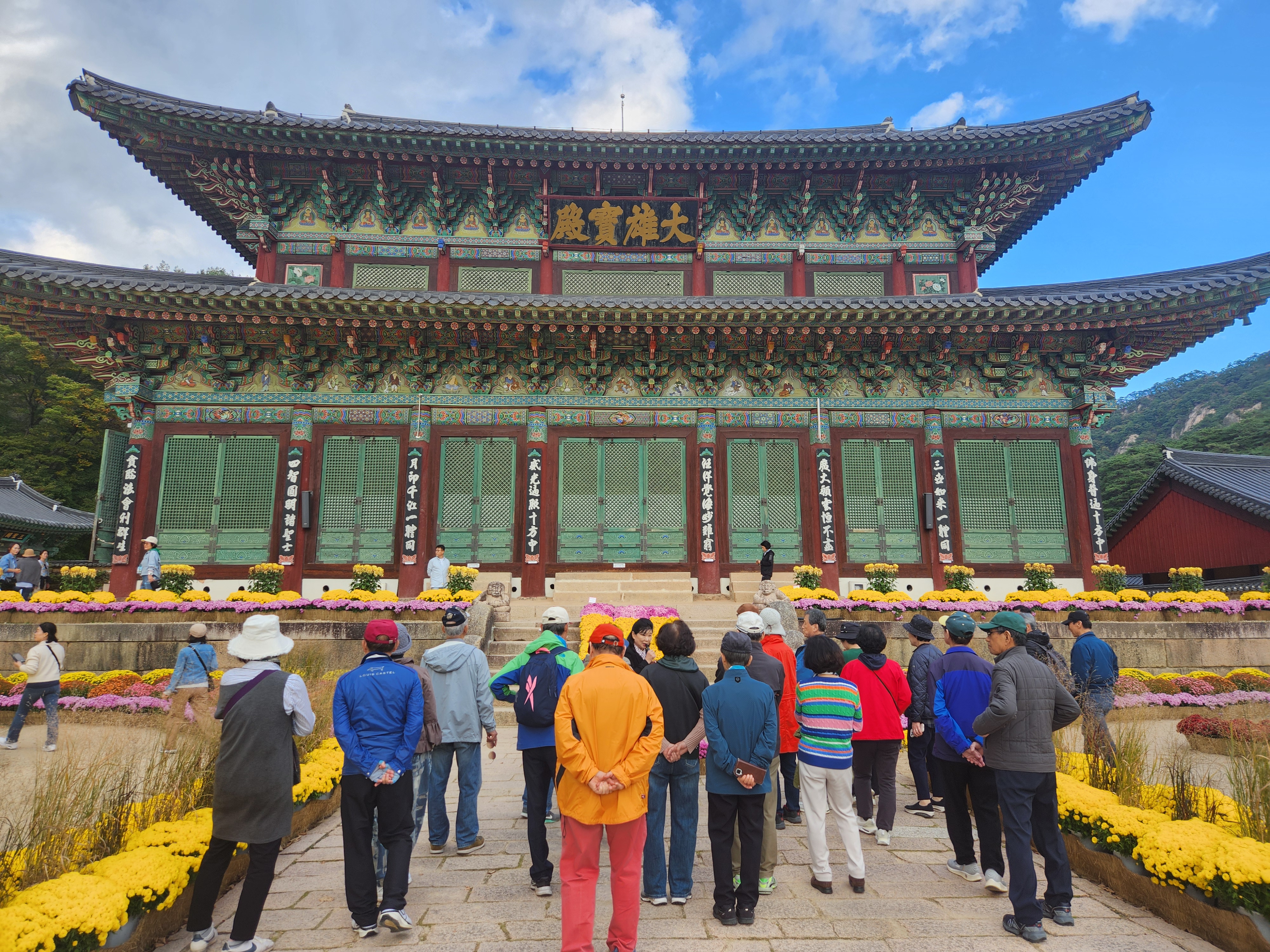 여성해설사는 나이가 드신 분으로 법주사의 역사에 대하여 자세히 설명하고 금강문을 통과하면 금동미륵대불과 천왕문이 한눈에 들어온다 법주사는 서기 553년 진흥왕 14년에 승려 의신이 창건한 천년고찰로 부처님의 법이 머문다'는 뜻을 가지고 있다. 임진왜란시 전소된 것을 유정이 팔상전을 중건하는 등 수차례에 걸쳐 중수를 거쳤다. 법주사를 지키는 천왕문(악귀들을 물리치는 사천왕상을 모신 곳)으로 가는 길 양옆으로 알록달록한 국화꽃으로 단장하였다. 국화꽃 전시회는 2025년 10월 16일부터 11월 말까지이다. 국화꽃이 아름다워 시선을 뗄 수 없다. 꽃은 누구나 다 좋아한다.