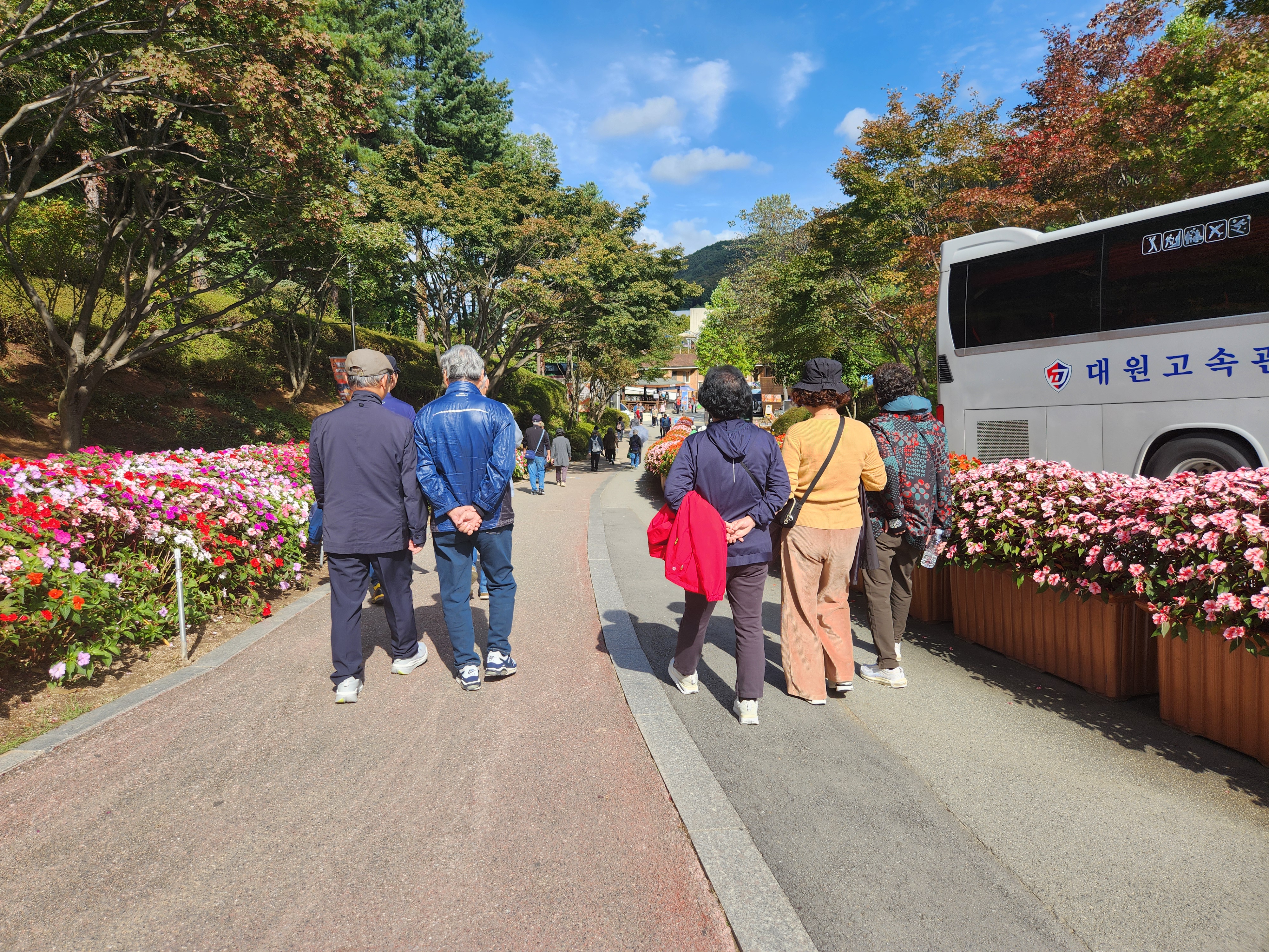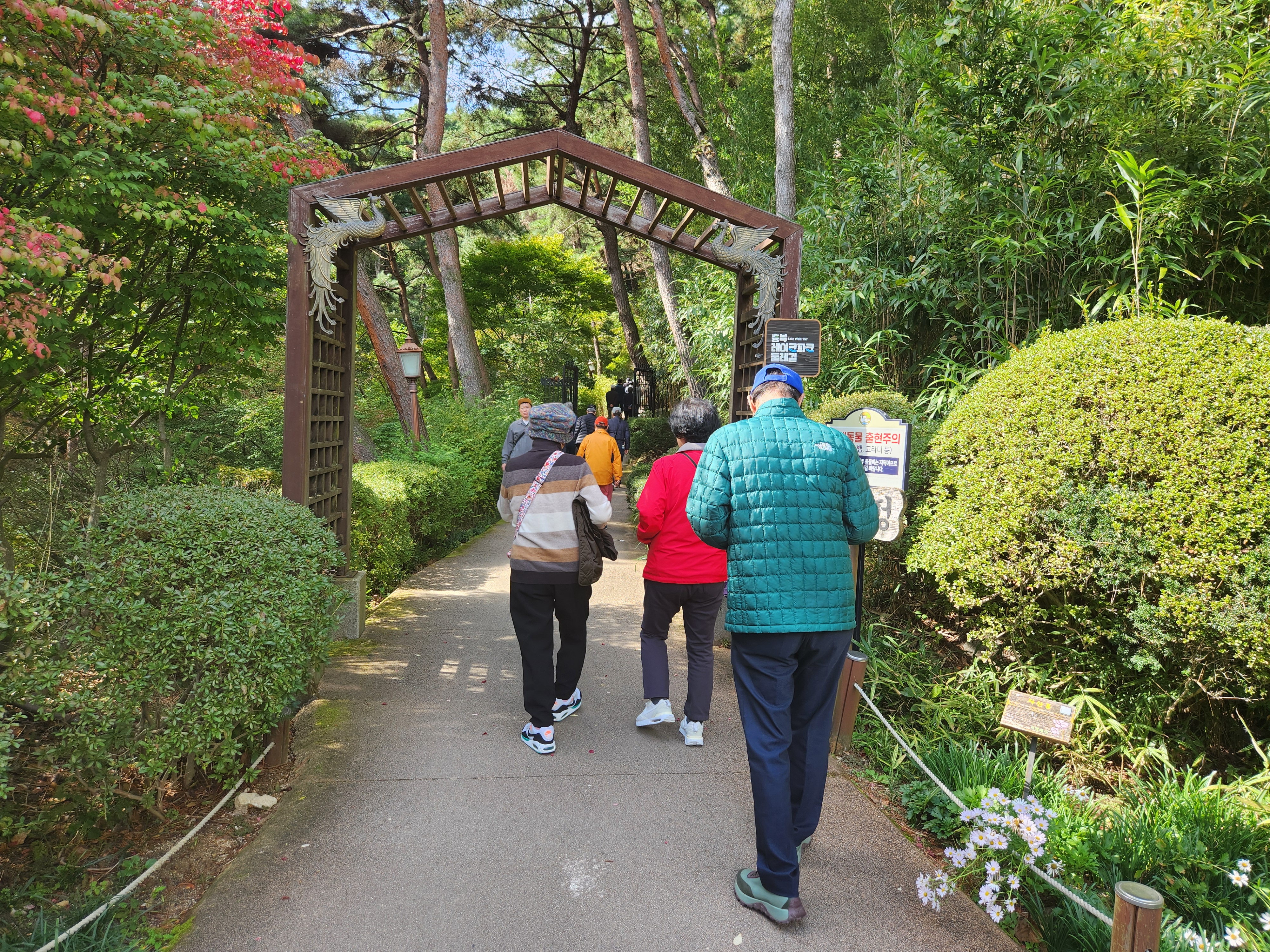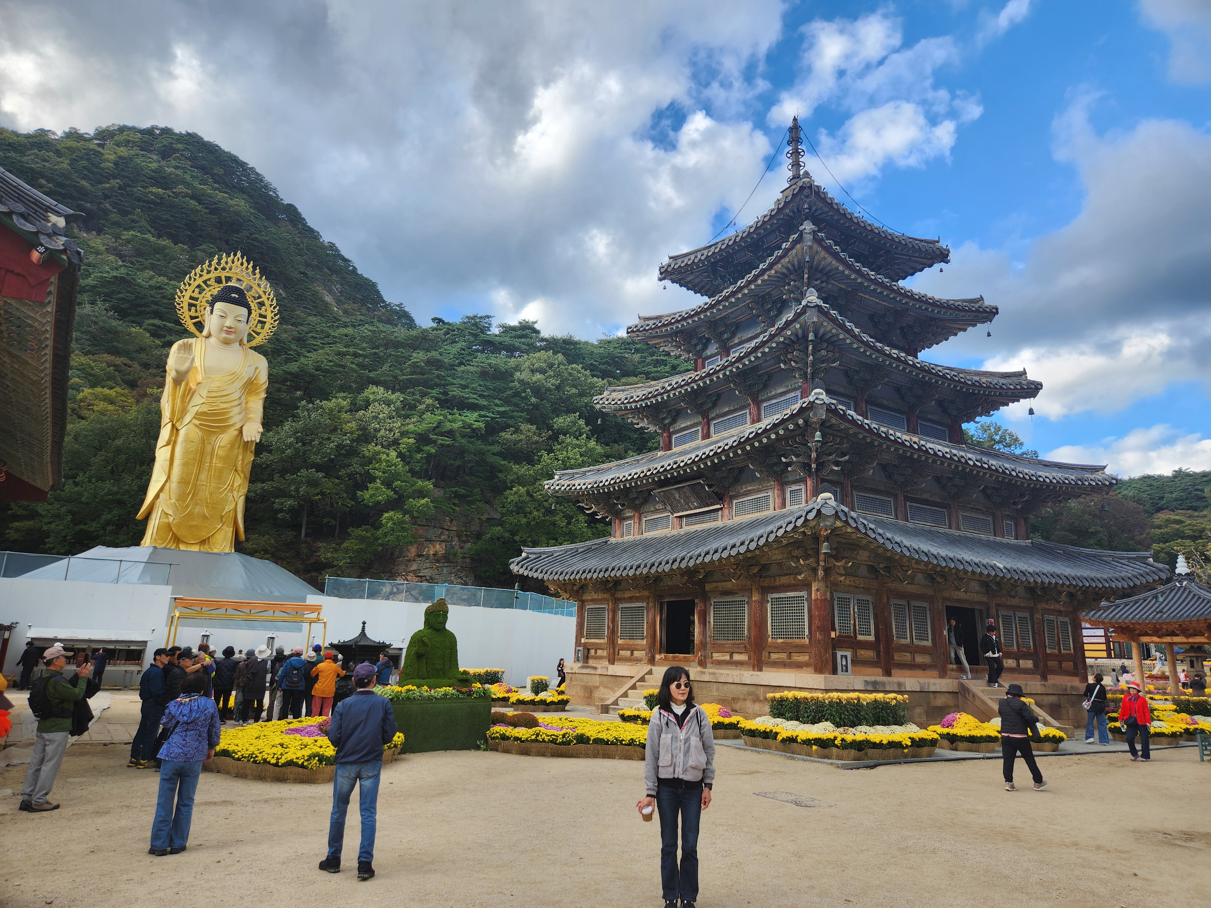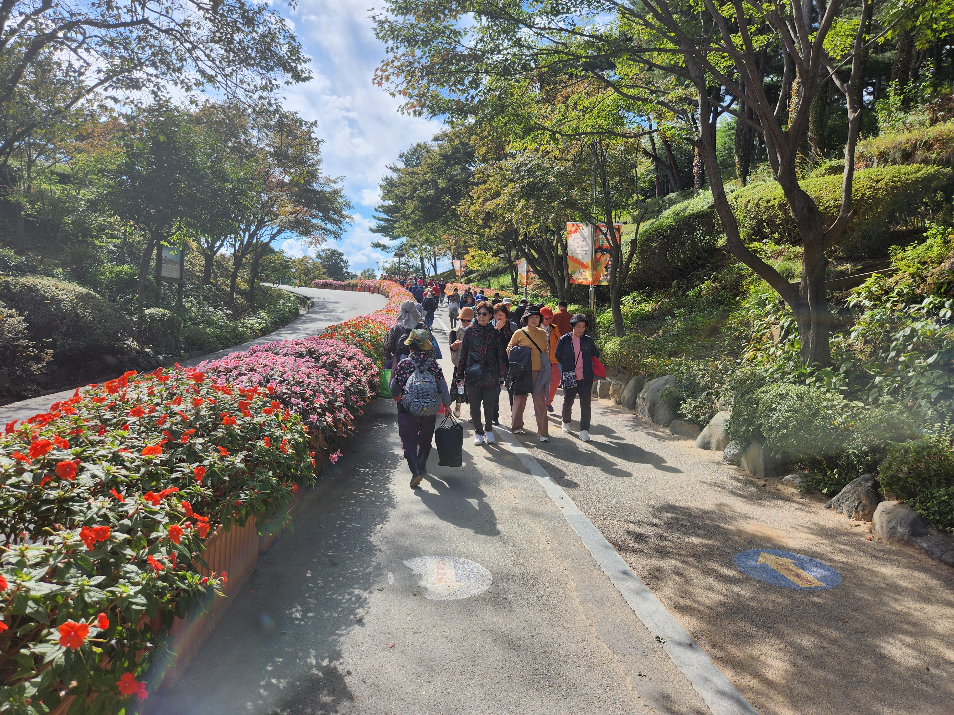 여성해설사는 나이가 드신 분으로 법주사의 역사에 대하여 자세히 설명하고 금강문을 통과하면 금동미륵대불과 천왕문이 한눈에 들어온다 법주사는 서기 553년 진흥왕 14년에 승려 의신이 창건한 천년고찰로 부처님의 법이 머문다'는 뜻을 가지고 있다. 임진왜란시 전소된 것을 유정이 팔상전을 중건하는 등 수차례에 걸쳐 중수를 거쳤다. 법주사를 지키는 천왕문(악귀들을 물리치는 사천왕상을 모신 곳)으로 가는 길 양옆으로 알록달록한 국화꽃으로 단장하였다. 국화꽃 전시회는 2025년 10월 16일부터 11월 말까지이다. 국화꽃이 아름다워 시선을 뗄 수 없다. 꽃은 누구나 다 좋아한다.
