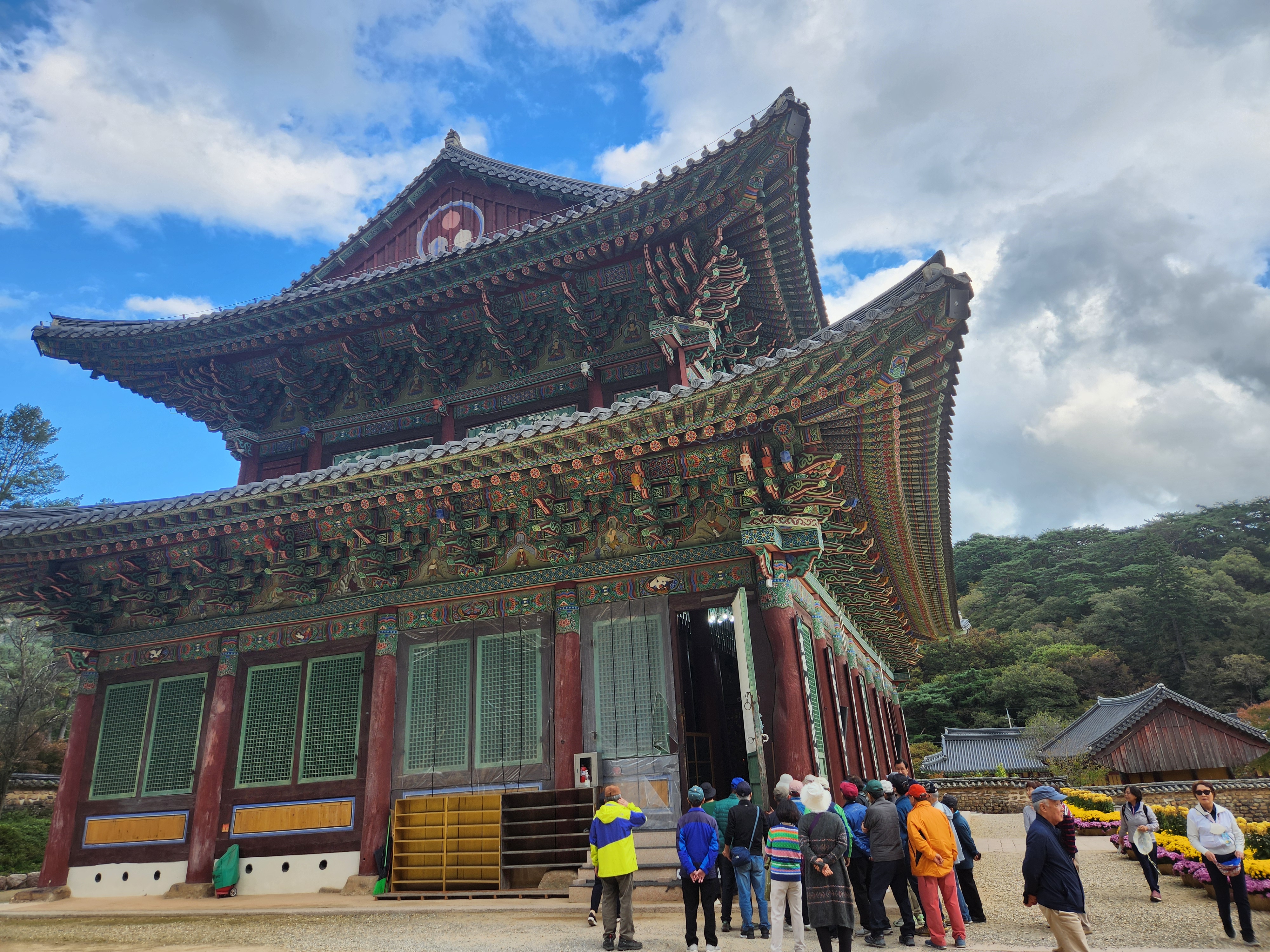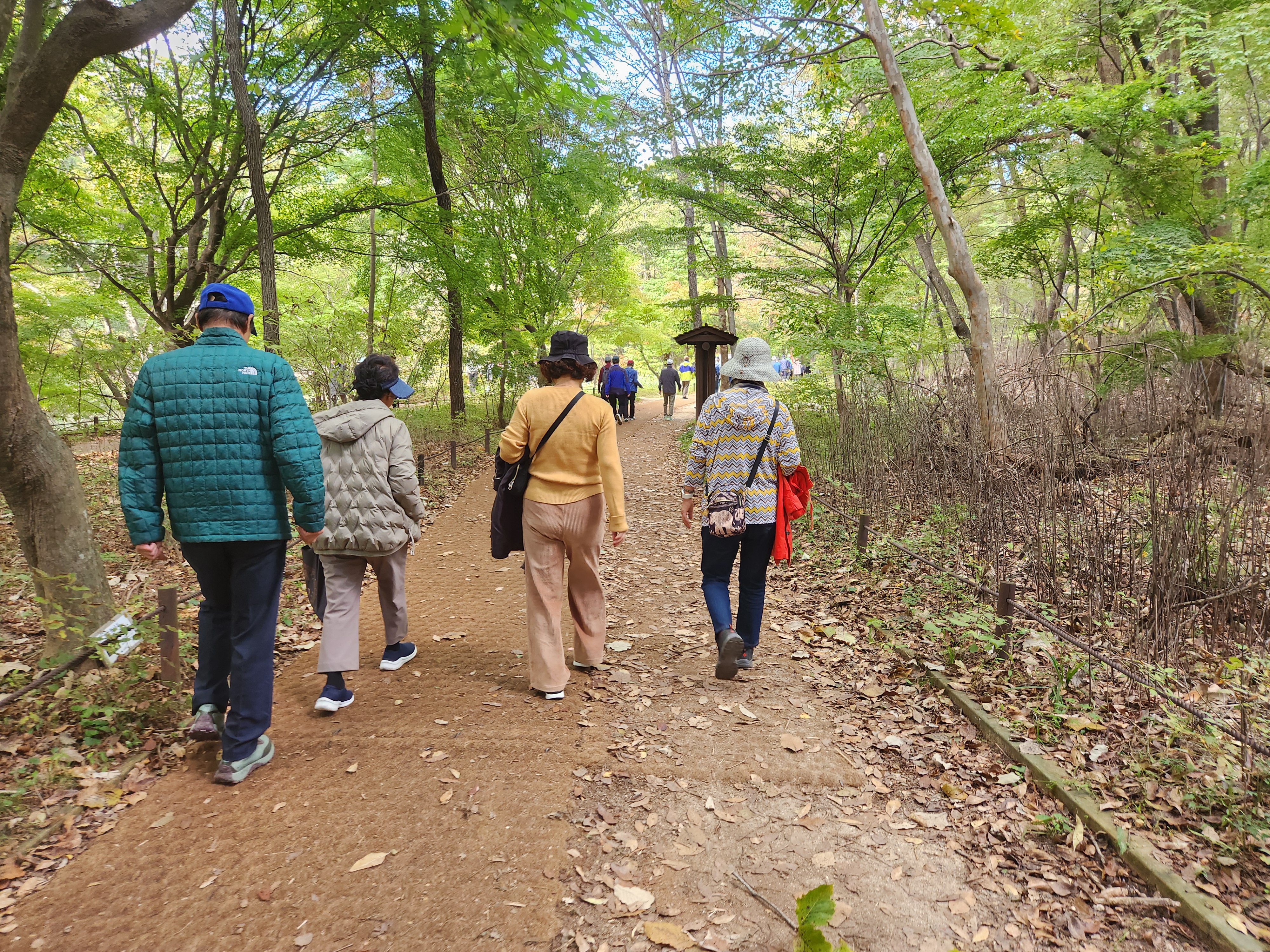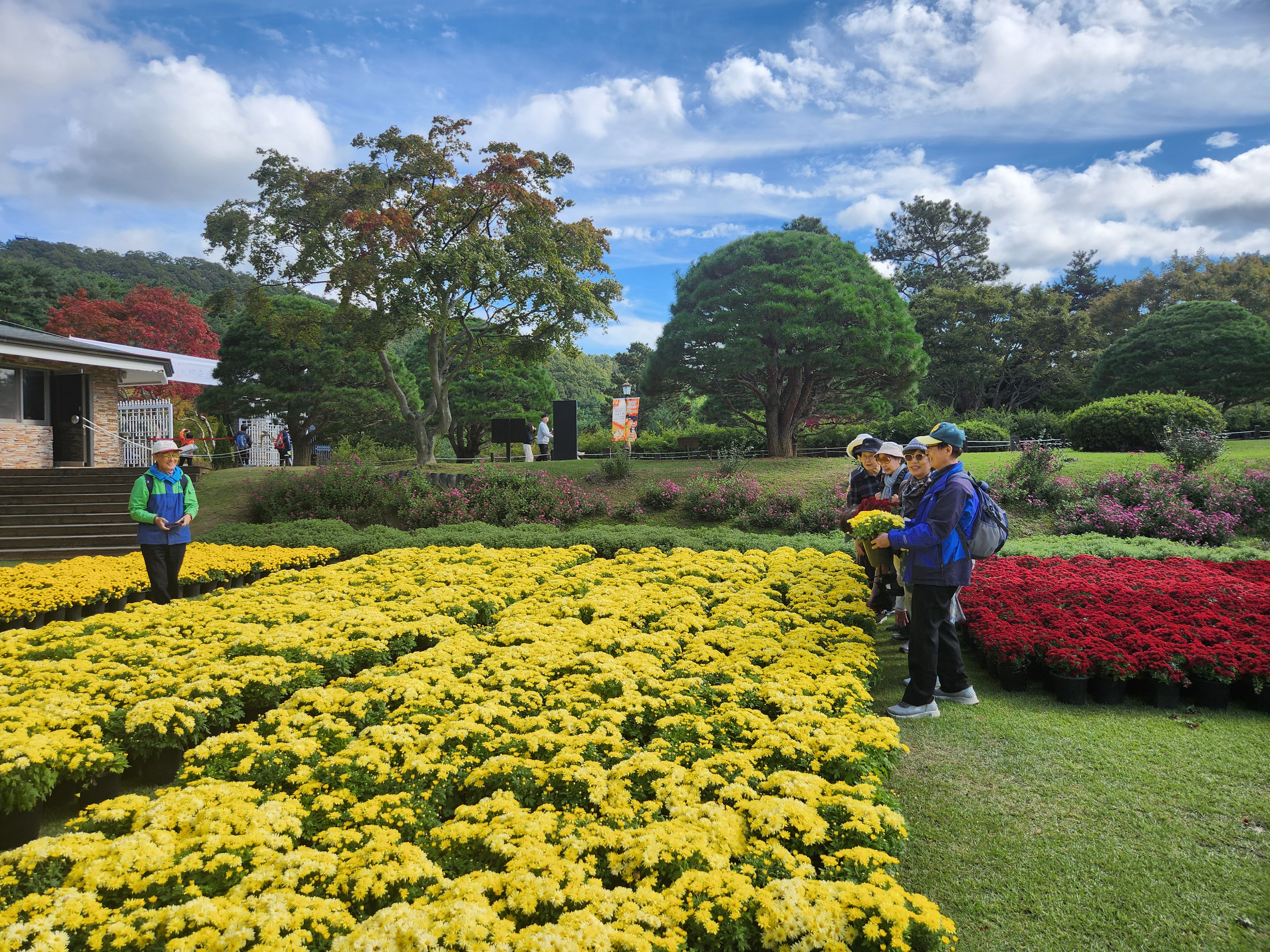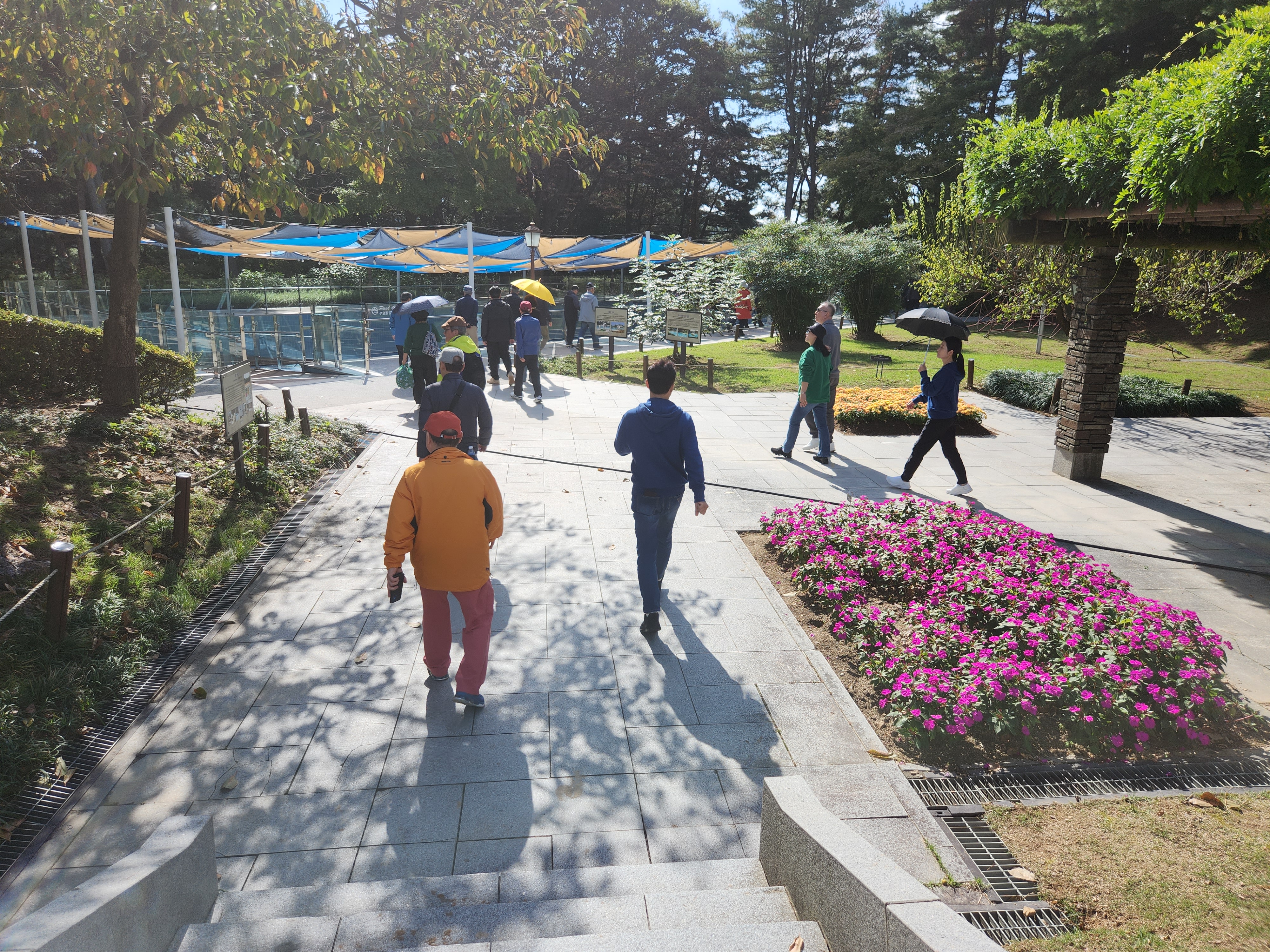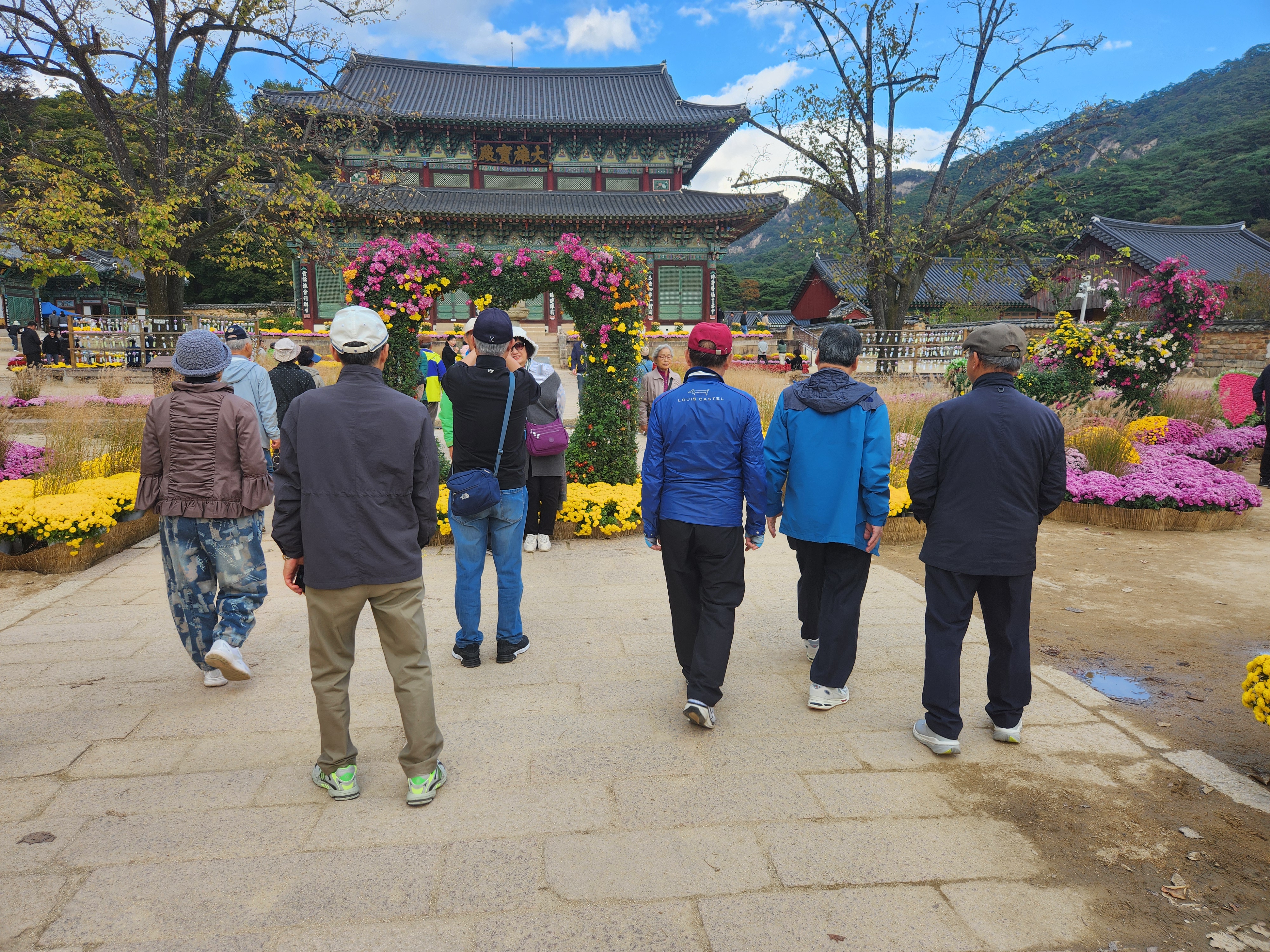 여성해설사는 나이가 드신 분으로 법주사의 역사에 대하여 자세히 설명하고 금강문을 통과하면 금동미륵대불과 천왕문이 한눈에 들어온다 법주사는 서기 553년 진흥왕 14년에 승려 의신이 창건한 천년고찰로 부처님의 법이 머문다'는 뜻을 가지고 있다. 임진왜란시 전소된 것을 유정이 팔상전을 중건하는 등 수차례에 걸쳐 중수를 거쳤다. 법주사를 지키는 천왕문(악귀들을 물리치는 사천왕상을 모신 곳)으로 가는 길 양옆으로 알록달록한 국화꽃으로 단장하였다. 국화꽃 전시회는 2025년 10월 16일부터 11월 말까지이다. 국화꽃이 아름다워 시선을 뗄 수 없다. 꽃은 누구나 다 좋아한다.