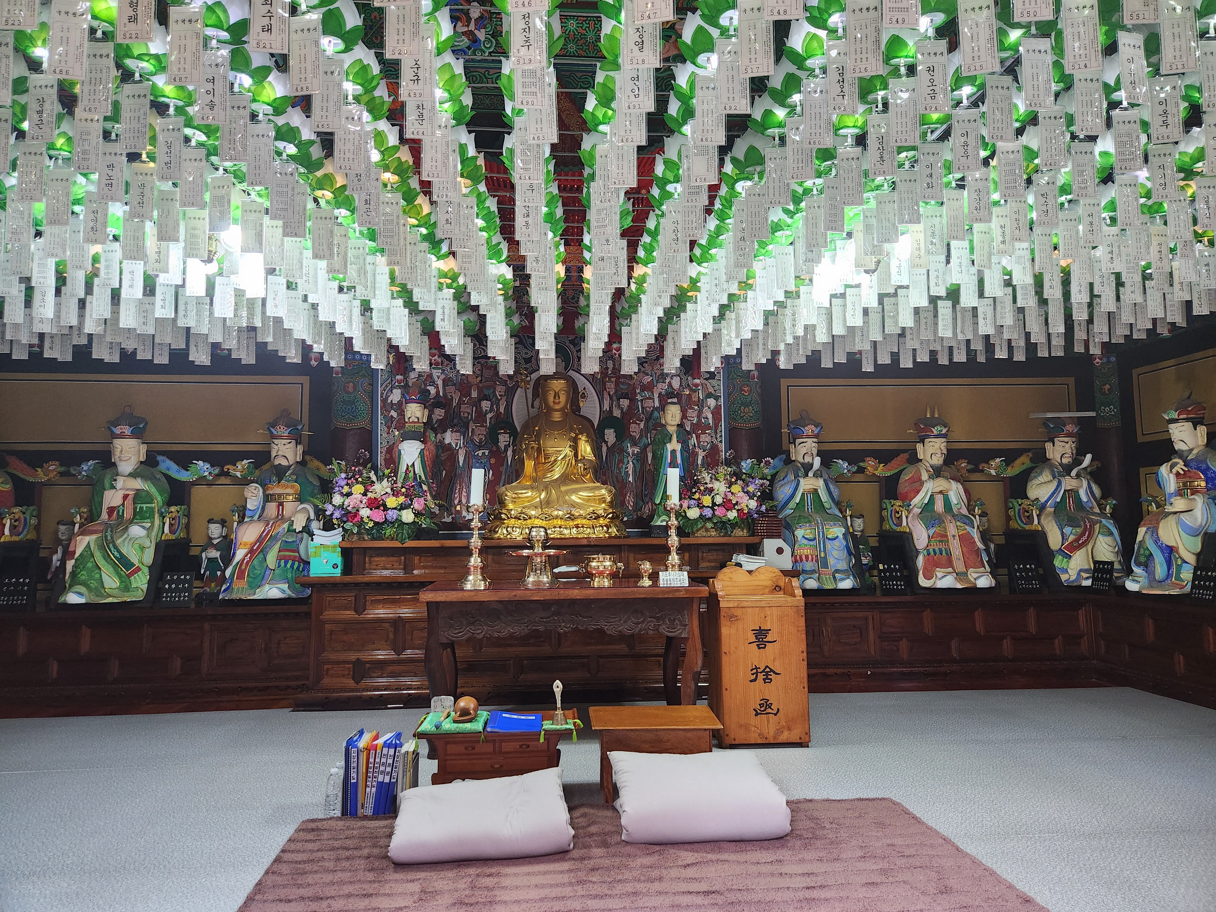 대웅보전에는 중앙에 본존불인 비로자나불, 왼쪽에는 노사나불, 오른쪽은 석가모니불이 모셔져 있다. 이 세분을 삼신불이라고 한다. 대웅보전을 떠받치는 기둥은 지진에도 견딜 수 있도록 기둥 밑에 돌로 단단하게 받치고 있는 점은 선조들의 지혜를 엿볼 수 있다. 대웅보전 옆에 명부전이 자리하고 있다. 명부전은 시왕의 이름과 다스리는 지옥이 표시된 이름표가 세워져 있다. 시왕은 저승의 지옥을 다스리는 10명의 법왕을 가리킨다. 명부전 중앙에는 지장보살상이 모셔져 있고 그 주변으로 지옥의 시왕들이 모셔져 있다. 명부전을 끝으로 해설사와 작별의 인사를 나누었다.