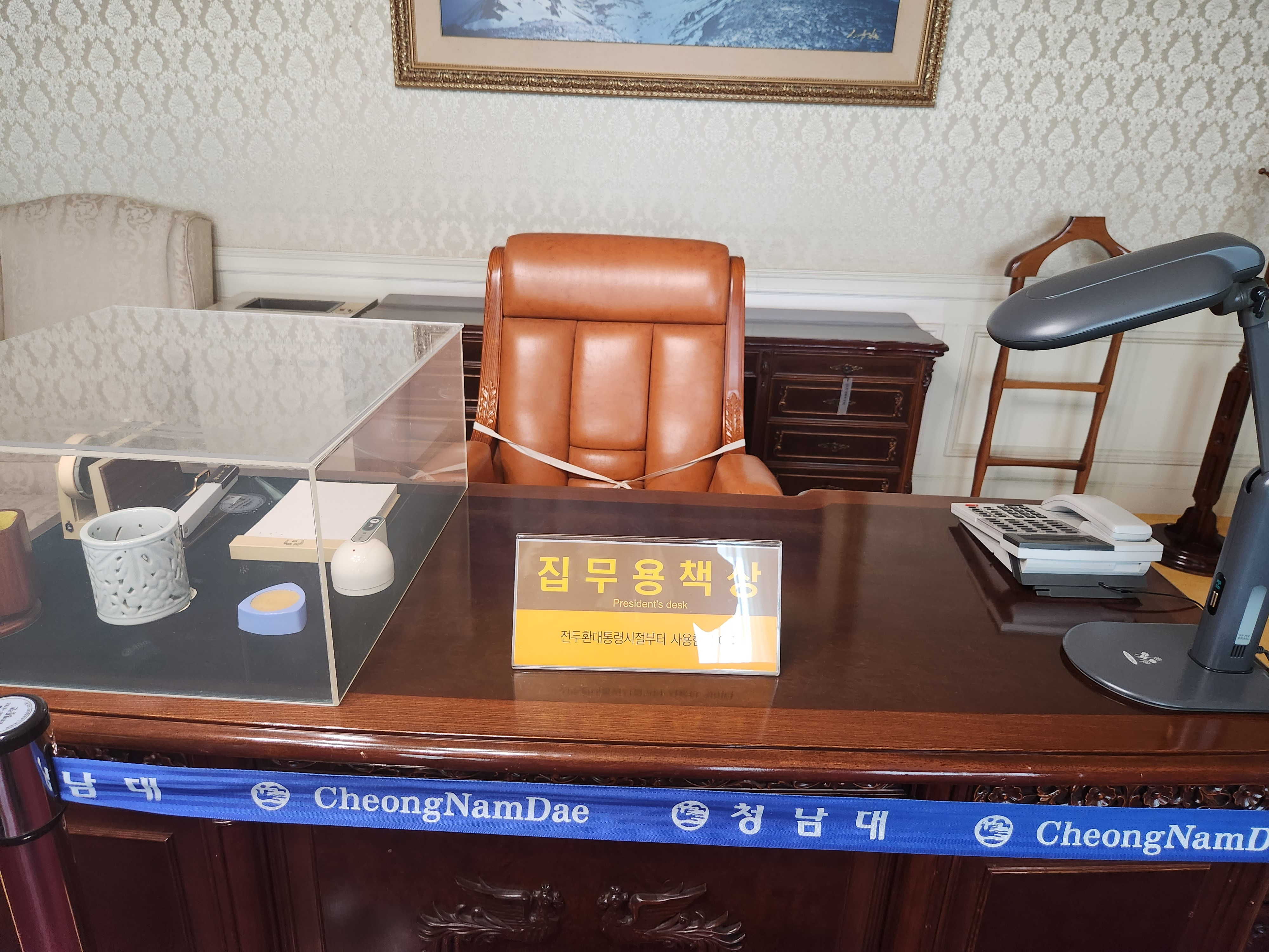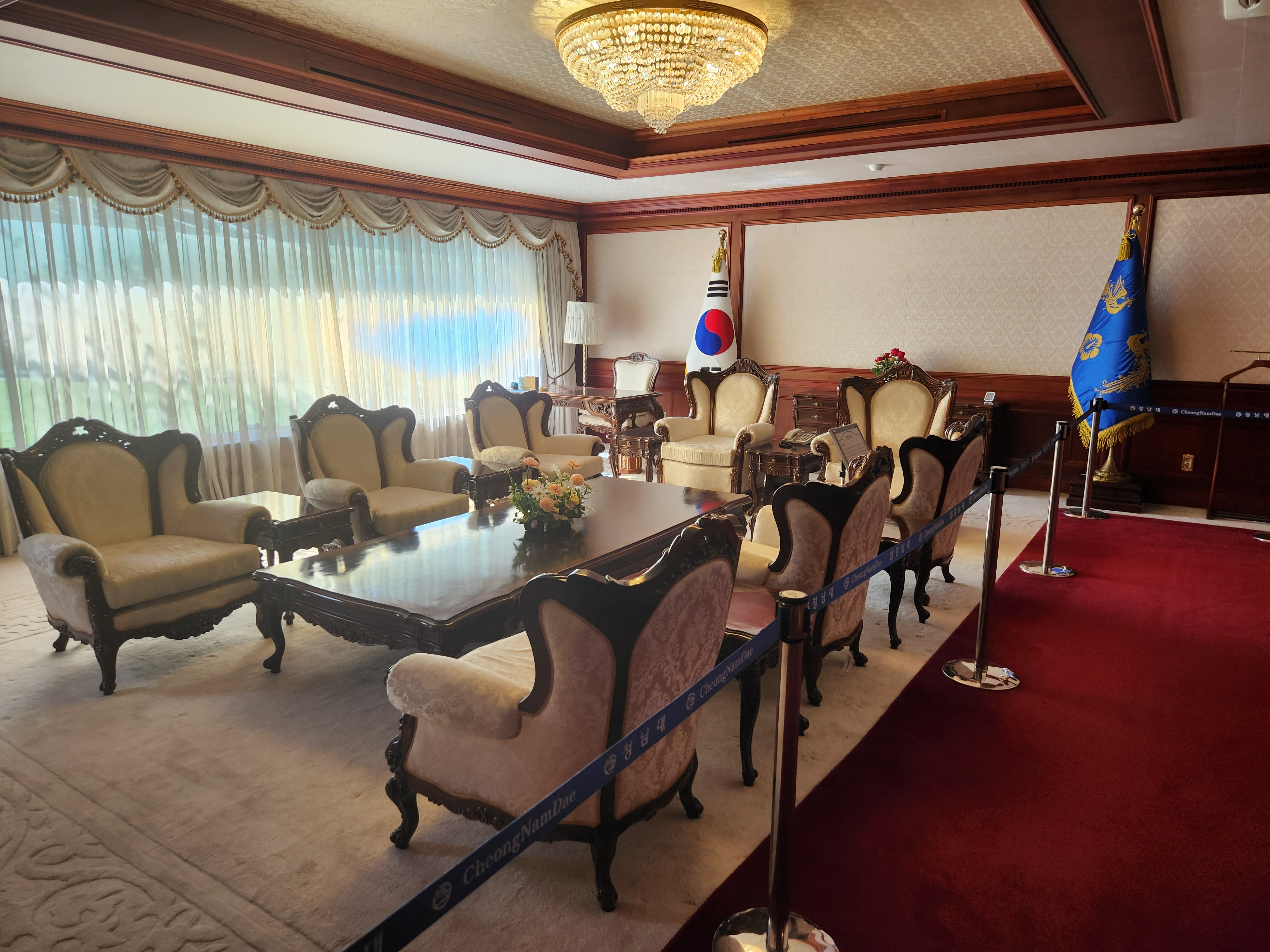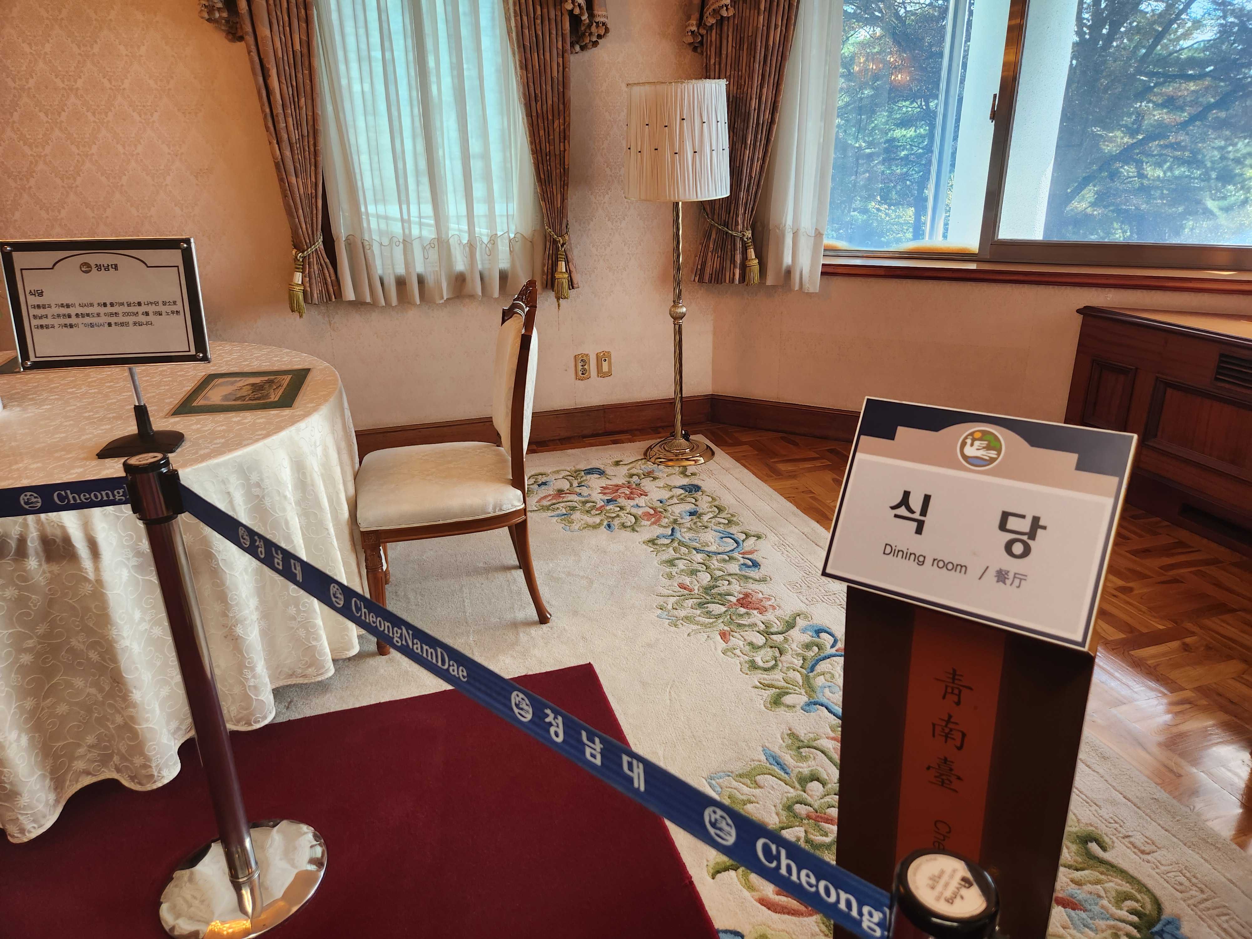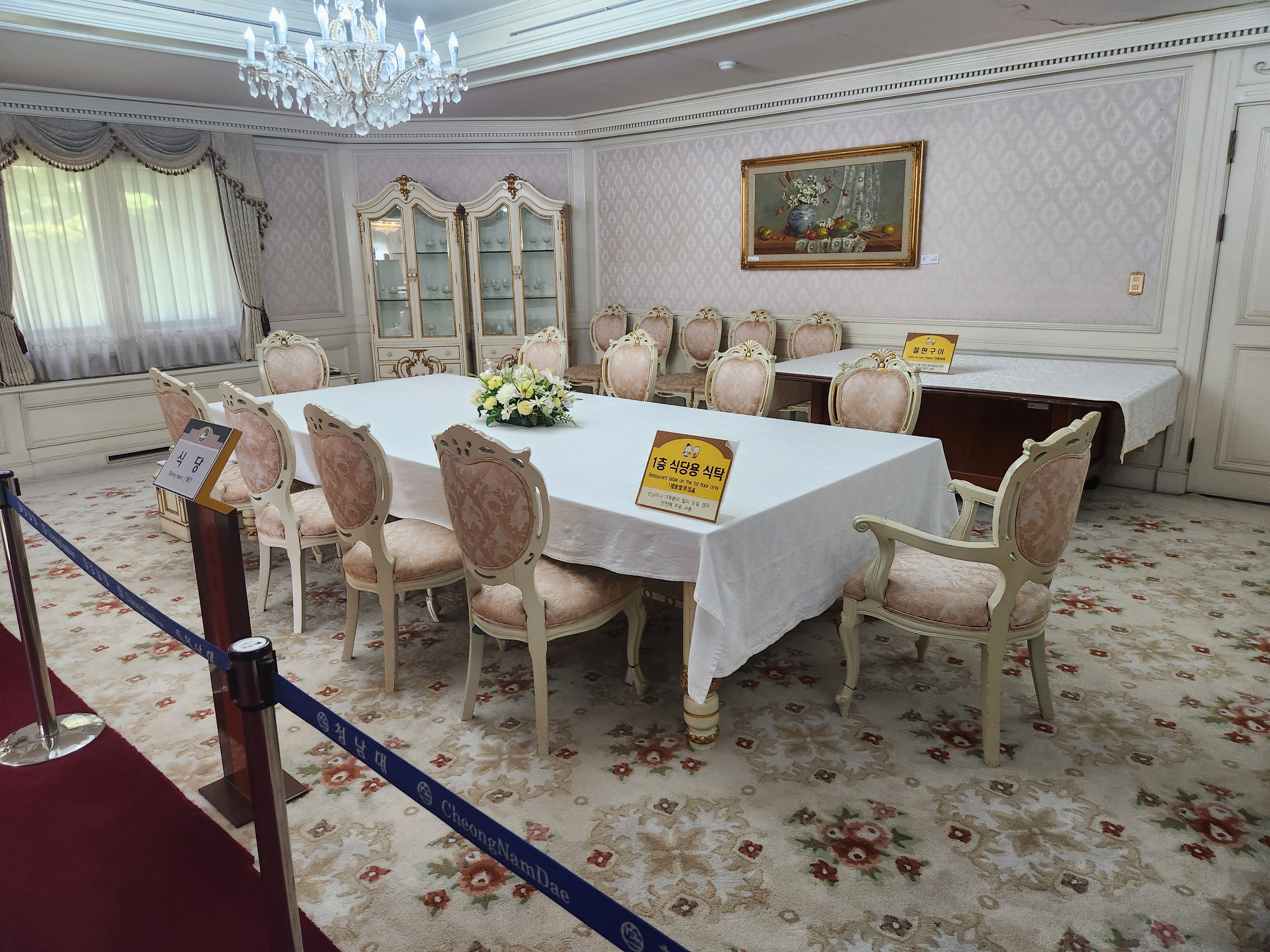 청남대에 도착한 시간은 예정 시간보다 30분 늦게 도착한 오전 11시경이었다. 주차장에는 관광버스와 자가용들로 거의 꽉 들어선 상태였다 매표소에서 표를 구입한 후 청남대기념관을 거쳐 꽃길을 걸어가면 청남대가 나온다. 청남대란 명칭은 남쪽의 청와대란 의미를 담고있다. 청남대 정문을 들어서면 우람한 반송이들이 양옆으로 도열하여 반갑게 맞이해 준다. 청남대 본관 앞에는 근육질로 다져진 키 큰 소나무들이 마치 호위무시처럼 본관을 지키고 있었다. 슬리퍼로 갈아신고 1층으로 들어서면 접견실, 손님침실, 대식당이 자리하고 2층에는 대통령 집무실, 거실이 위치하고 있다.