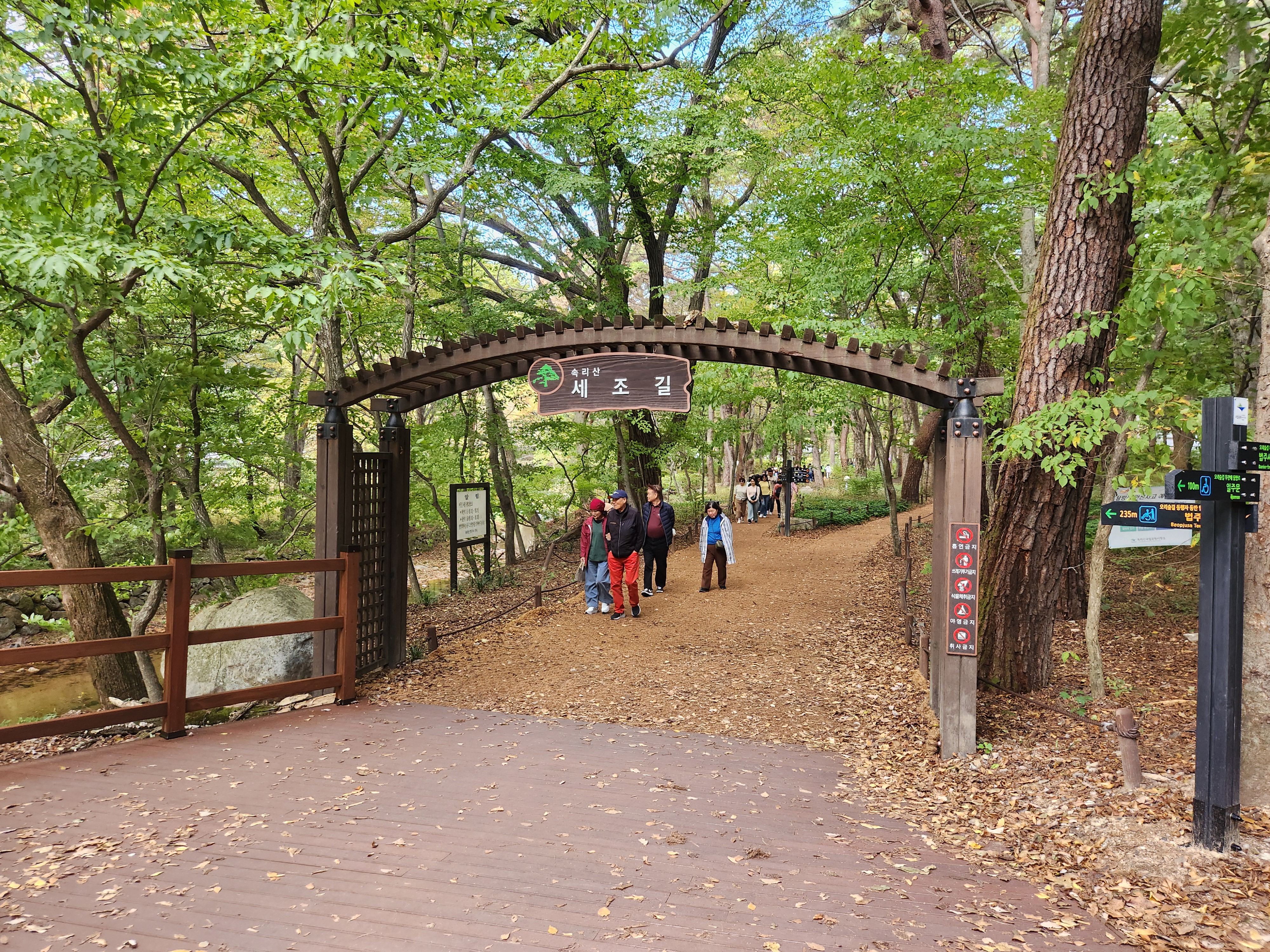 이러한 연유로 세조가 이 소나무에 정이품의 벼슬을 하사하여 정이품송이라는 명칭을 얻었다. 법주사 공영주차장에 도착한 시간은 오후 2시35분경이었다. 공영주차장에서 법주사까지는 약 2,2km이다. 법주사 저잣거리(식당, 카페 등)를 지나면 소나무 숲길이 나온다. 소나무 숲길을 따라가면 무료입장 출입구가 보인다. 이곳을 통과하면 속리산 세조길 자연관찰로로 이어진다.. 마음을 비우고 사색하기에 좋은 길이다. 일주문(호서 제일 가람)을 통과하면 두 갈레길로 갈라진다. 벽암대사비 부근에서 여성 해설사를 만나 초면 인사를 나누었다. 약속된 시간 보다 1시간이 늦은 시간이었다.